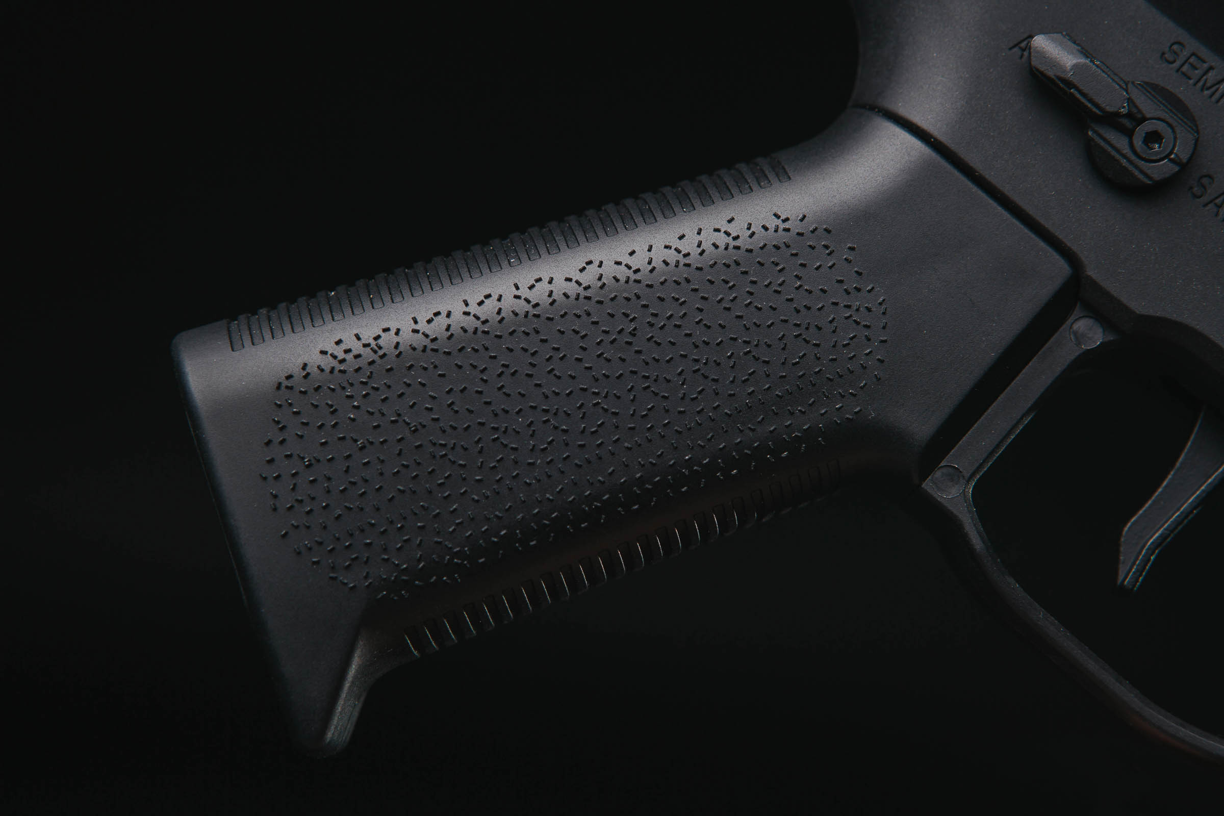The pistol grip has no additional finger support. Both its front and read surfaces are grooved, and the side surfaces are covered with something similar to stippling but texture is given in during the injection process, and not during subsequent stages of production. The bottom plate is made of metal (ZnAl) and has a large screw to adjust the position of the motor with a head for a flat screwdriver.