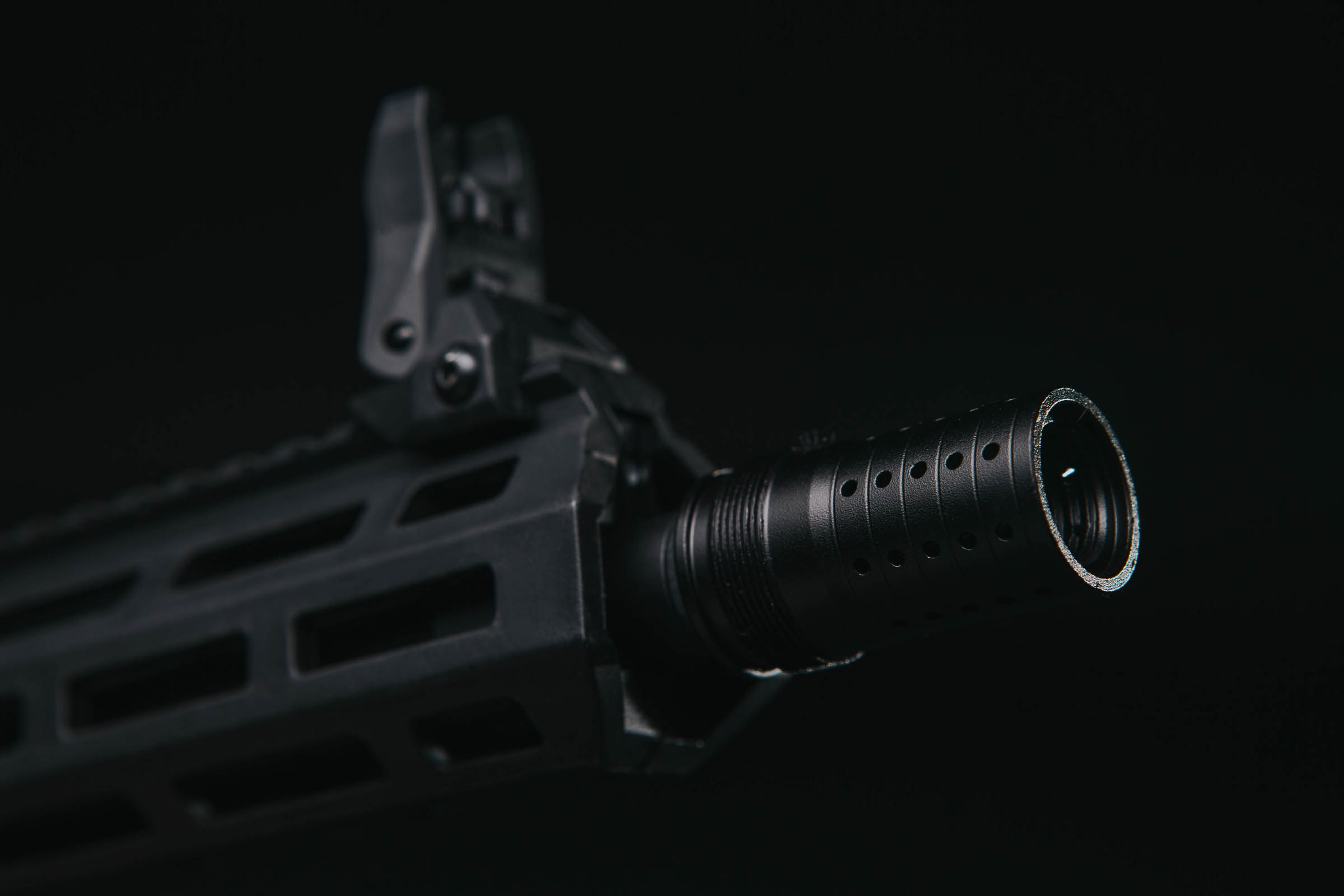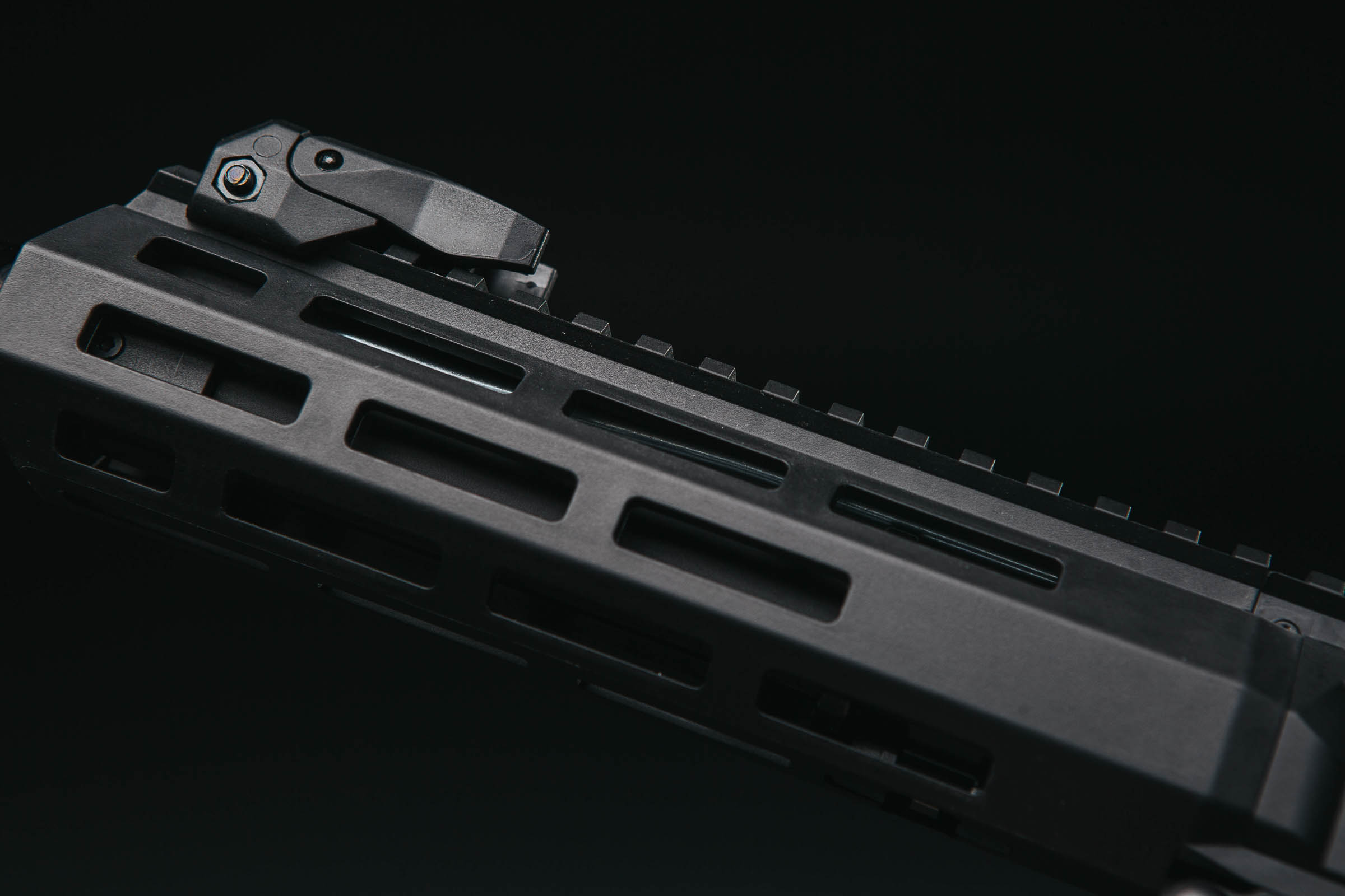 The Honey Badger is equipped with detachable and folding nylon sights. The front sight can be adjusted vertically and the rear sight horizontally. The rear sight aperture has two standard settings - the "night" one with a large opening and the precise one with a smaller hole. Both sights are lifted and folded by hand and have no slack in both positions.