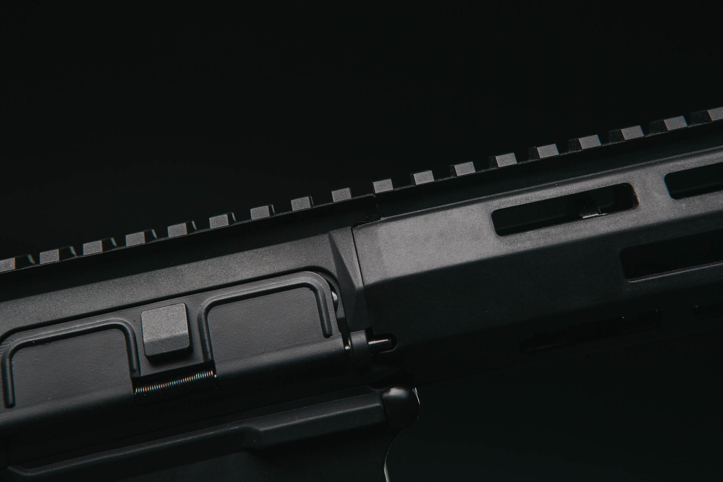 The first thing is the stabilizing pin. A hole is made in the upper receiver, just below the upper Picatinny rail, into which a stabilizing pin placed in the rear part of the handguard is inserted. Thanks to it, both sections of the top rail (on the upper receiver and on the handguard) match perfectly. In addition, the pin is one of the parts that prevents the handguard from rotating around the barrel.