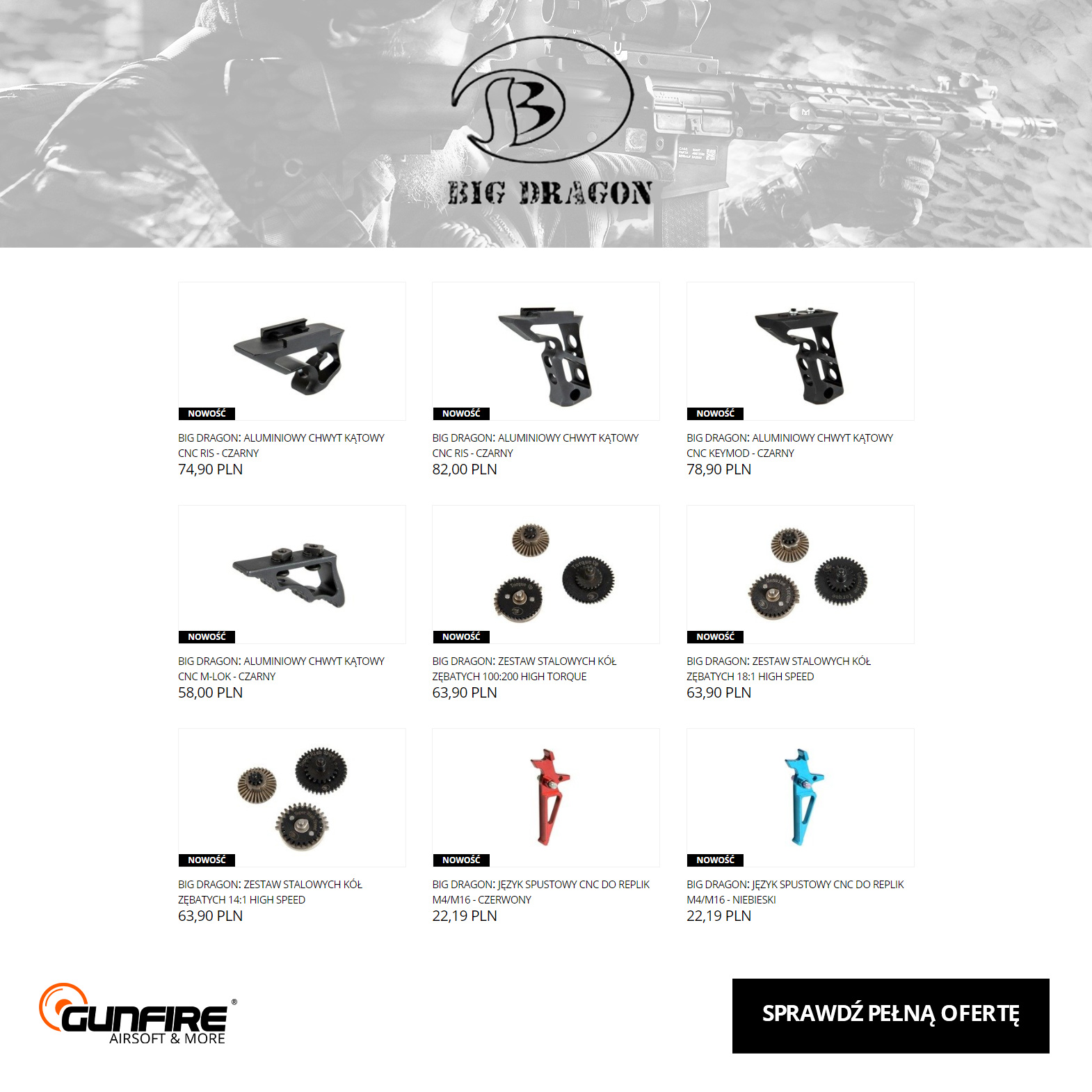 Replicas parts are always welcomed and Big Dragon is another new brand whose products you will find at Gunfire. Big Dragon's offer includes both tuning parts, including springs, gears, motors and aluminum hop-up chambers, as well as external accessories such as CNC tactical grips.