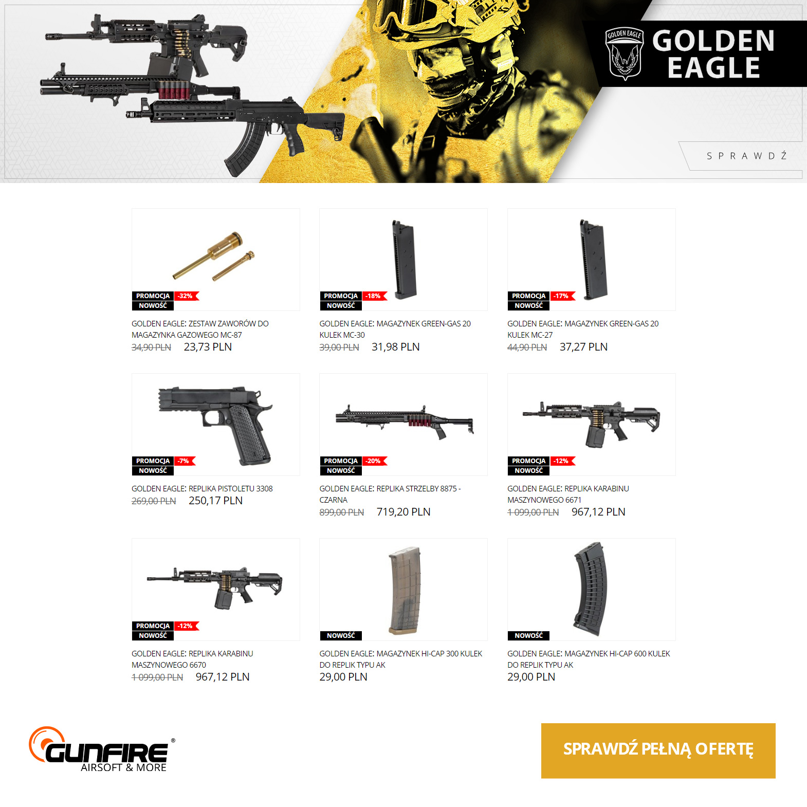 We have just supplemented the inventory with Golden Eagle replicas. The delivery includes LMGs, green gas powered tactical shotguns and sniper rifles.