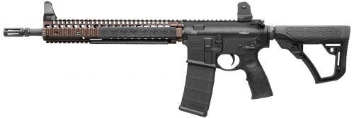 The second AR-15 is a Daniel Defense M4 V1 with a Leupold Mark 4 High Accuracy Multi-Range Riflescope (HAMR), a Delta-Pro mini collimator, a Gemtech Halo silencer and a tactical flashlight, probably a Surefire M952.