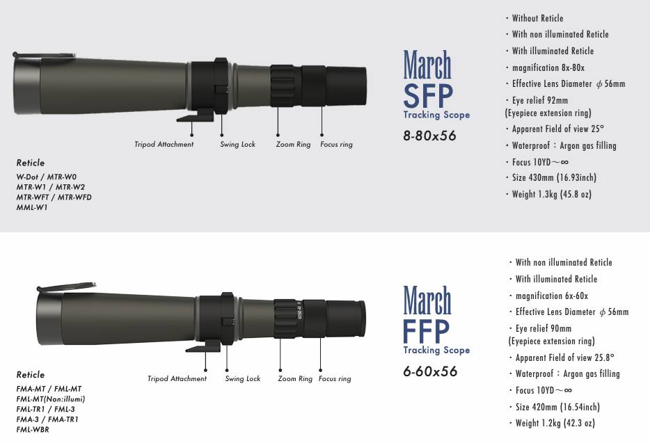 Produkt March Tracking Scope ma być dostępny w kilku wariantach, m.in. 6-60x56 oraz 8-80x56, z siatką celowniczą w pierwszym lub drugim planie optycznym. W zależności od preferencji nabywcy dostępne będą różne siatki odpowiadające tym z lunet celowniczych March. Do sprzedaży trafi także wersja pozbawiona siatki celowniczej.