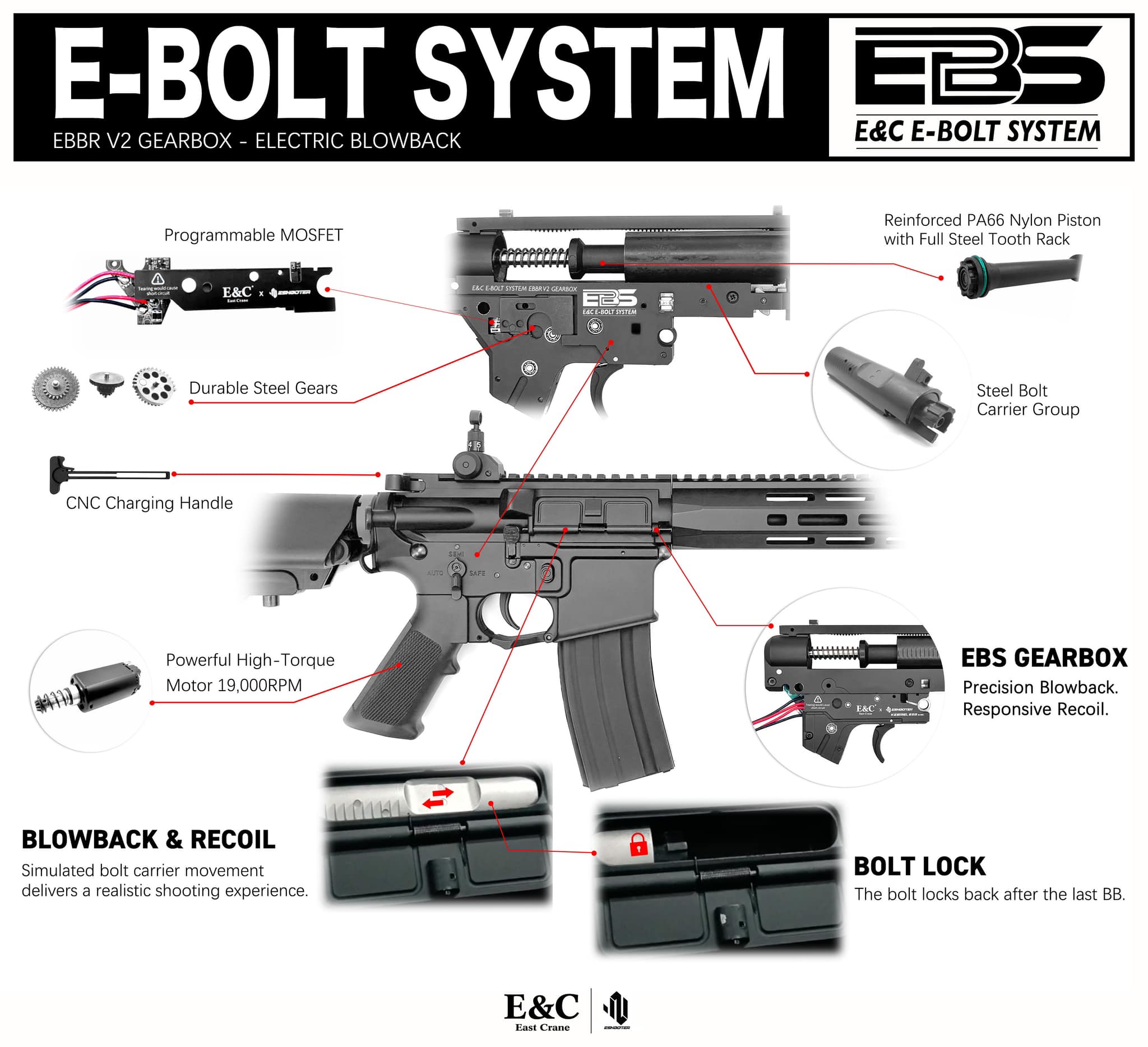 Marka East Crane (znana też pod skrótem E&C) zaprezentowała ostatnio swoją najnowszą propozycję dla graczy. Tym razem nie jest to żadna nowa replika a kompletnie nowy system zasilania replik elektrycznych, charakteryzujący się bardzo dużym podobieństwem do replik gazowych, a nawet działania broni palnej. System E-Bolt/EBS ma oferować realistyczną pracę zamka, który nie jest w formie małej blaszki a odwzorowanego całego zespołu zamka, w dodatku ze stali.