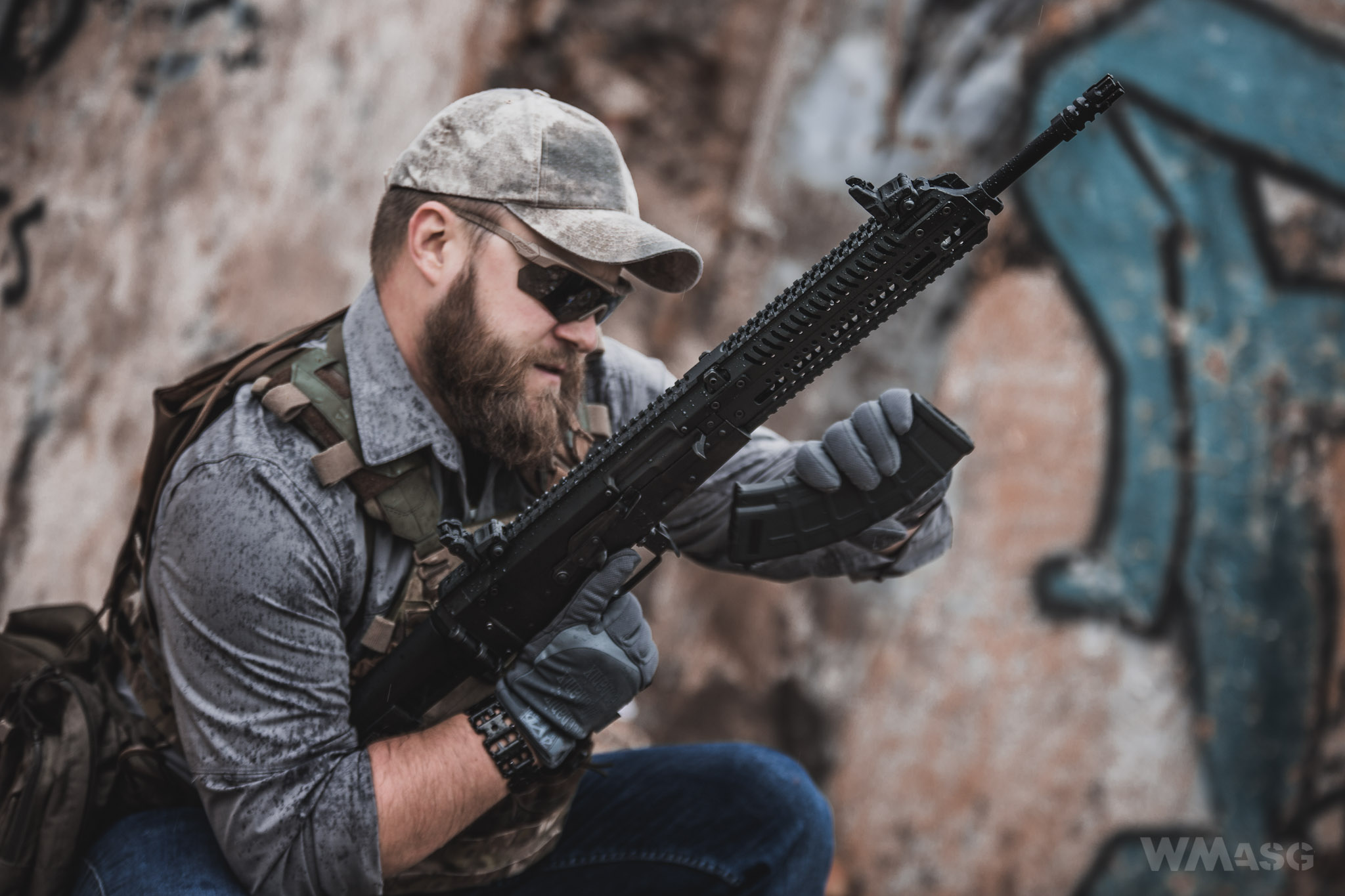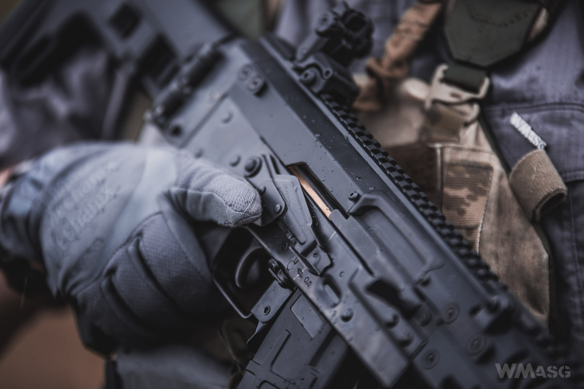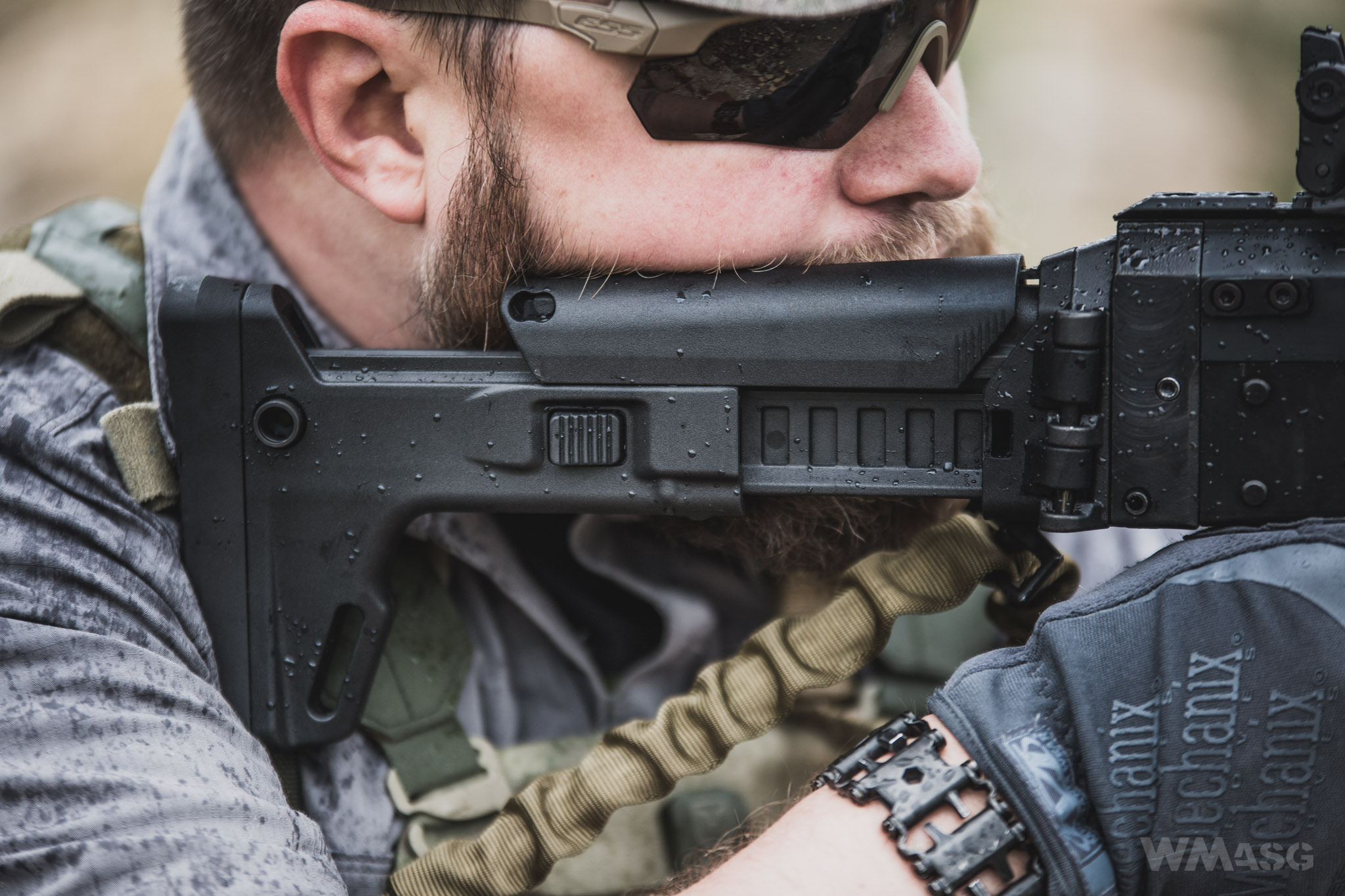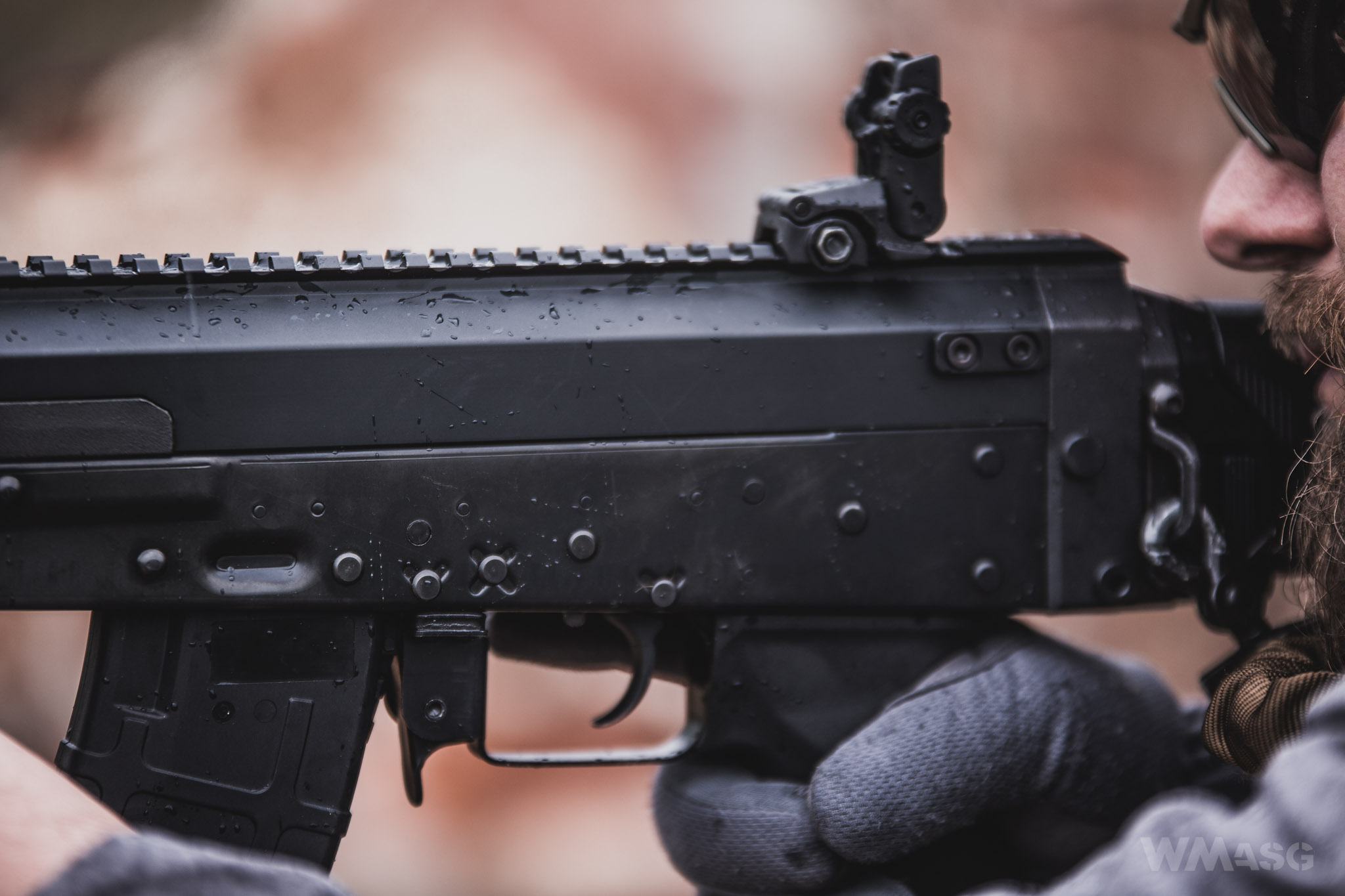 The replica makes a pretty good impression. Design nods to the Masada (currently known as the ACR) can be seen at at first glance. The manufacturer himself states that the inspiration for the carbine was to combine the reliability of the AK with the ergonomics of the AR-15. The weight of the replica is 3666g (3839g with the magazine), thanks to which we feel that we are holding a well made piece of metal in our hands. Everything is very well put together, we have not seen any major slack.