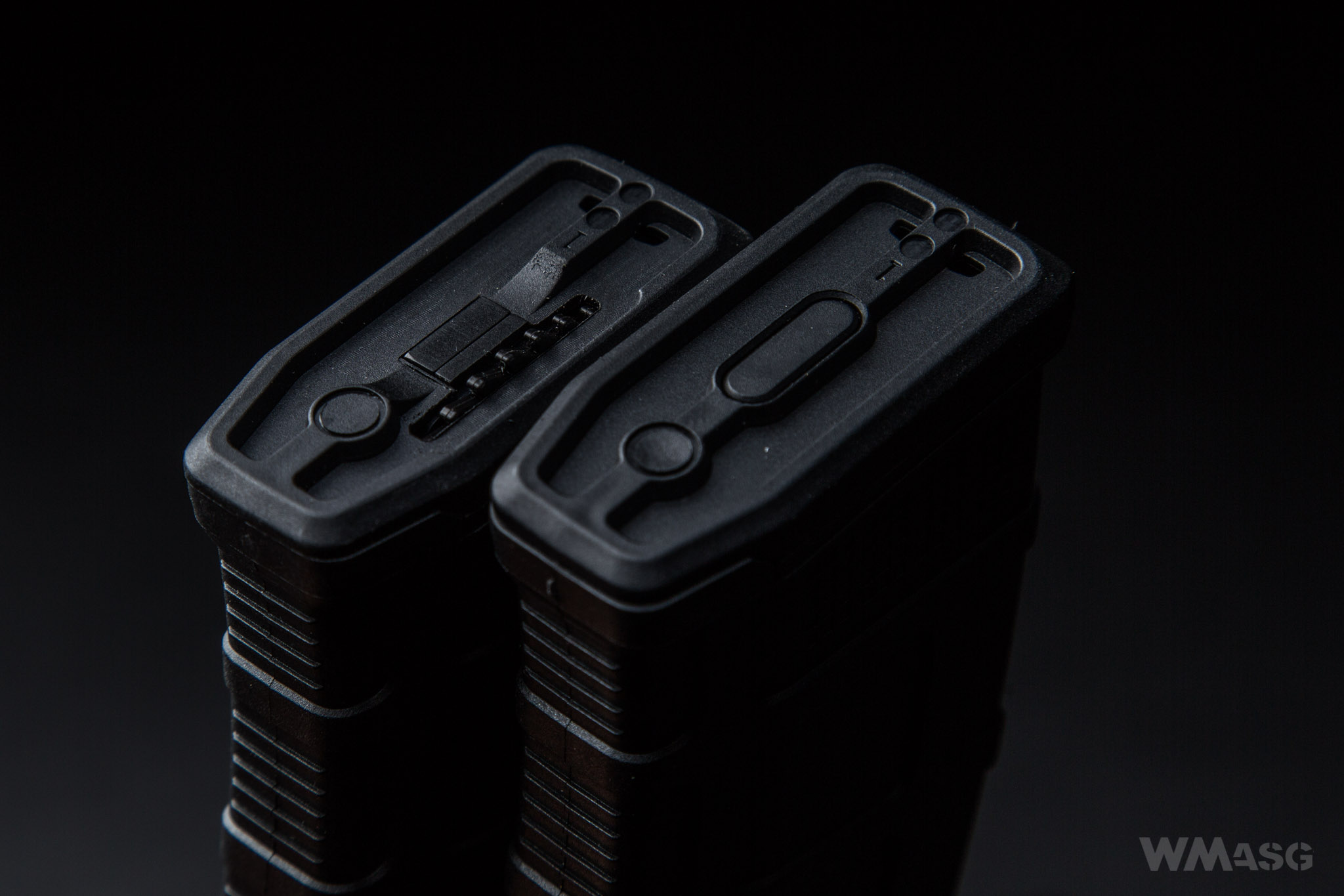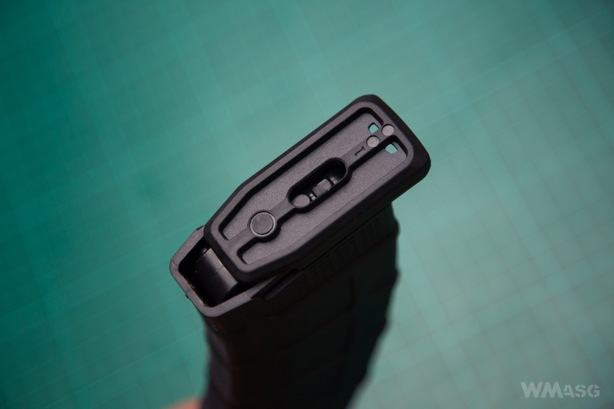 It is rare for two magazines to be delivered with a replica, even more so if they are two different ones. Yet this is the case with this replica. Moreover, one of them has two modes: a mid-cap and a real-cap mode, which means that at the beginning we have access to every kind of magazine available on the market. Both magazines are copies of well-known P-mag AK magazines by MAGPUL. One of the magazines is a traditional hi-cap with the wounding wheel at the bottom, the other has a very interesting option of changing its capacity from 130 to 30 BBs. Changing the capacity is done very quickly: just dismantle the bottom plate by pressing a button at the bottom of the magazine. Then we slide the bottom plate back and we are able to pull out the BBs feeding mechanism, and there, on the side, is the magazine capacity switch. Access to the loading spring disassembly system is also located there. Thanks to it, we can quickly and easily clean the magazine without its complete disassembly.