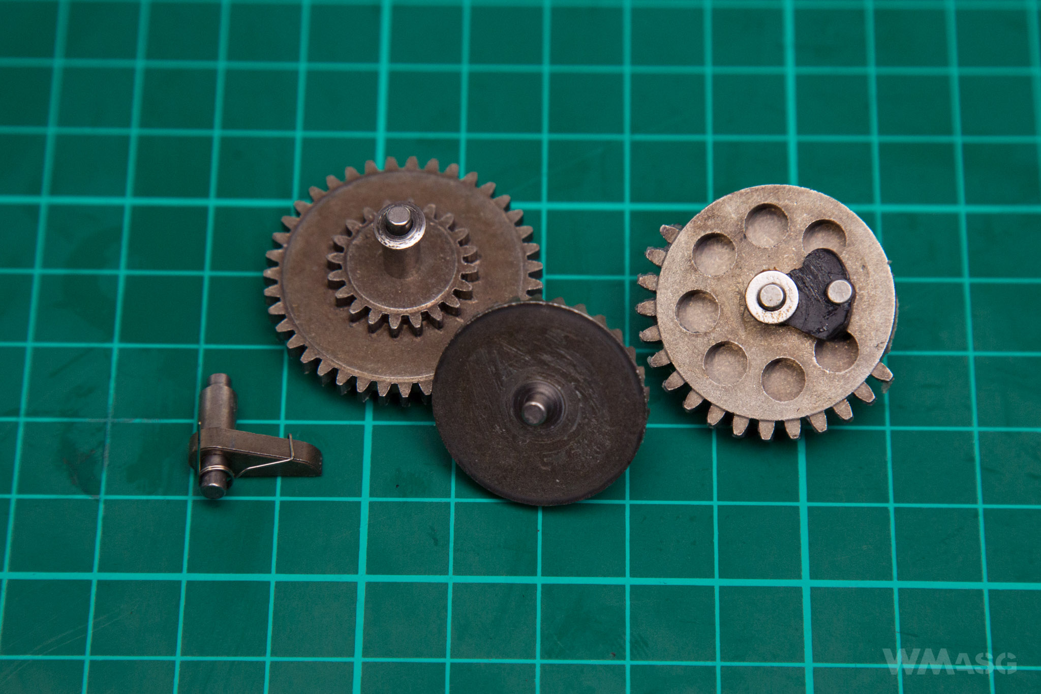 The replica uses a modified V3 gearbox. It has reinforcements in places where cracks occur most frequently and is beveled in places where right angles usually are, which serve to evenly distribute pressure at the front of the gearbox and reduce the likelihood of it cracking. The gearbox has the ability to quickly replace the spring, unfortunately, to use it, we will have to pull it out of the body, and for this we need to do it in workshop conditions. The frame, made using Zinc Die-Casting technology, is taken apart by pulling out the plastic cover of the bevel gear located near the trigger and the steel, shortened top plate, and then unscrewing 5 Philips screws.