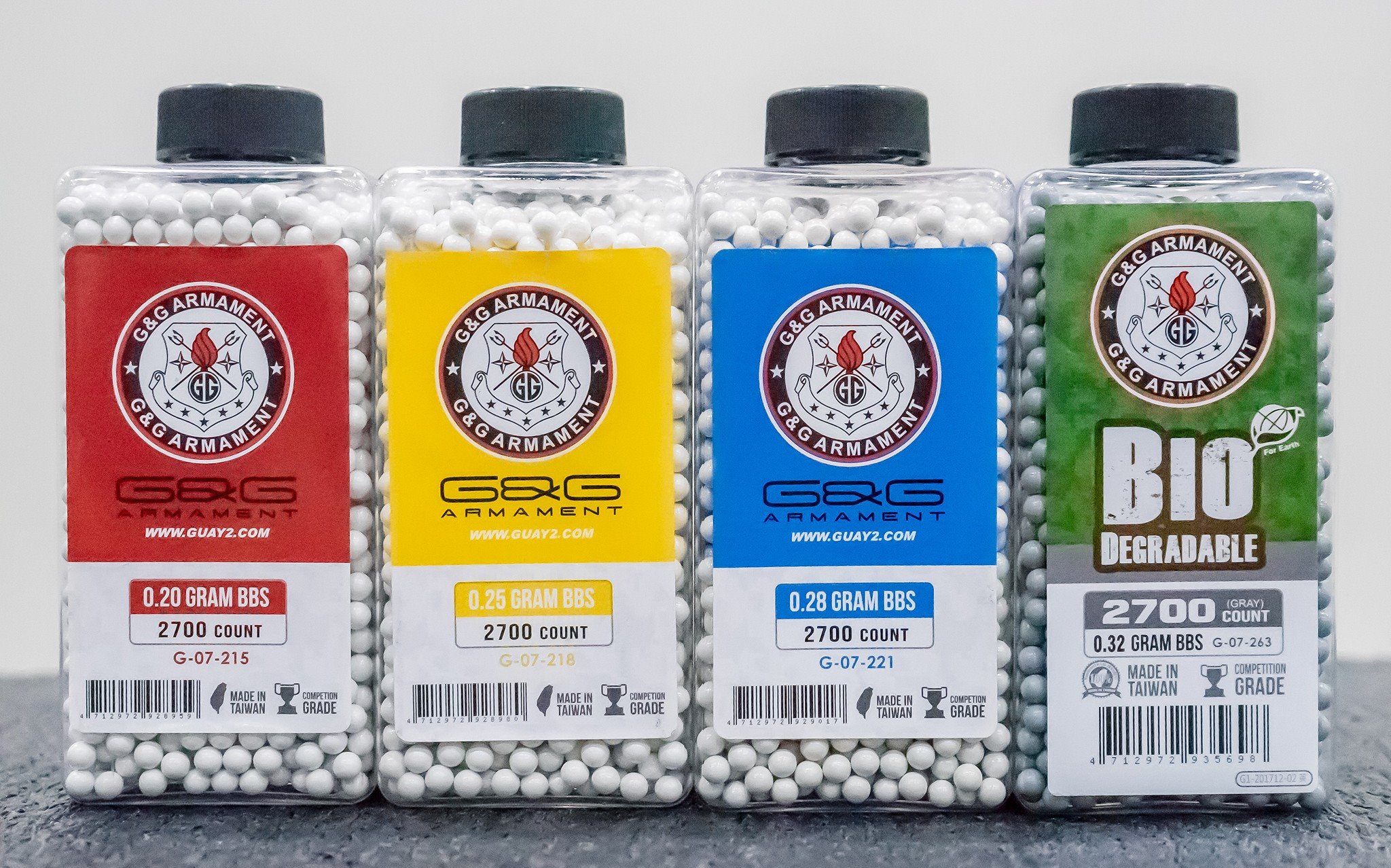 Od teraz producent posiada w ofercie także kulki biodegradowalne, o wadze 0,32 grama. Jak można zauważyć na zdjęciu, ich odcień jest nieco bardziej szarawy niż pozostałych kulek z fabryki G&G. Amunicję w ilości 2700 sztuk otrzymujemy w plastikowej butelce.