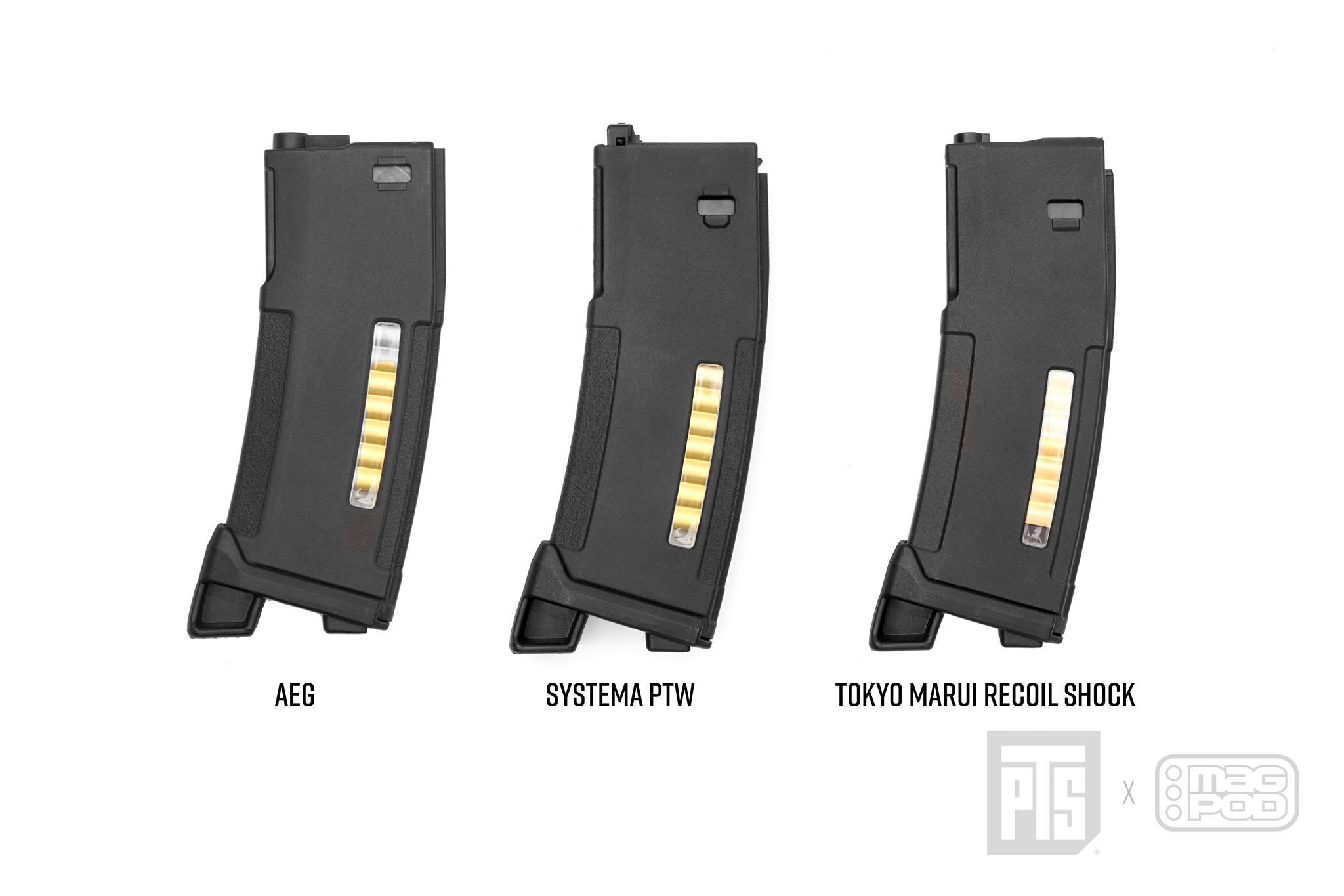 Magazynki te są typu mid-cap i posiadają możliwość regulacji swojej pojemności między 30, a 120 kulkami. Ich skorupy zostały wykonane z wytrzymałego tworzywa sztucznego o nazwie Zytel od DuPont. Dodatkowym smaczkiem w magazynkach do replik AEG jest wskaźnik pełnego załadowania kulkami, który ułatwia uniknięcie uszkodzeń związanych z przeładowaniem konstrukcji.