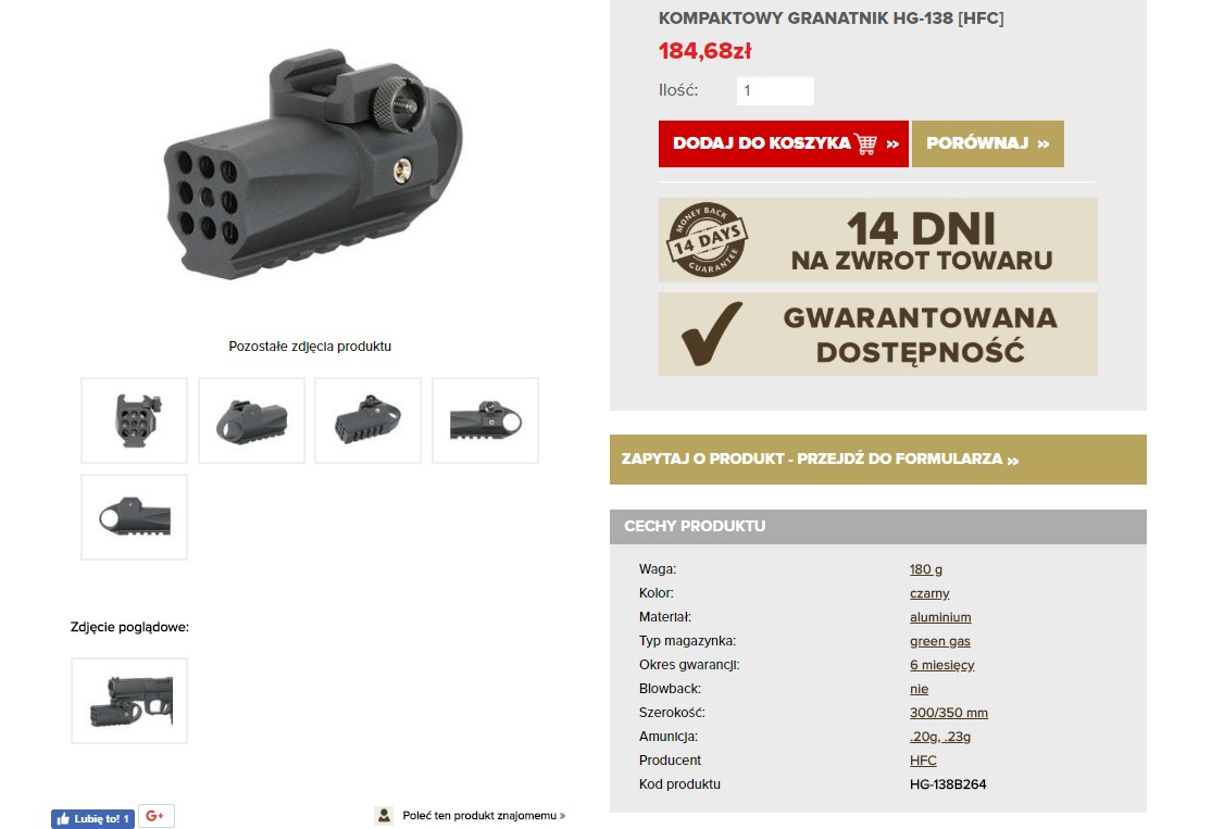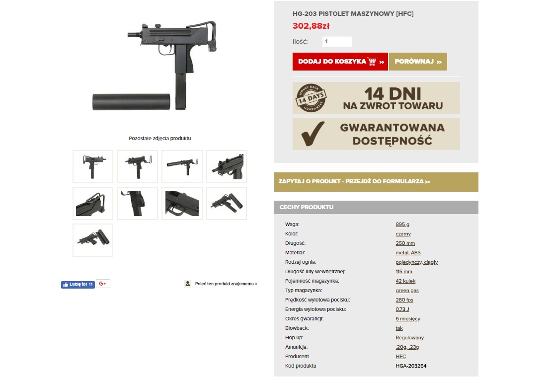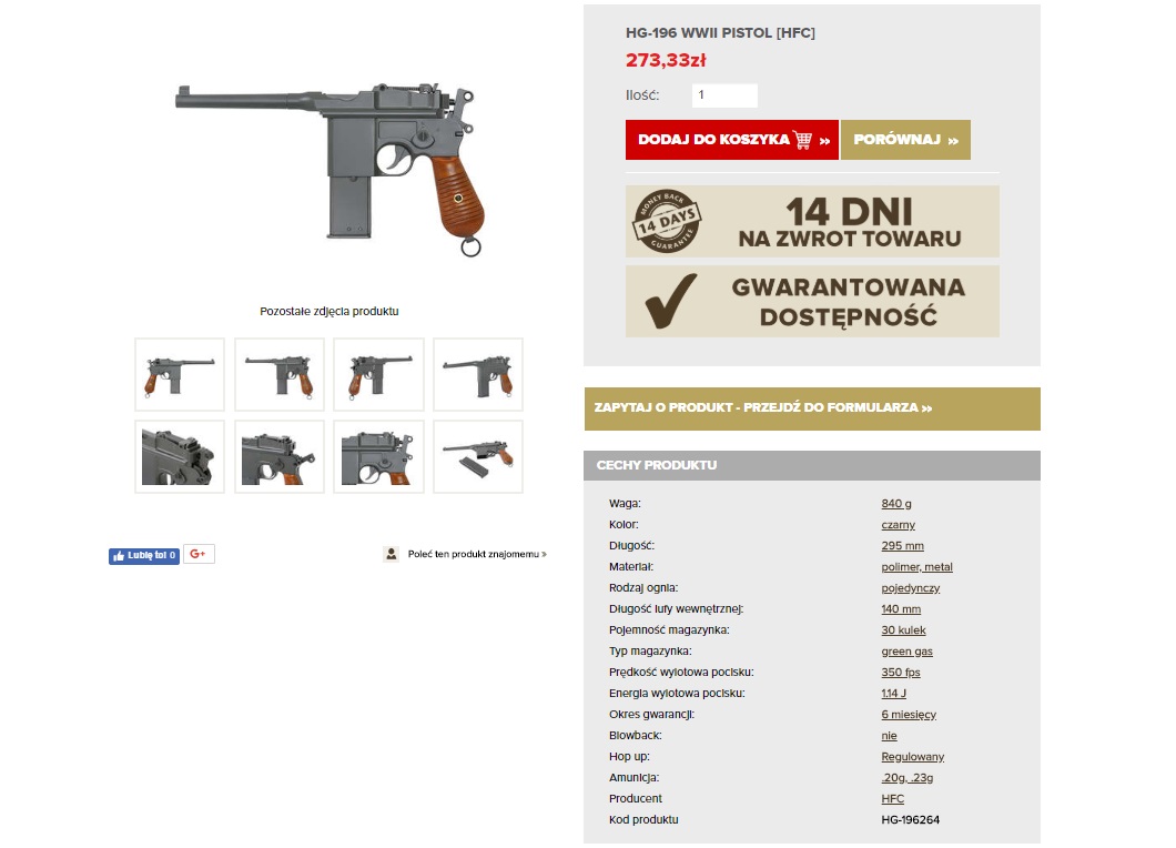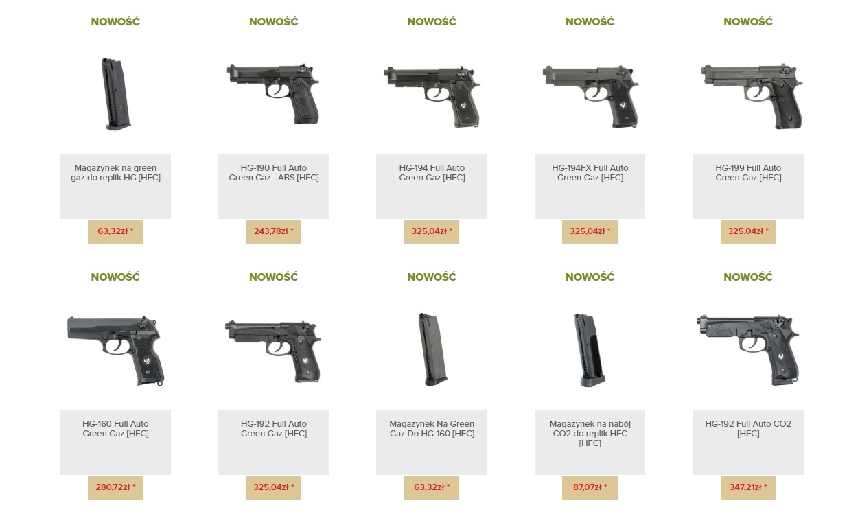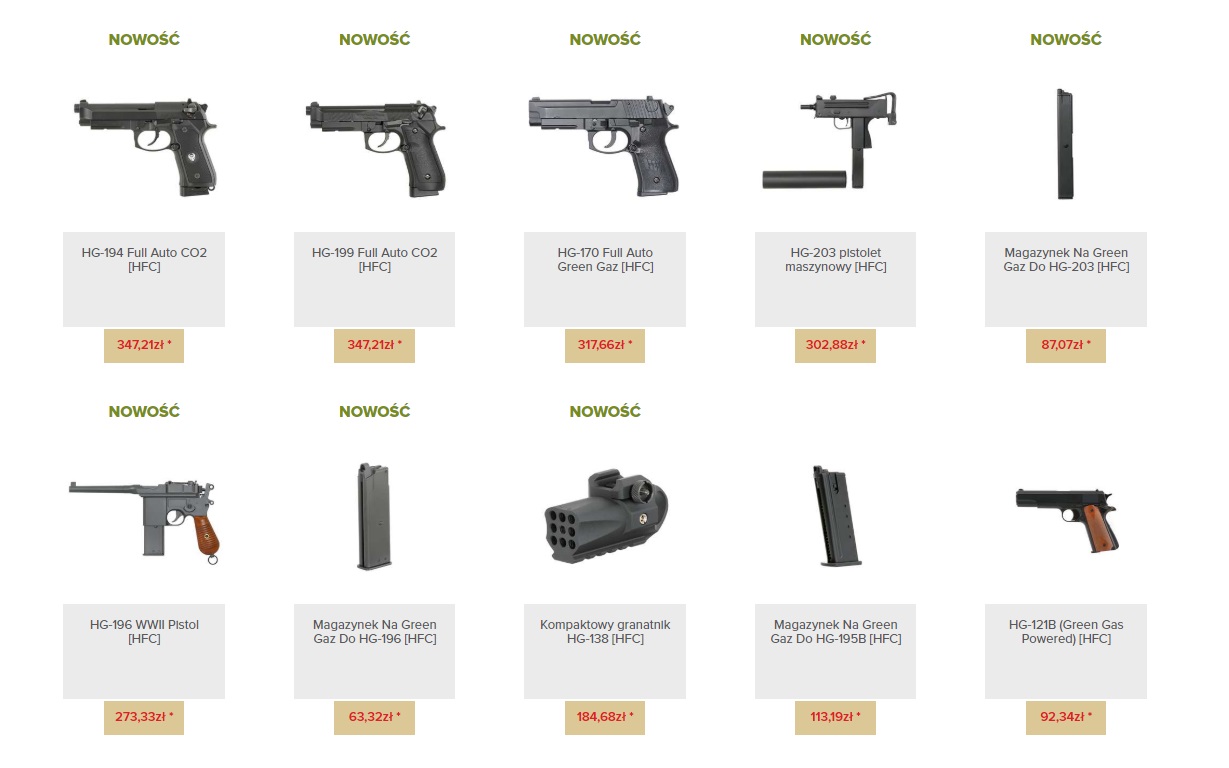 Oferta zawiera między innymi takie przedmioty, jak pistolety Beretta i kompaktowy granatnik. Znajdziemy w niej również repliki MAC-11 − czyli jednego z najbardziej popularnych w popkulturze pistoletów maszynowych, oraz prawdziwego klasyka pamiętającego czasy I Wojny Światowej, czyli Mausera C96. Wszystkie te repliki posiadają zasilnie gazowe. Każdy z oferowanych modeli posiada tryb full auto.