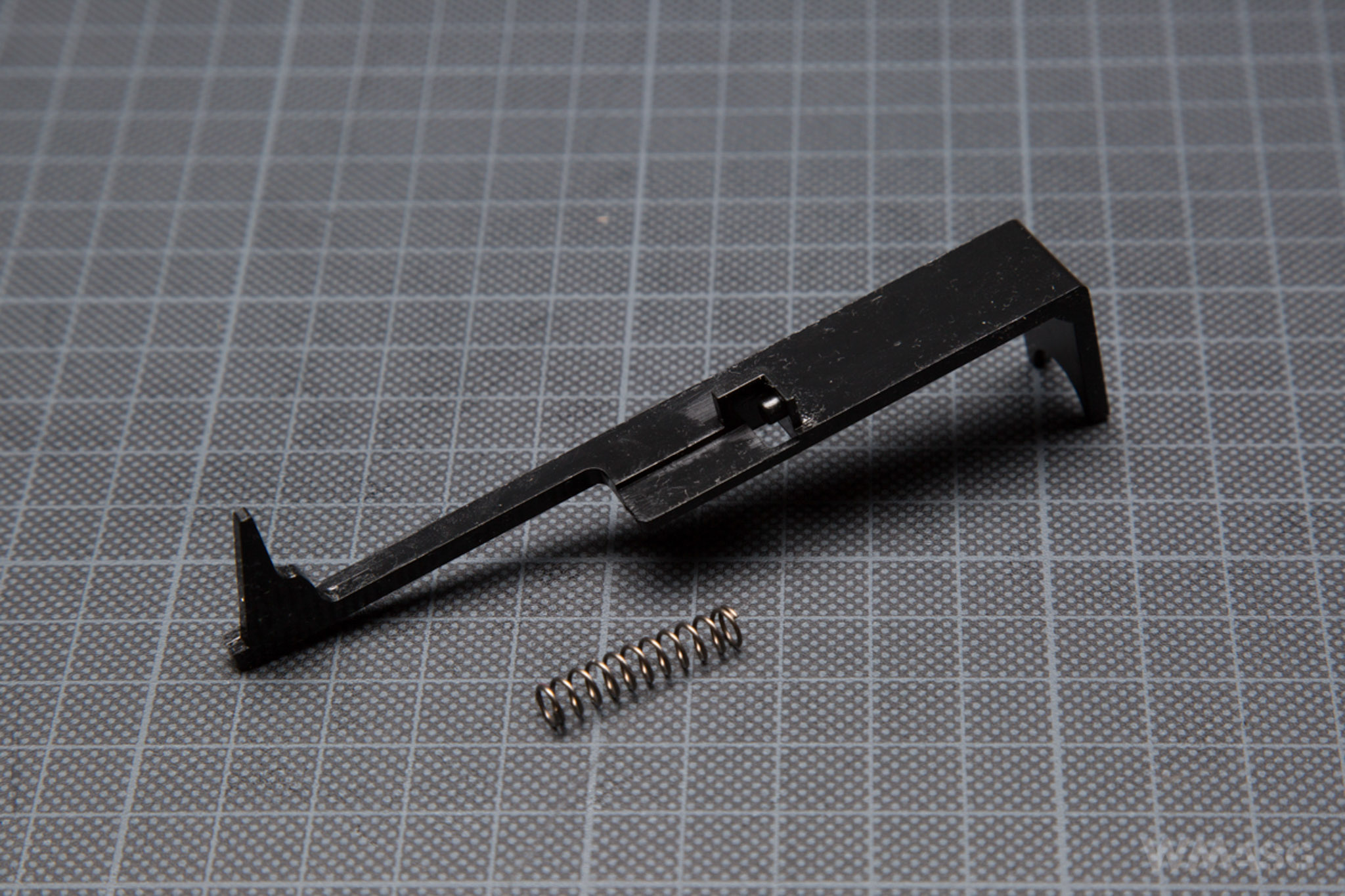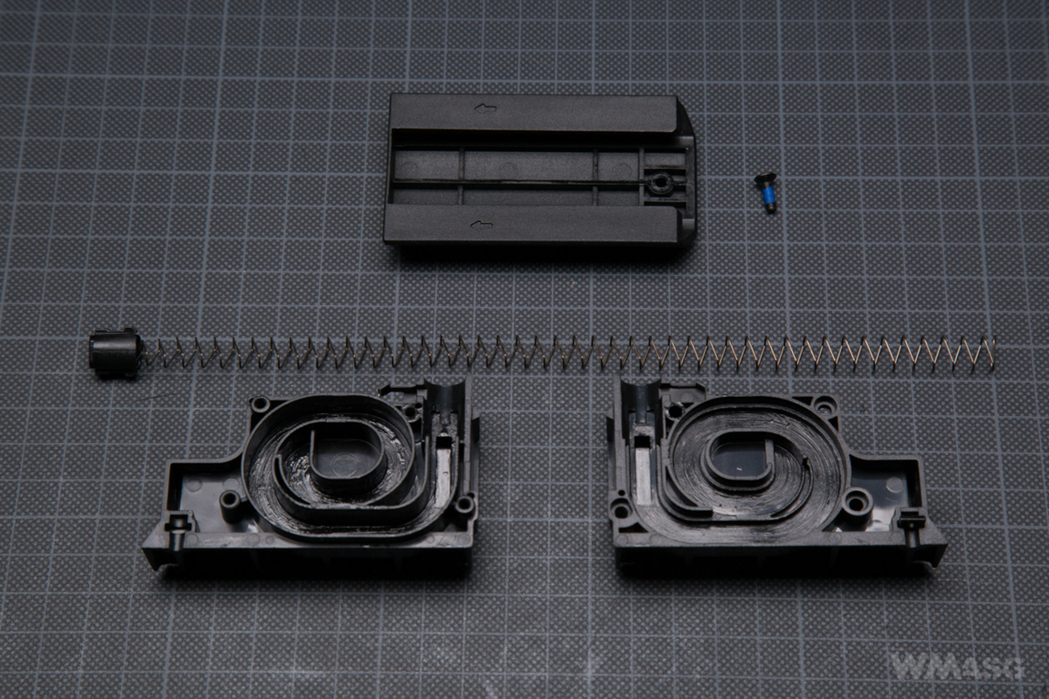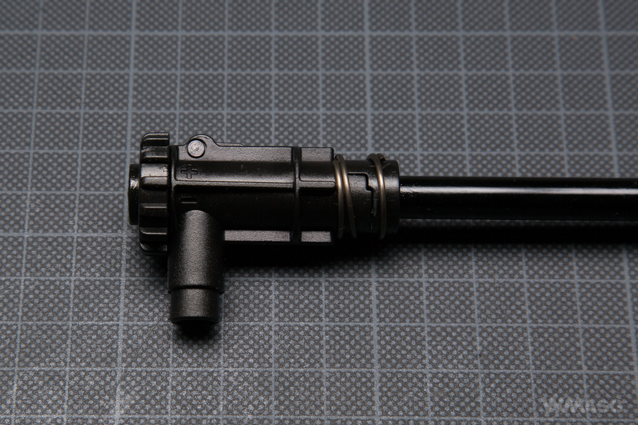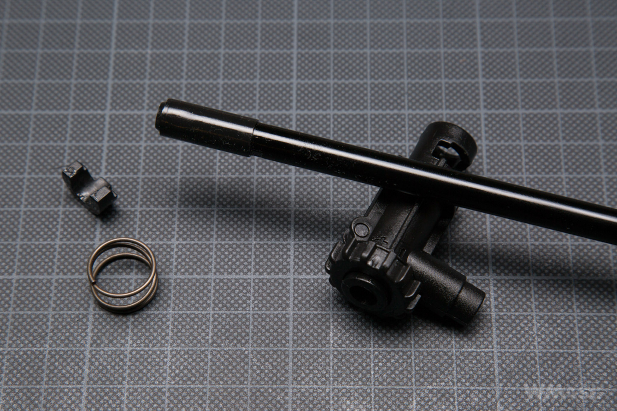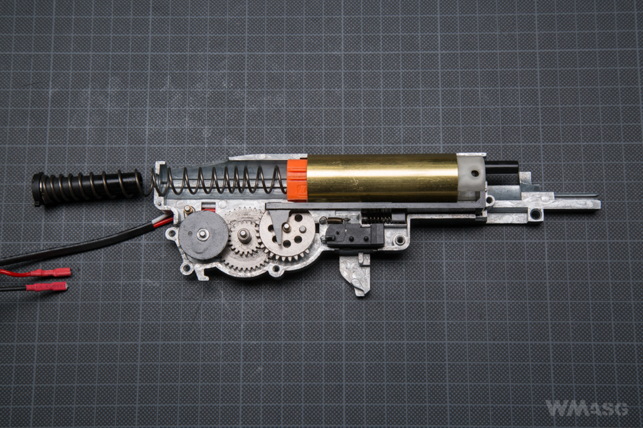 The spring is non-linear and according to the specification is an M120 type. The guide is made of plastic, has no bearing and is of the V2 gearbox standard. It is externally stabilized with a screw.
