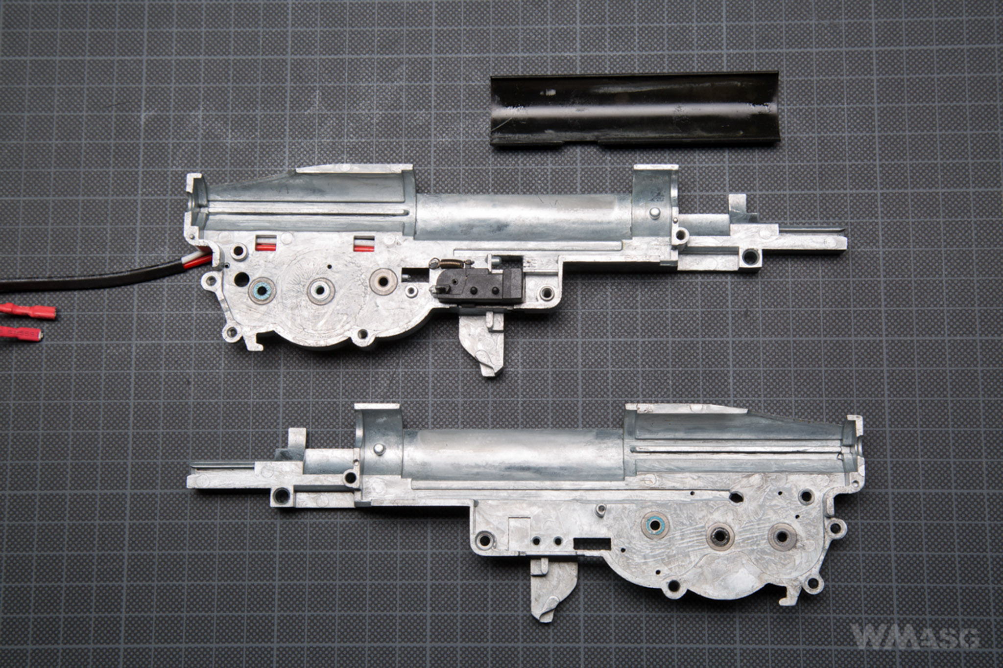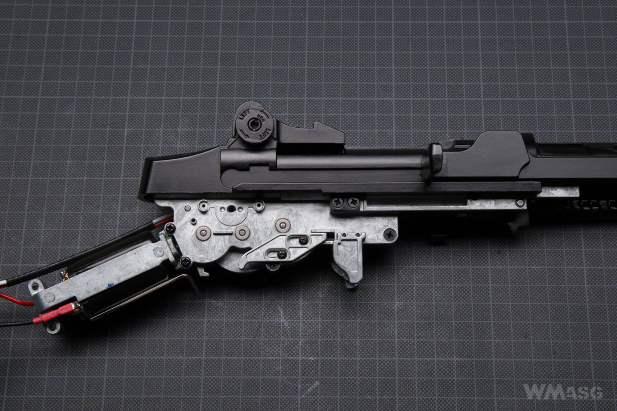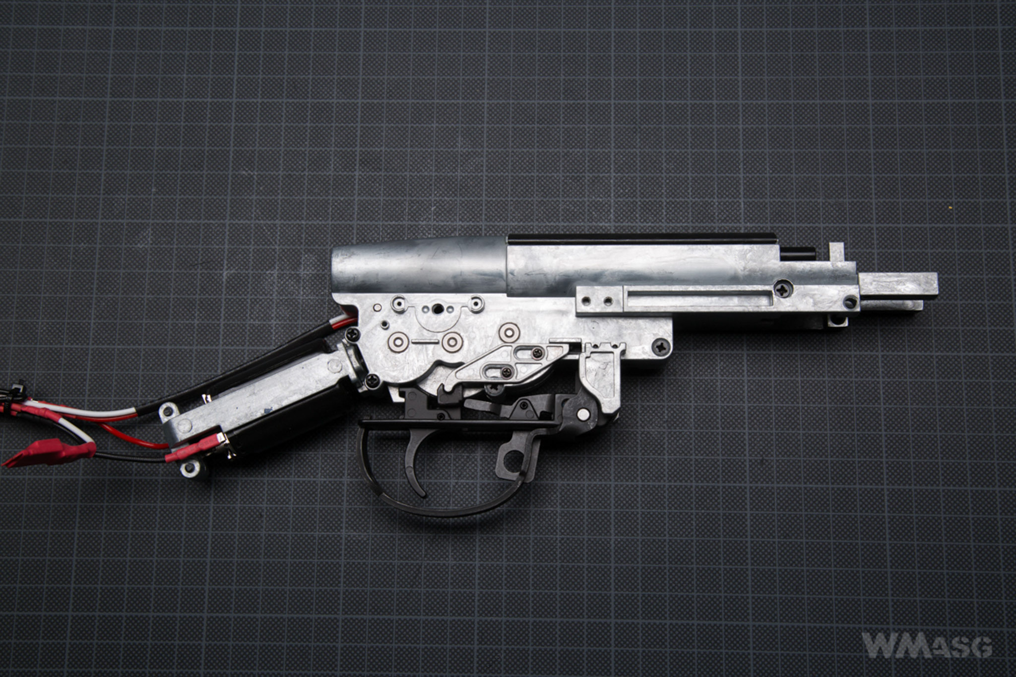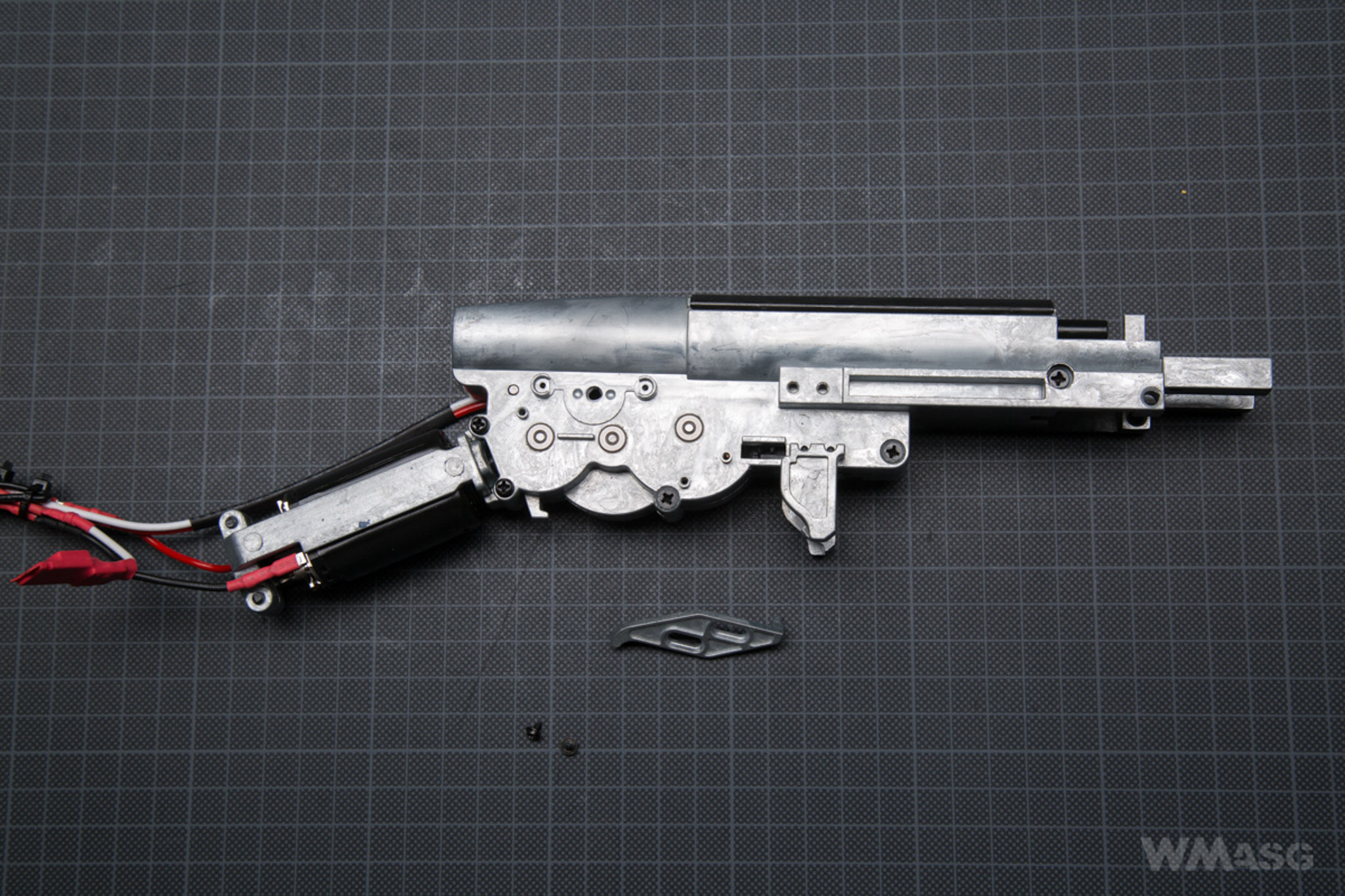 After unscrewing the last 3 screws holding receiver with the gearbox (2 on the right, 1 on the left) and we can the removed gearbox (the picture below shows it with a disassemble trigger plate).