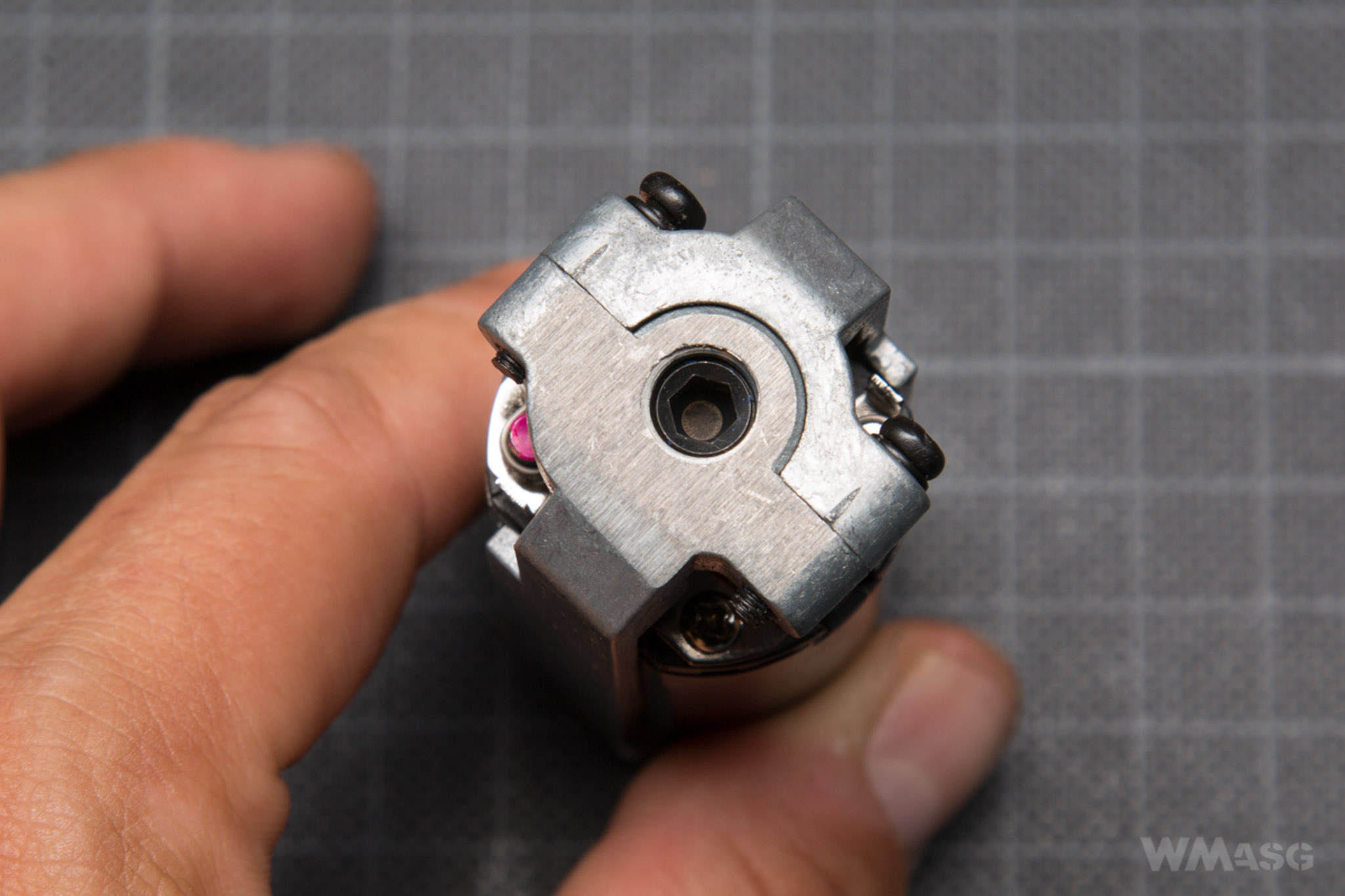 Access to the Hop-Up adjustment is obtained by pulling the dummy bolt back. Theoretically, for ease of use, it can be locked in the rear position by pushing the upper part of the bolt catch. It's just that it simultaneously serves as the magazine release. That is, by locking the bolt in the rear position, at the same time the magazine drops out. Nice isn’t it? Of course, it is possible to adjust the Hop-Up this way - you have to (for right-handed shooters) hold the rifle from the bottom, putting your hand on the magazine, pressing the bolt catch with your thumb to lock the bolt. For me, after many attempts, another method proved more convenient. I do not touch the bolt catch. With my right hand, I pull back and hold the bolt in the rear position, and adjust the Hop-Up with the thumb of my left hand, which holds the rifle from the bottom.