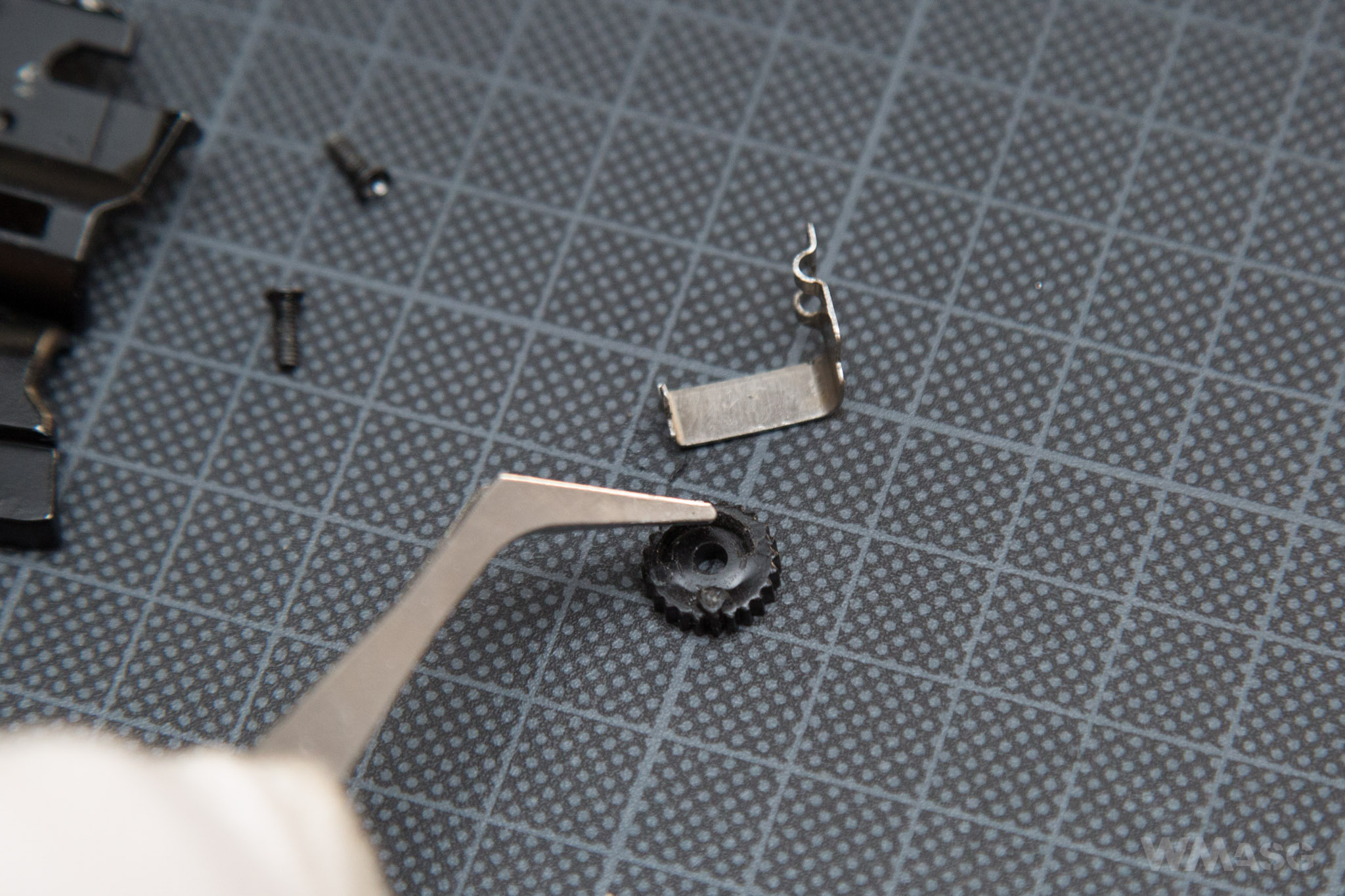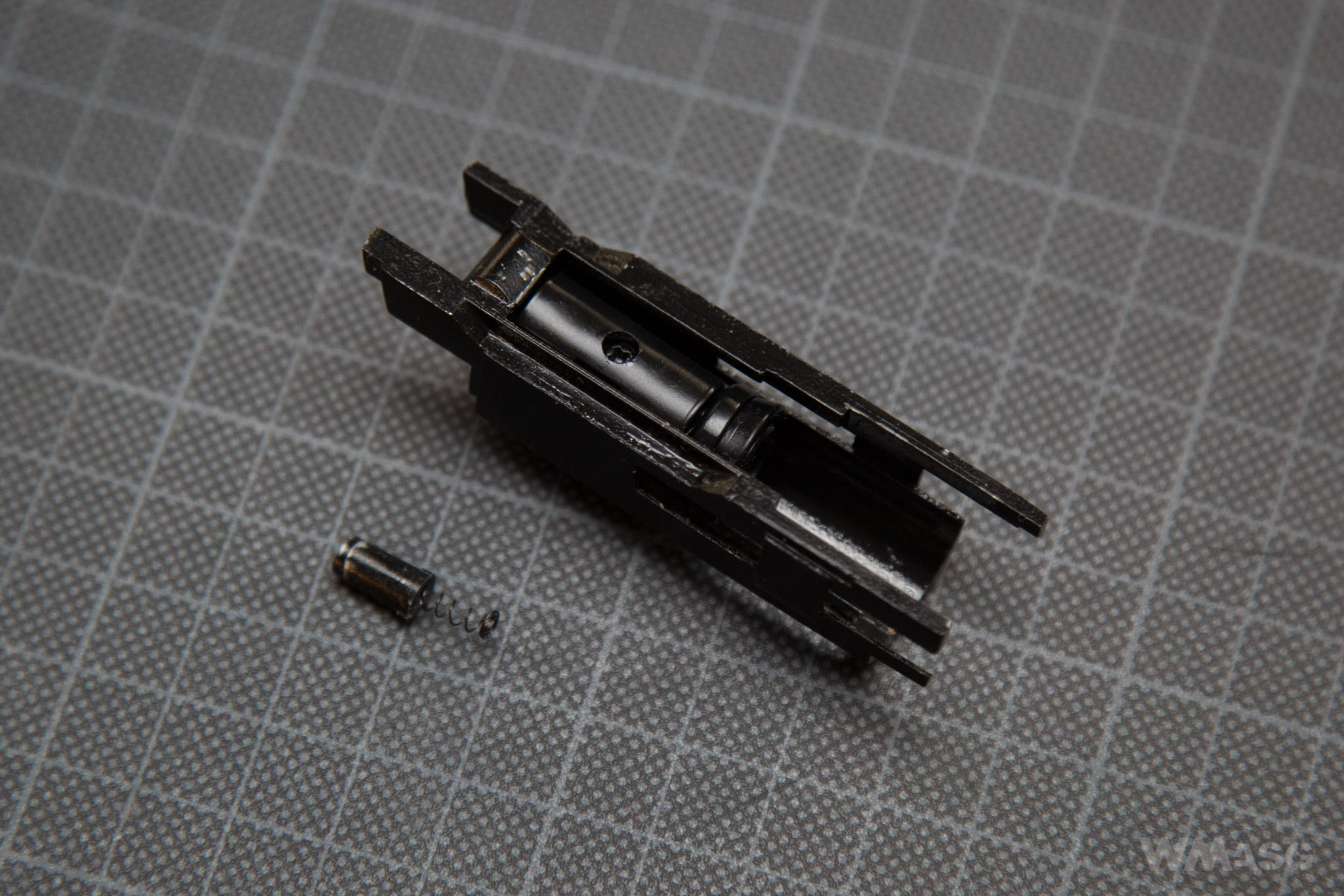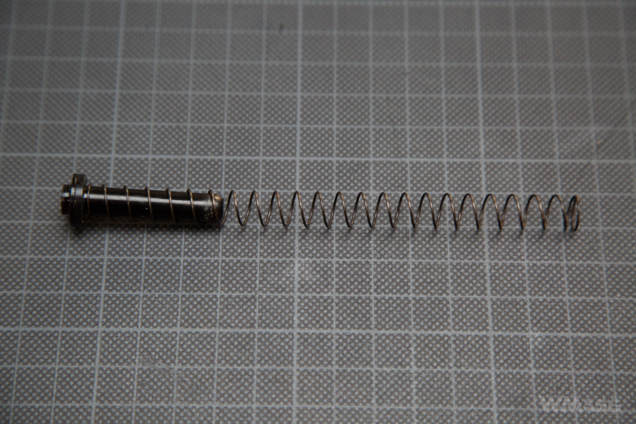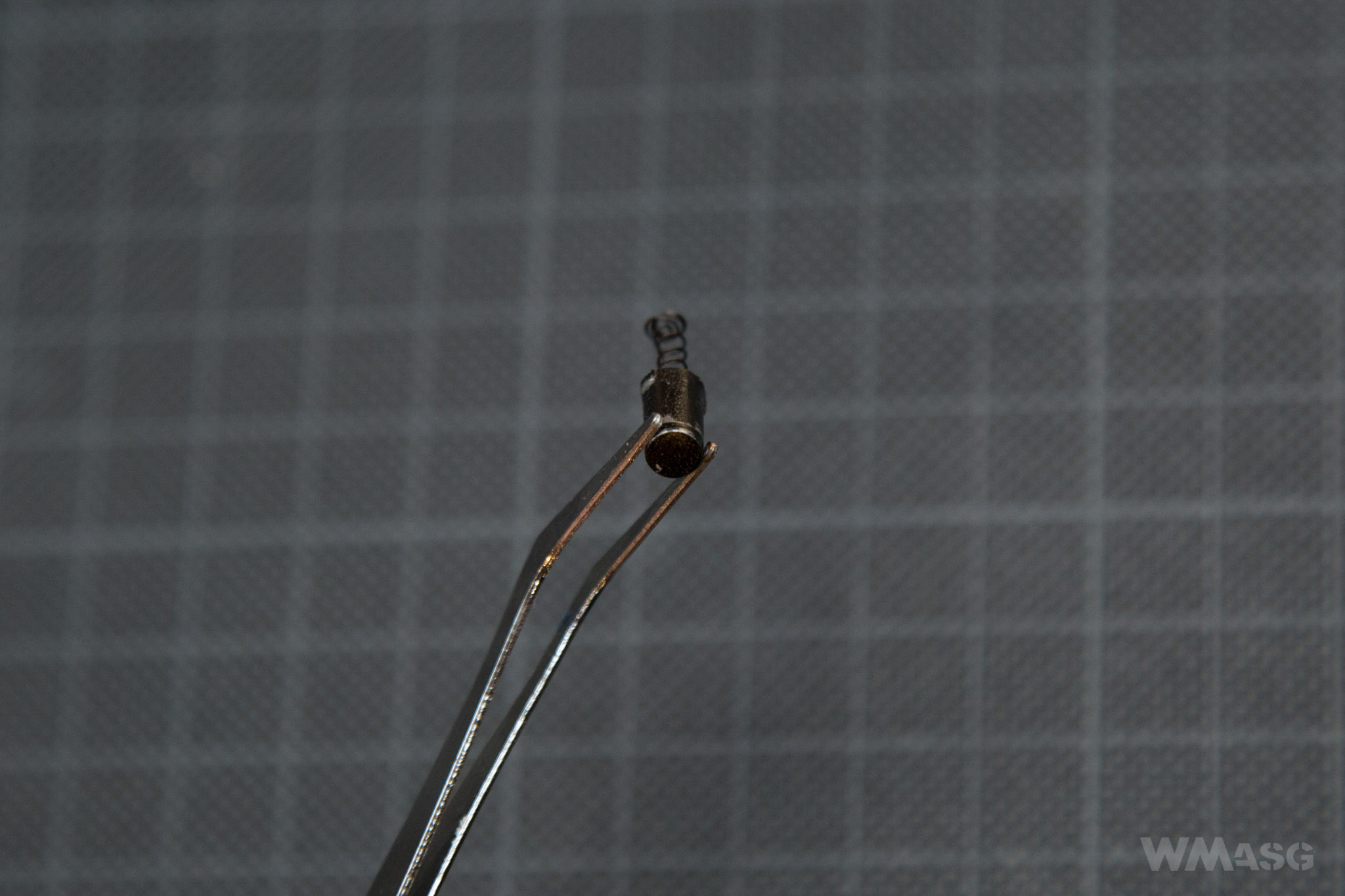 It may be necessary to further disassemble the replica for cleaning or maintenance. We start by moving the guide that leads the springs towards the end of the barrel and remove it from the pin on which it resides.