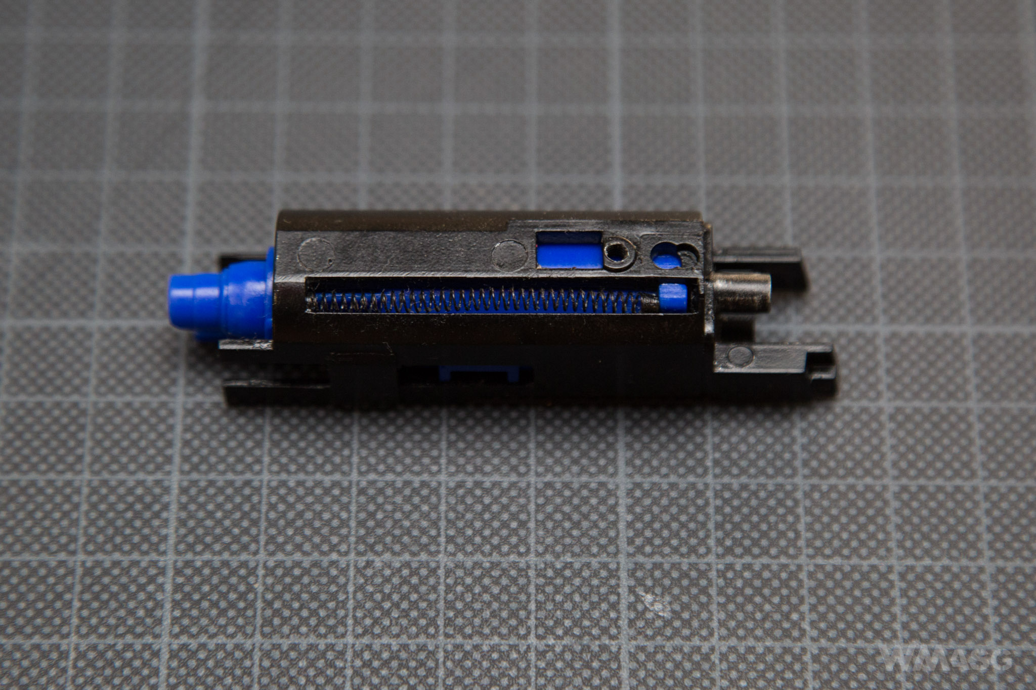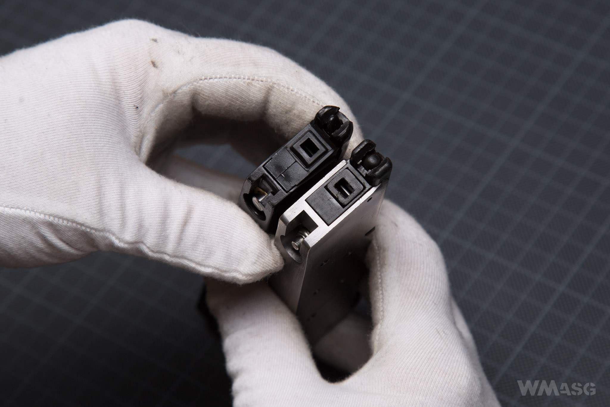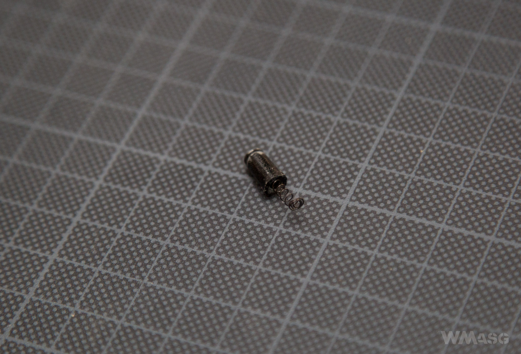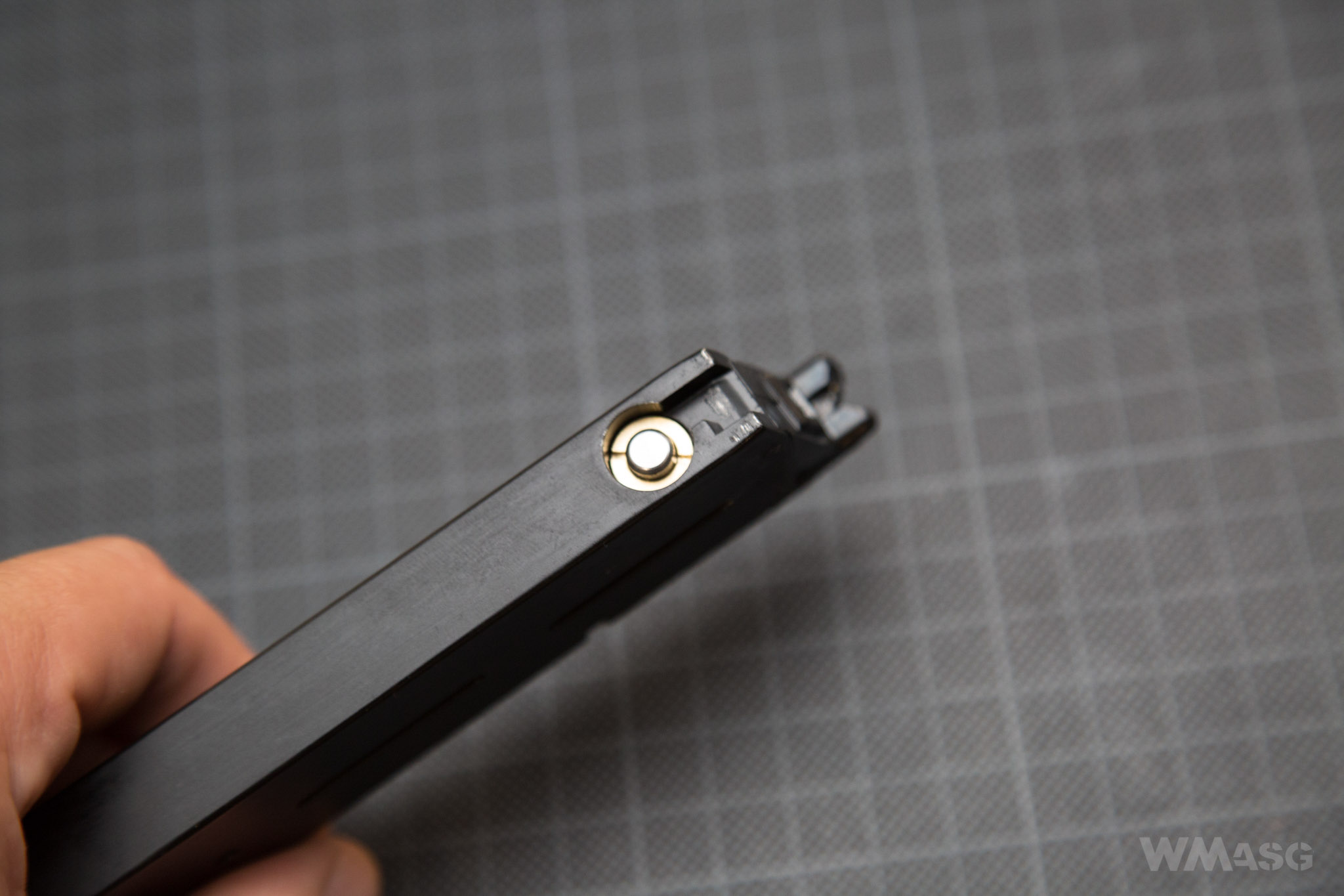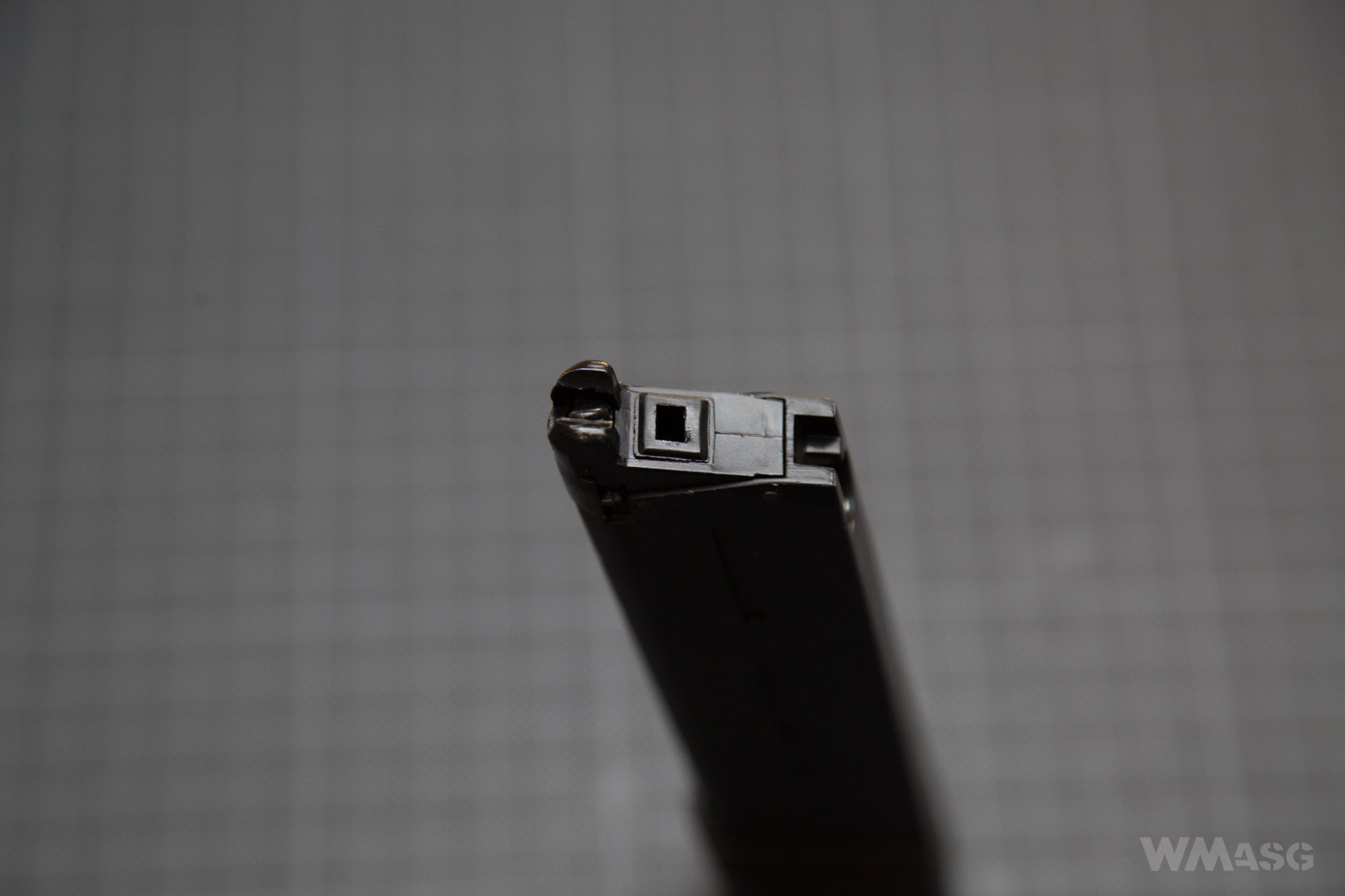 The manufacturer ensures that it uses a new generation of valves, which improve the comfort of gas loading, reduce its consumption and ensure gas tightness and smooth operation of the replica. Below is the charging valve. The plastic magazine floor plate has been removed only the valve is shown. During normal operation, the magazine is charged with gas through the hole in the footer.