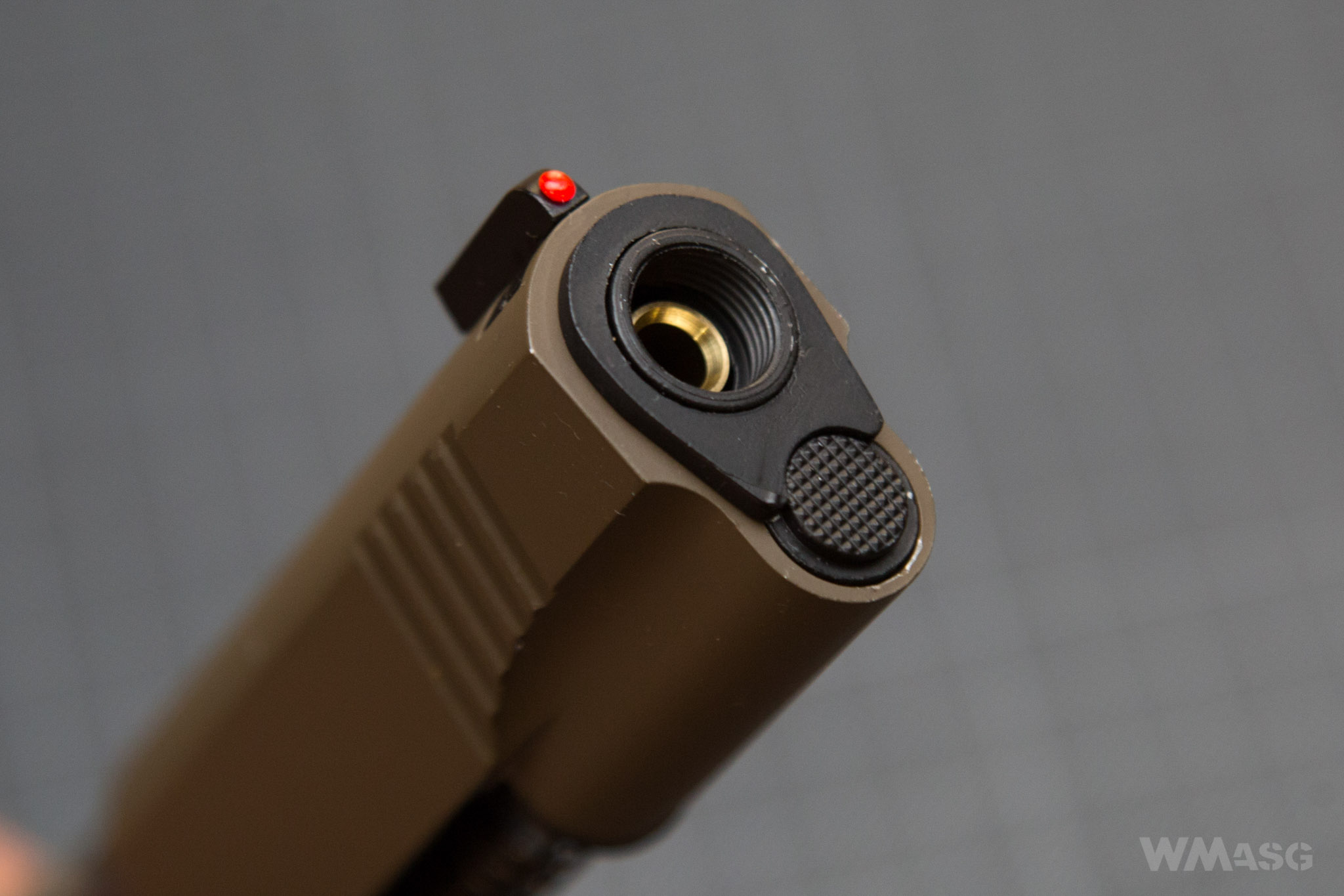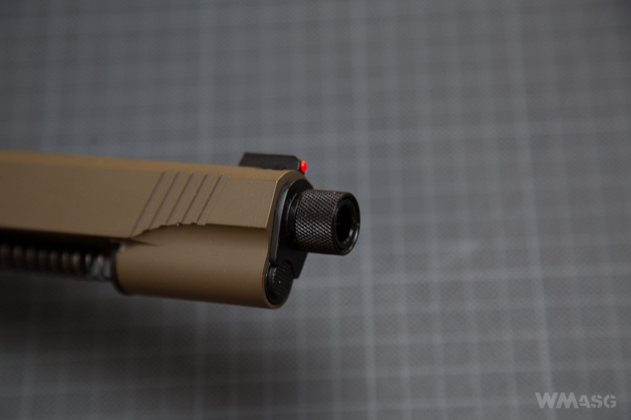 The adapter for mounting a silencer. At first glance, the barrel of the gun looks extended, because it seams to protrude 13 mm from the slide.