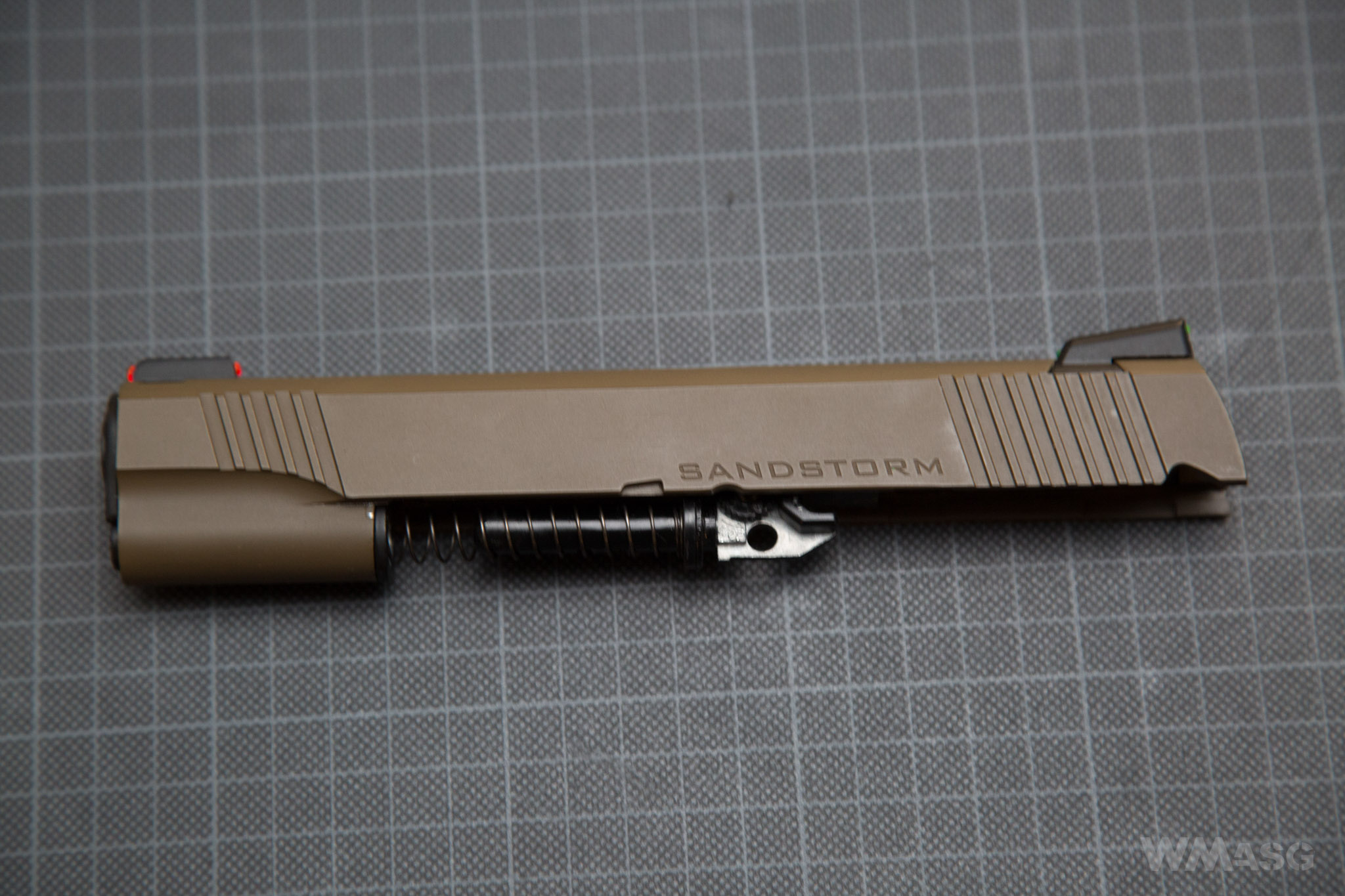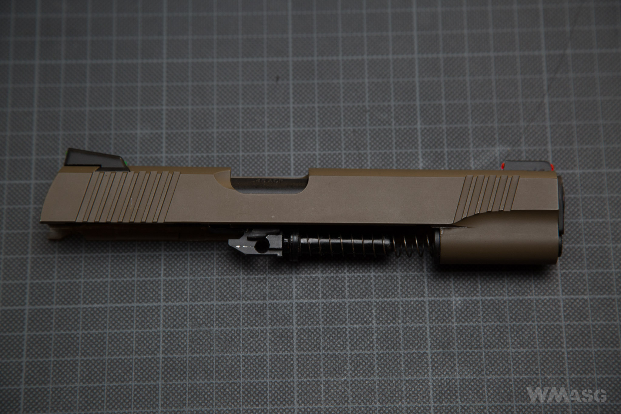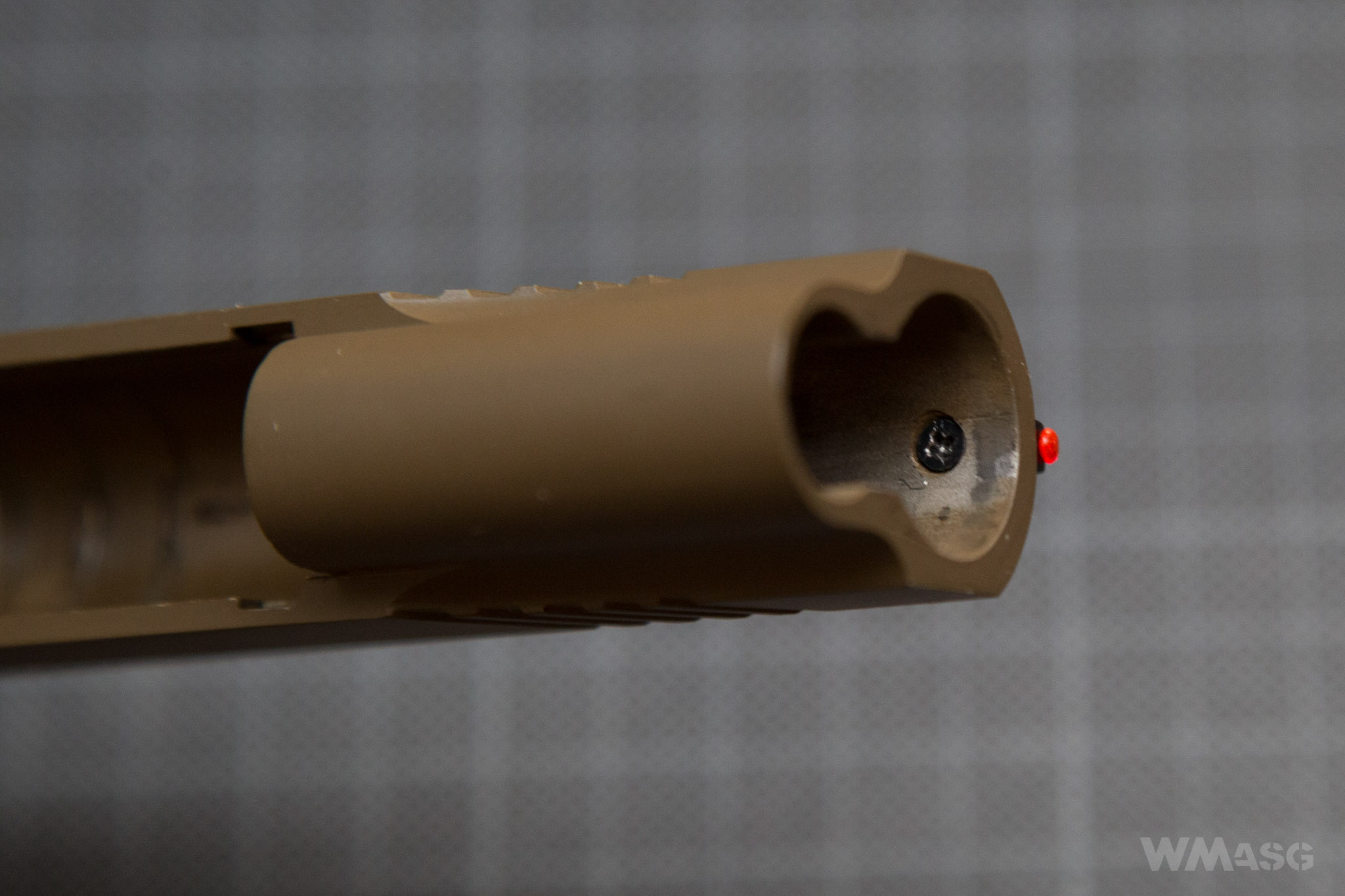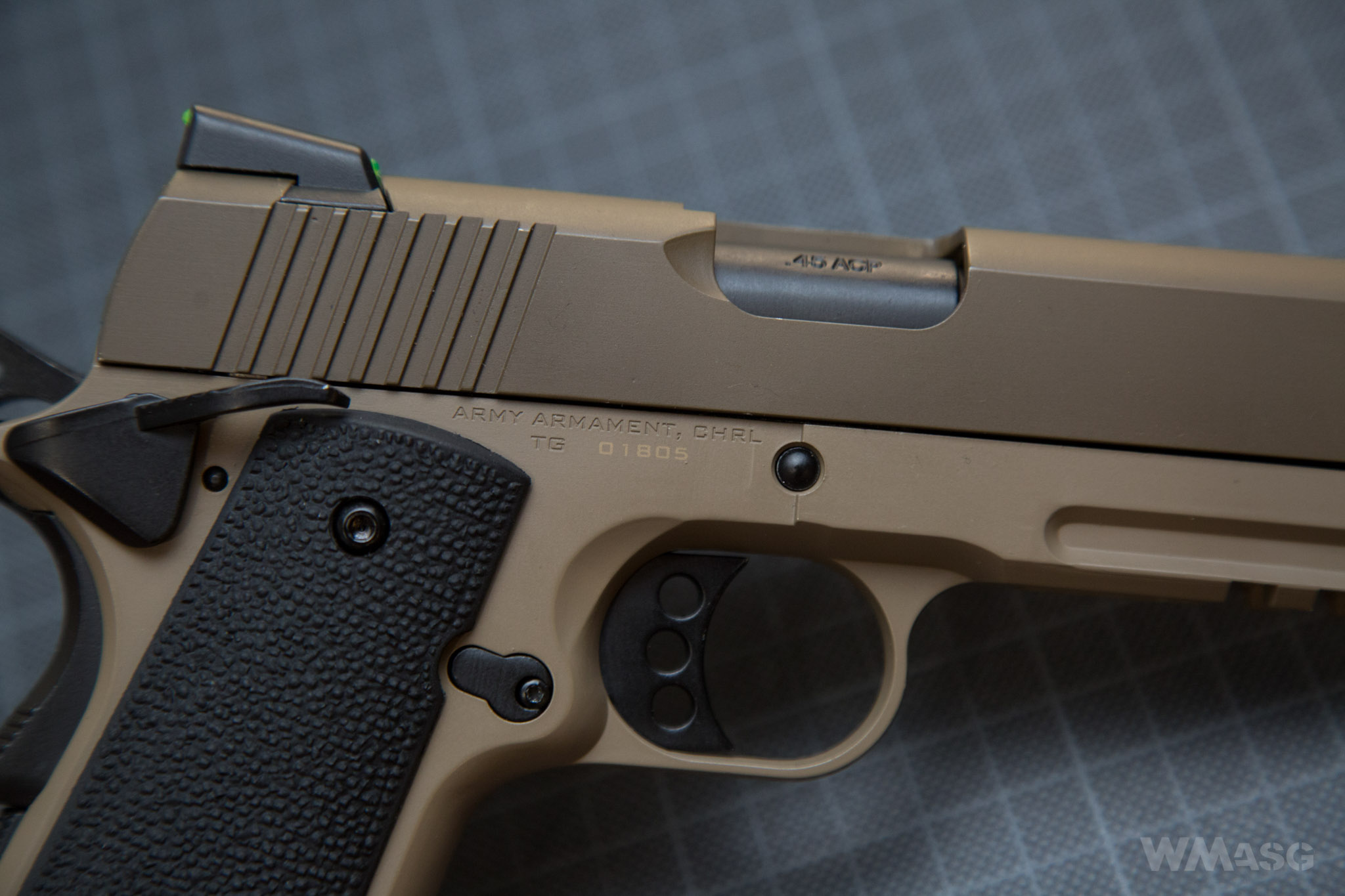Army Armament uses two types of return spring guides in its Colt 1911 replicas. The classic one - shorter, which during shooting and backward movement of the slide remains invisible, and a extended one used, for example, in some real firearms by Kimbers. The latter is revealed by the retreating slide. The R32 uses the classic version: