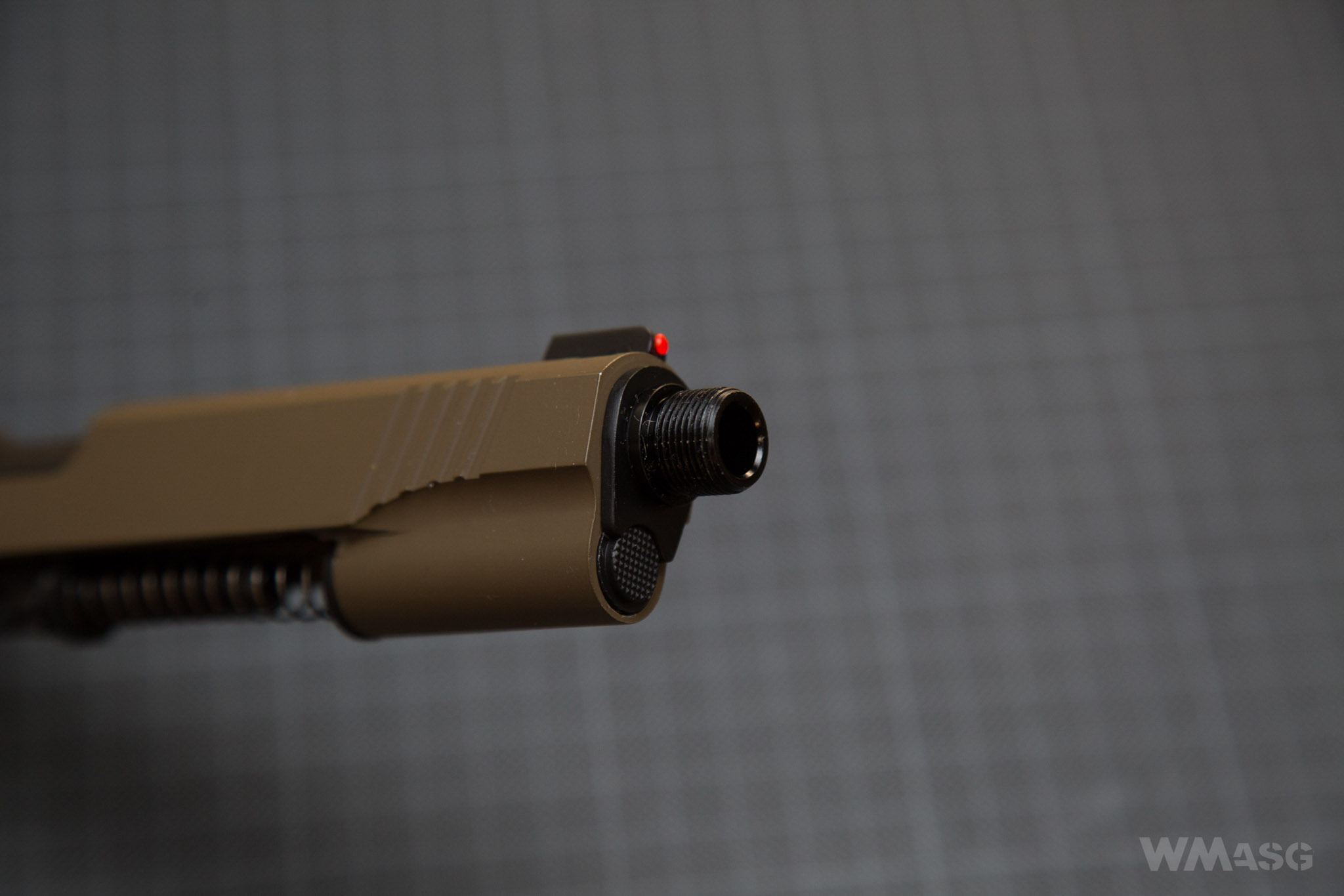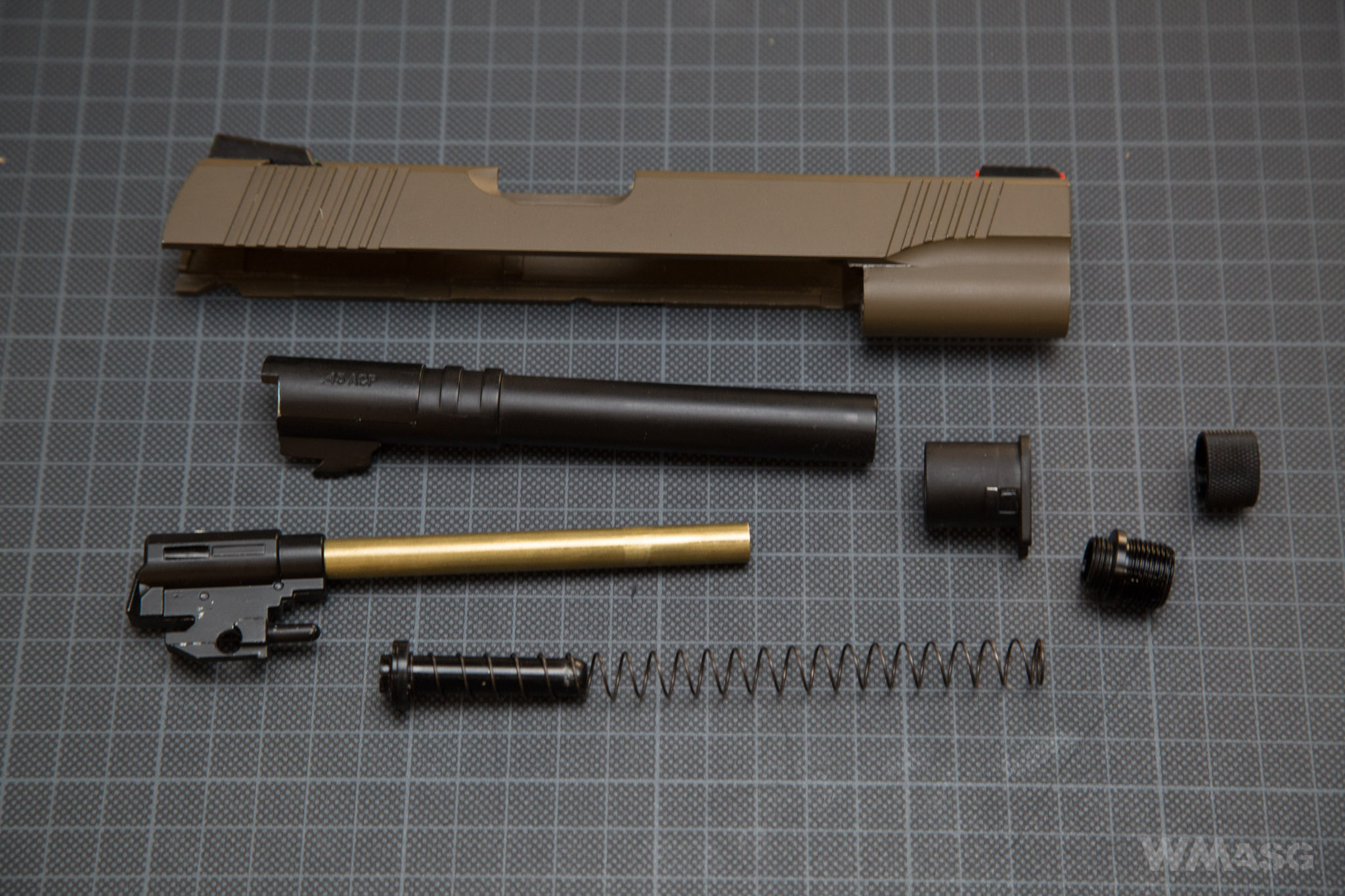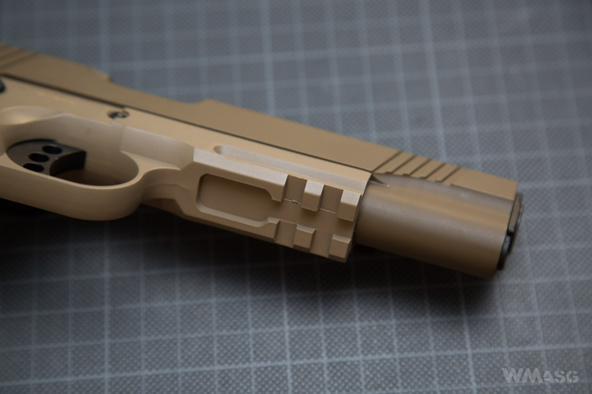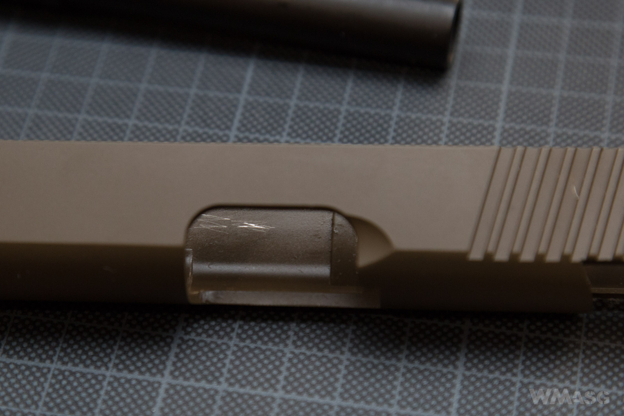 Army Armament uses two types of return spring guides in its Colt 1911 replicas. The classic one - shorter, which during shooting and backward movement of the slide remains invisible, and a extended one used, for example, in some real firearms by Kimbers. The latter is revealed by the retreating slide. The R32 uses the classic version: