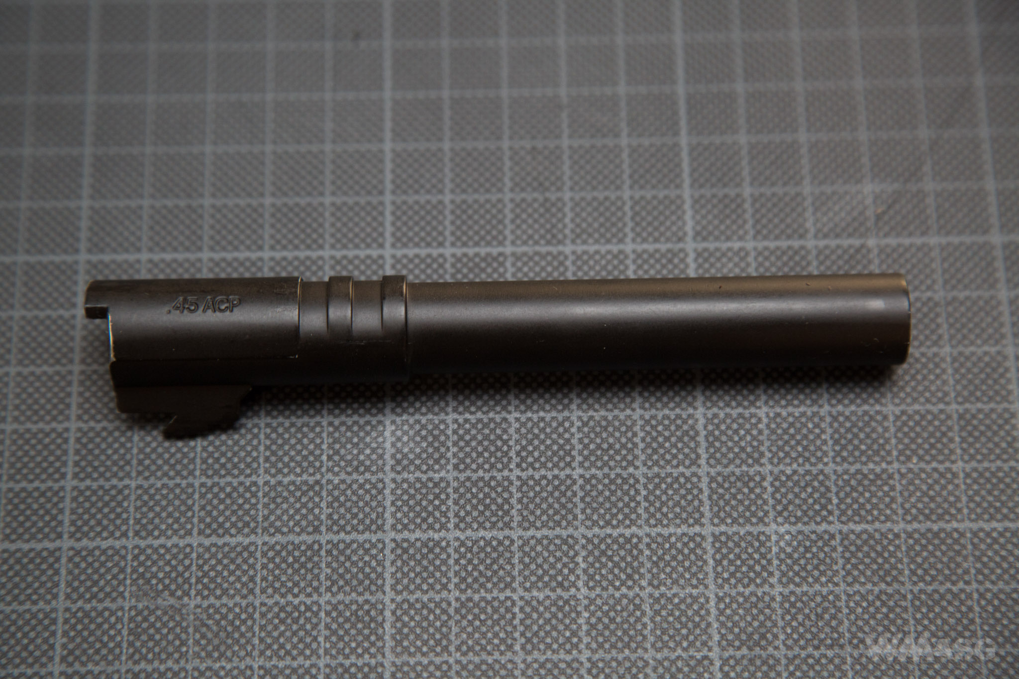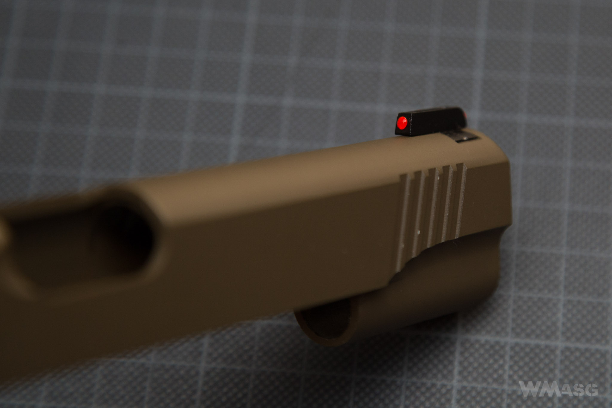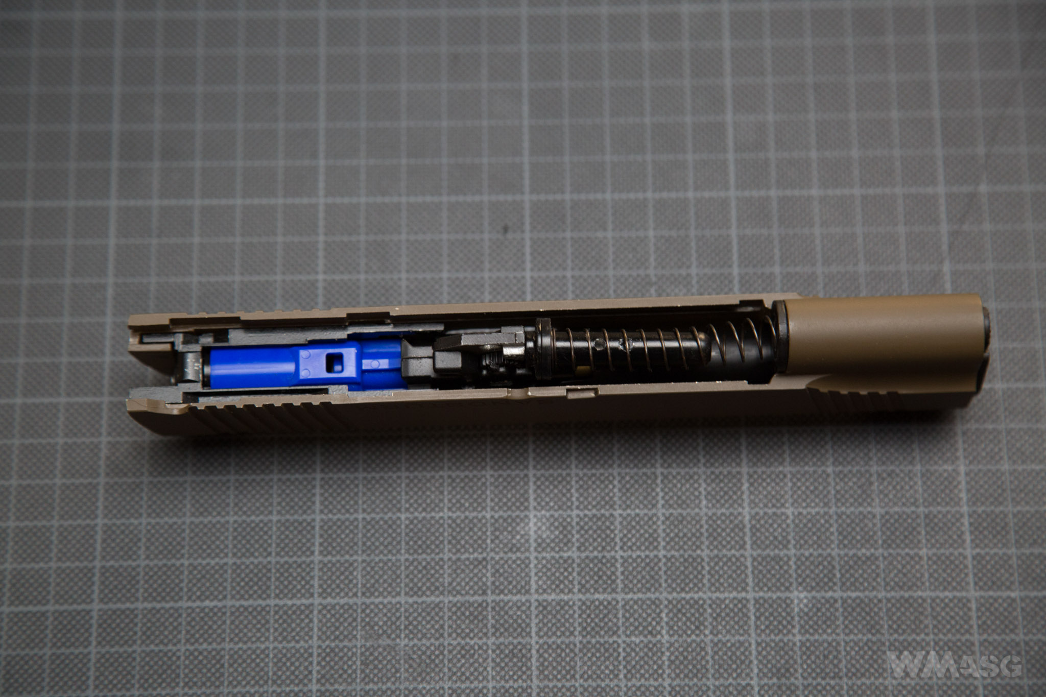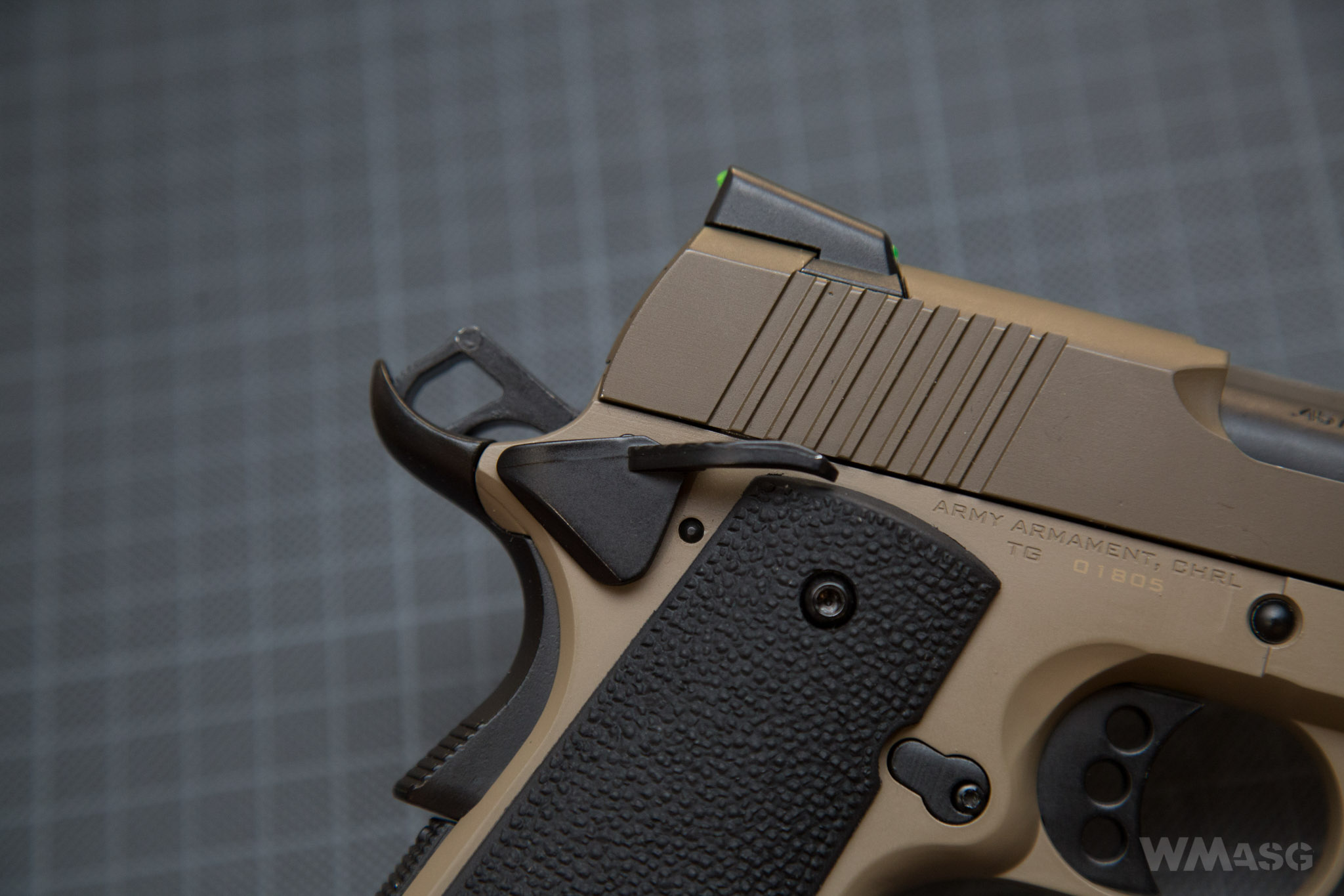 Army Armament uses two types of return spring guides in its Colt 1911 replicas. The classic one - shorter, which during shooting and backward movement of the slide remains invisible, and a extended one used, for example, in some real firearms by Kimbers. The latter is revealed by the retreating slide. The R32 uses the classic version: