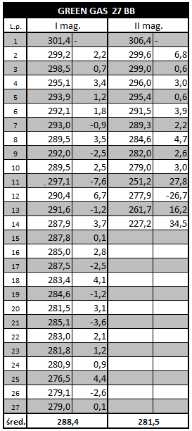 At one gas fill you can empty the entire magazine - 30 BBs. The last BBs left the barrel at 256.1 fps. The difference between the first and last shot on one gas filling is close to 40 fps. That's a lot.