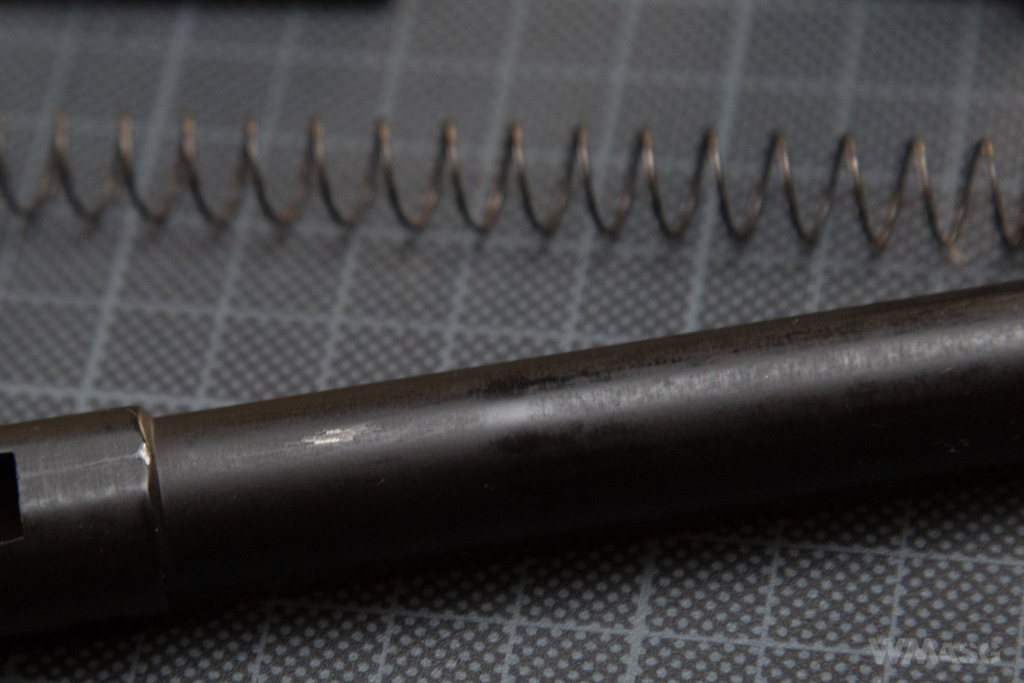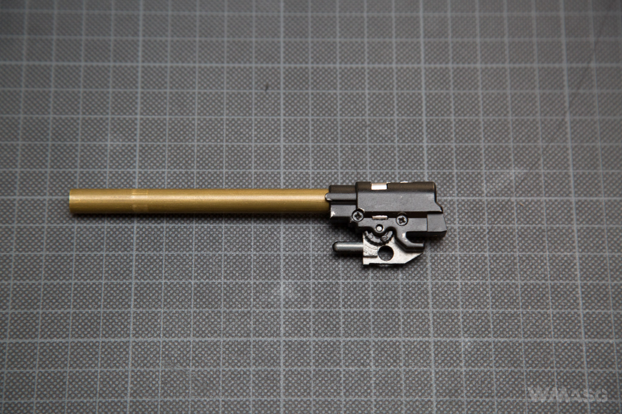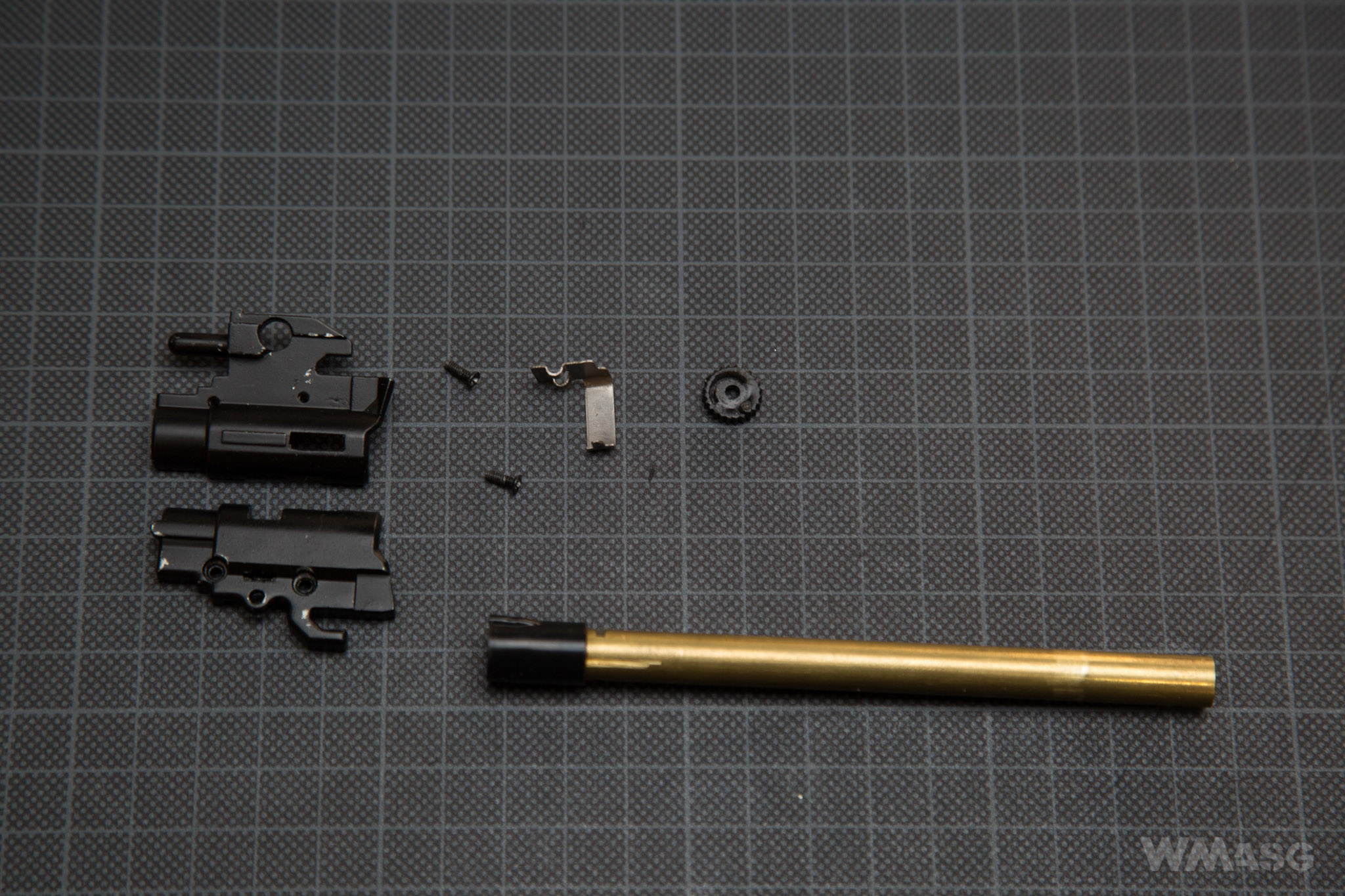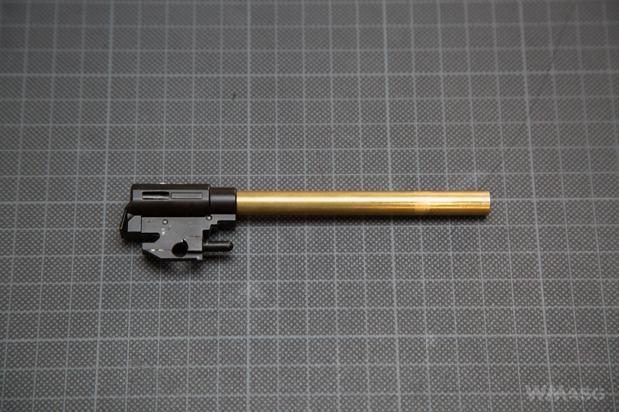 Next, we pull the spring guide's sleeve to the rear and rotate the lock covering the outer barrel at its end by about 40 degrees. Now we can pull the barrel from the slide. We separate the inner barrel and the Hop-Up chamber from the outer barrel by pulling it back by the chamber, or by tapping it gently. The photos below show that there is no sleeve leading the return spring. It was lying outside of the photo frame, I'm sorry.