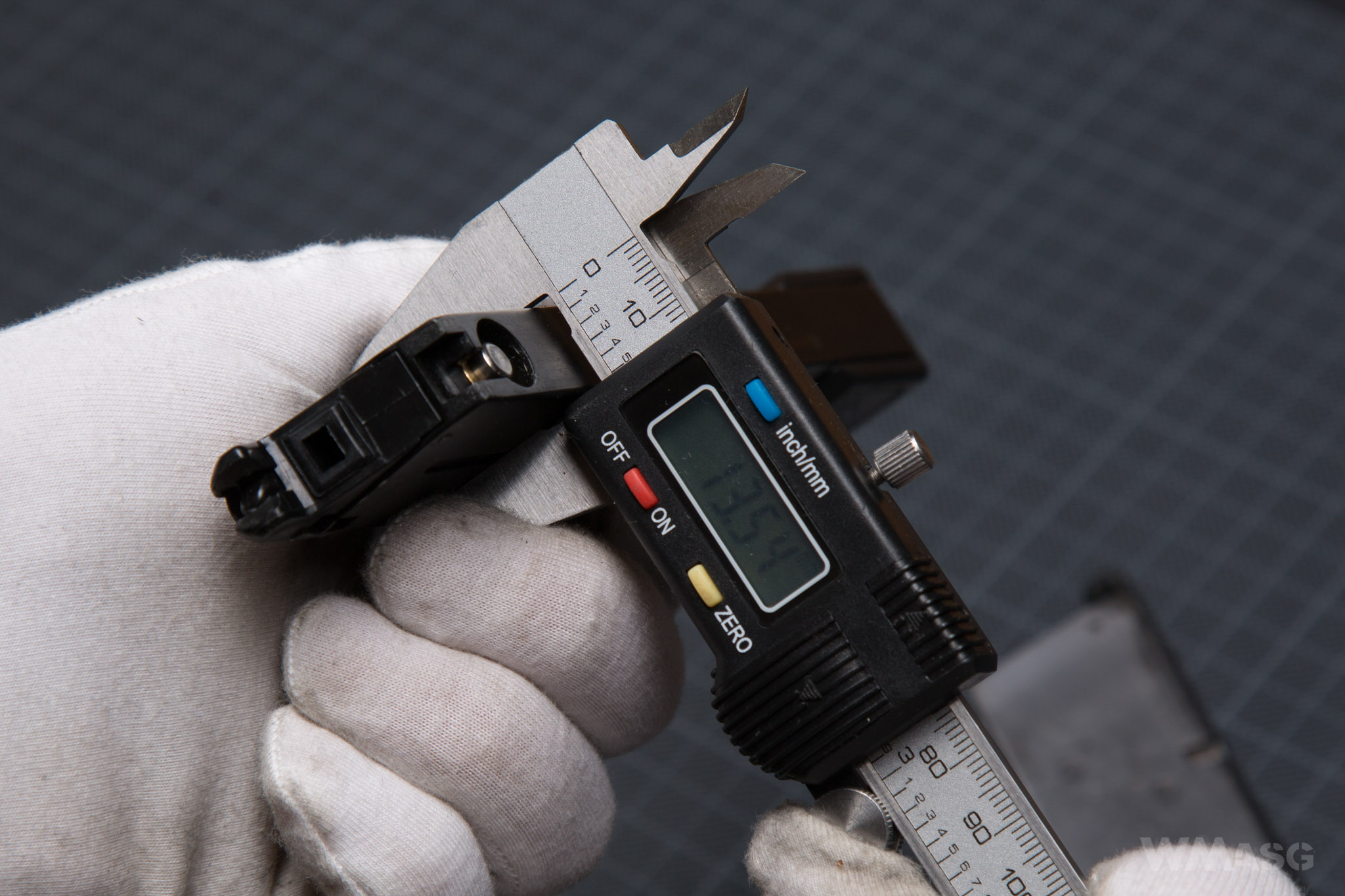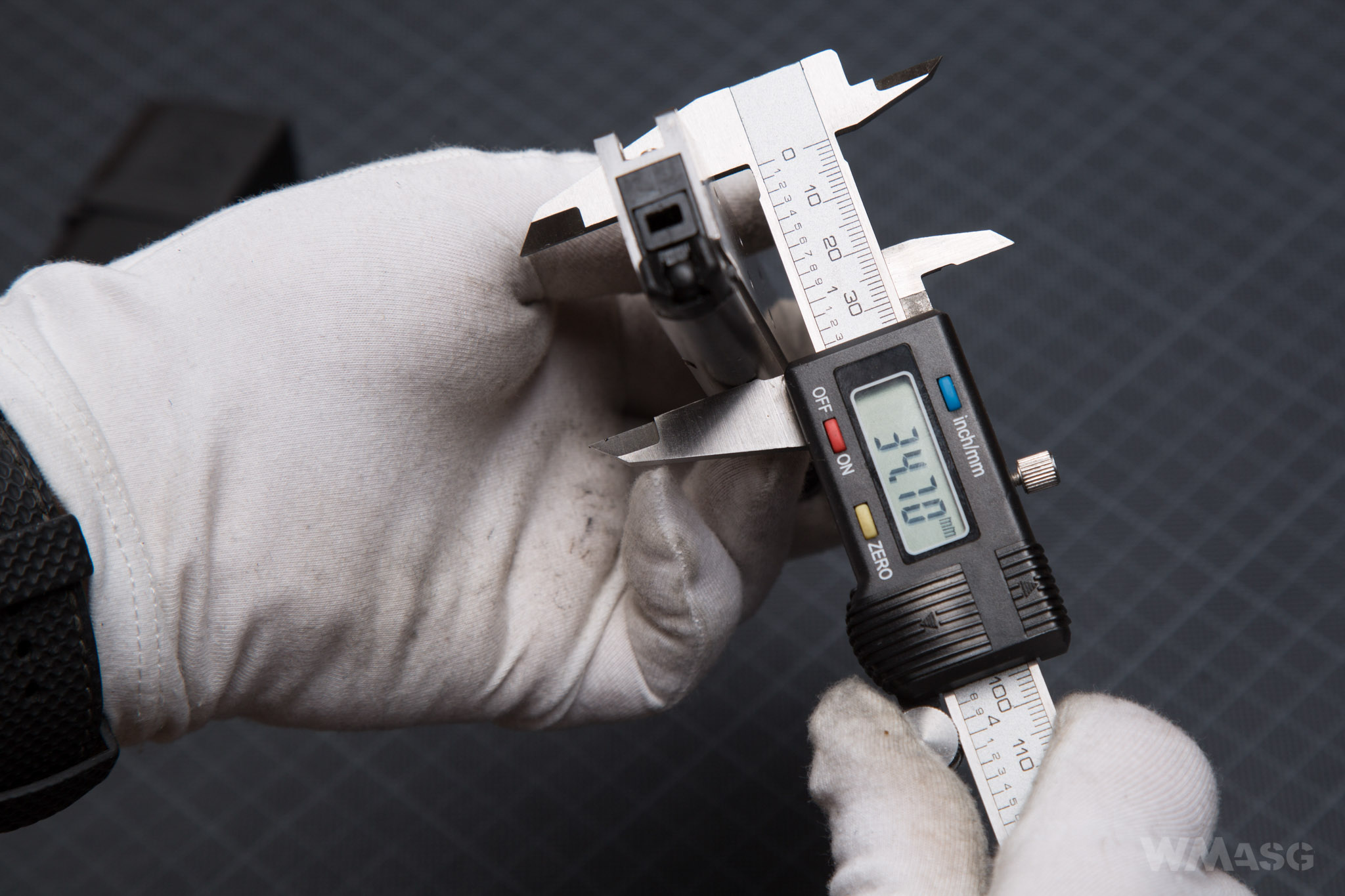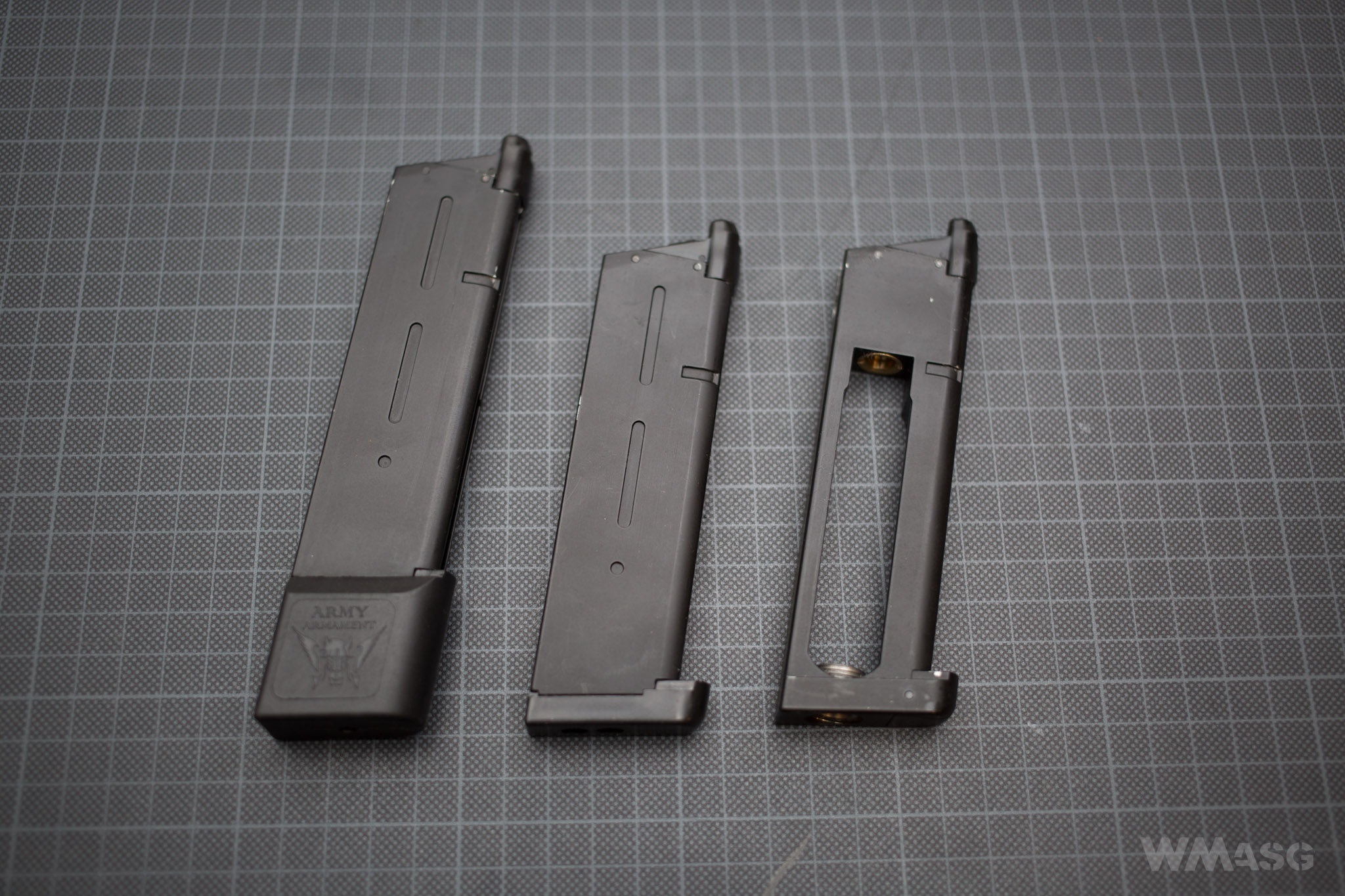 The final verification, however, is the failed attempt to insert the KJW magazine into the Colt by Army - the magazine does not fit into the pistol grip at all, not one bit. The photos below show a comparison of dimensions.