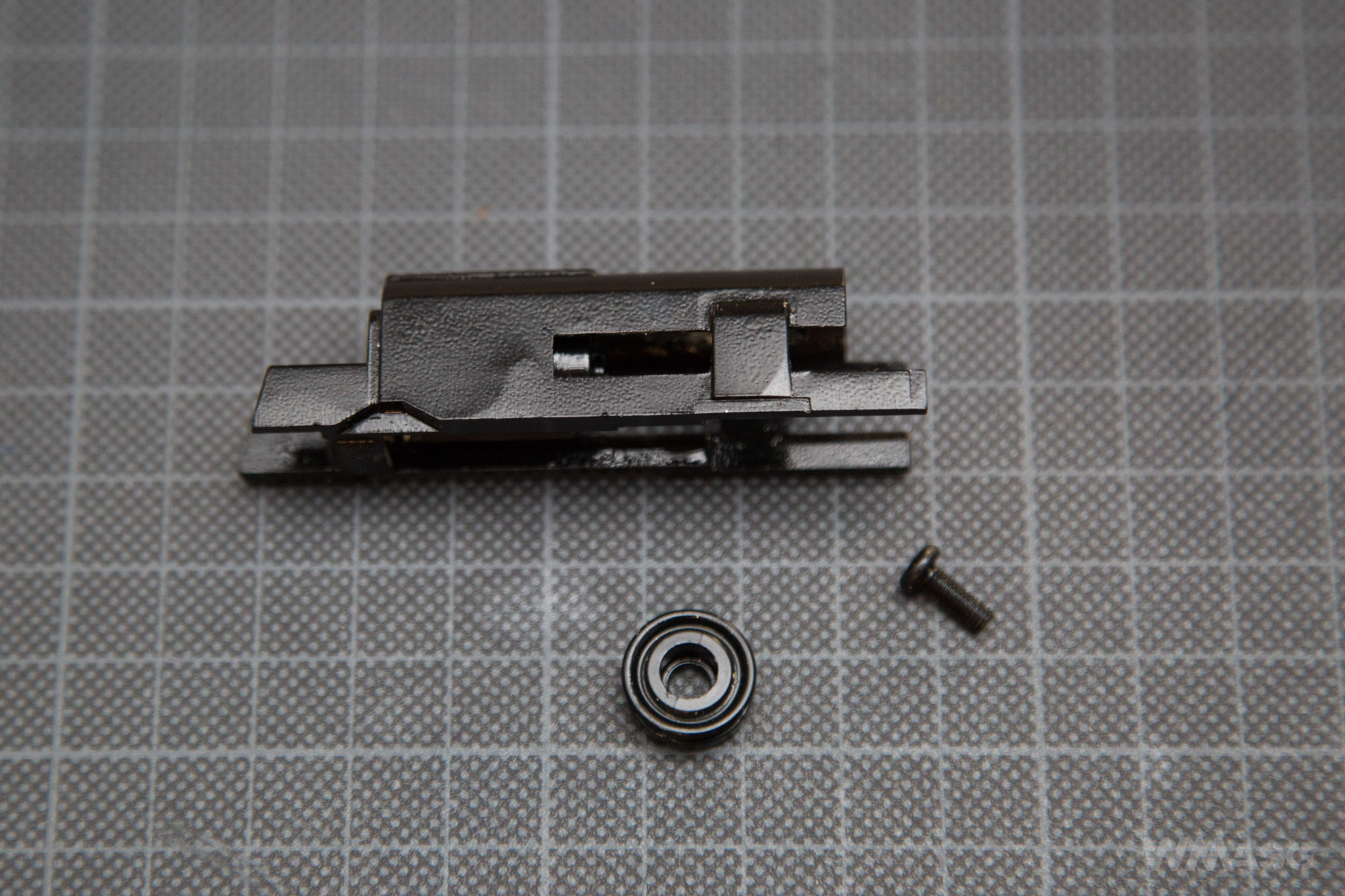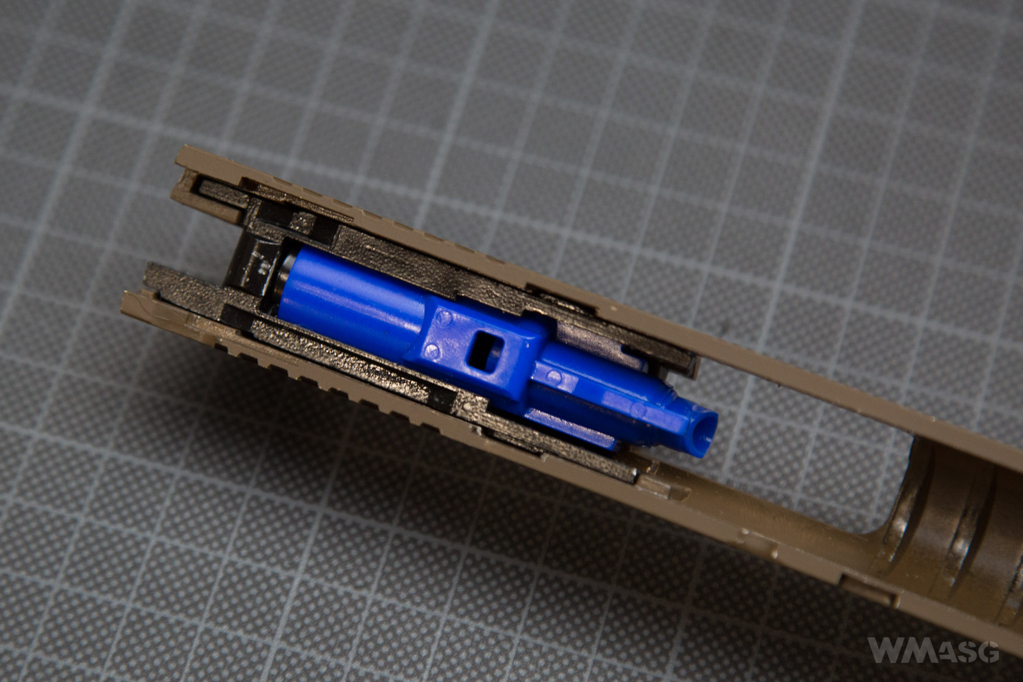 The ability to disassemble the slide is a must, because only in this way can you access the Hop-Up adjustment. For those who have never done this: the slide should be moved back to the position where the first notch on its left side aligns with the outer latch and than pull out the latch itself. The easiest way to do this is by pressing its axis on the other side of the slide. After removing the latch completely, push the slide forward and off the frame. The pictures below lack the previously unscrewed silencer adapter. Of course, the slide can be removed without unscrewing the adapter.