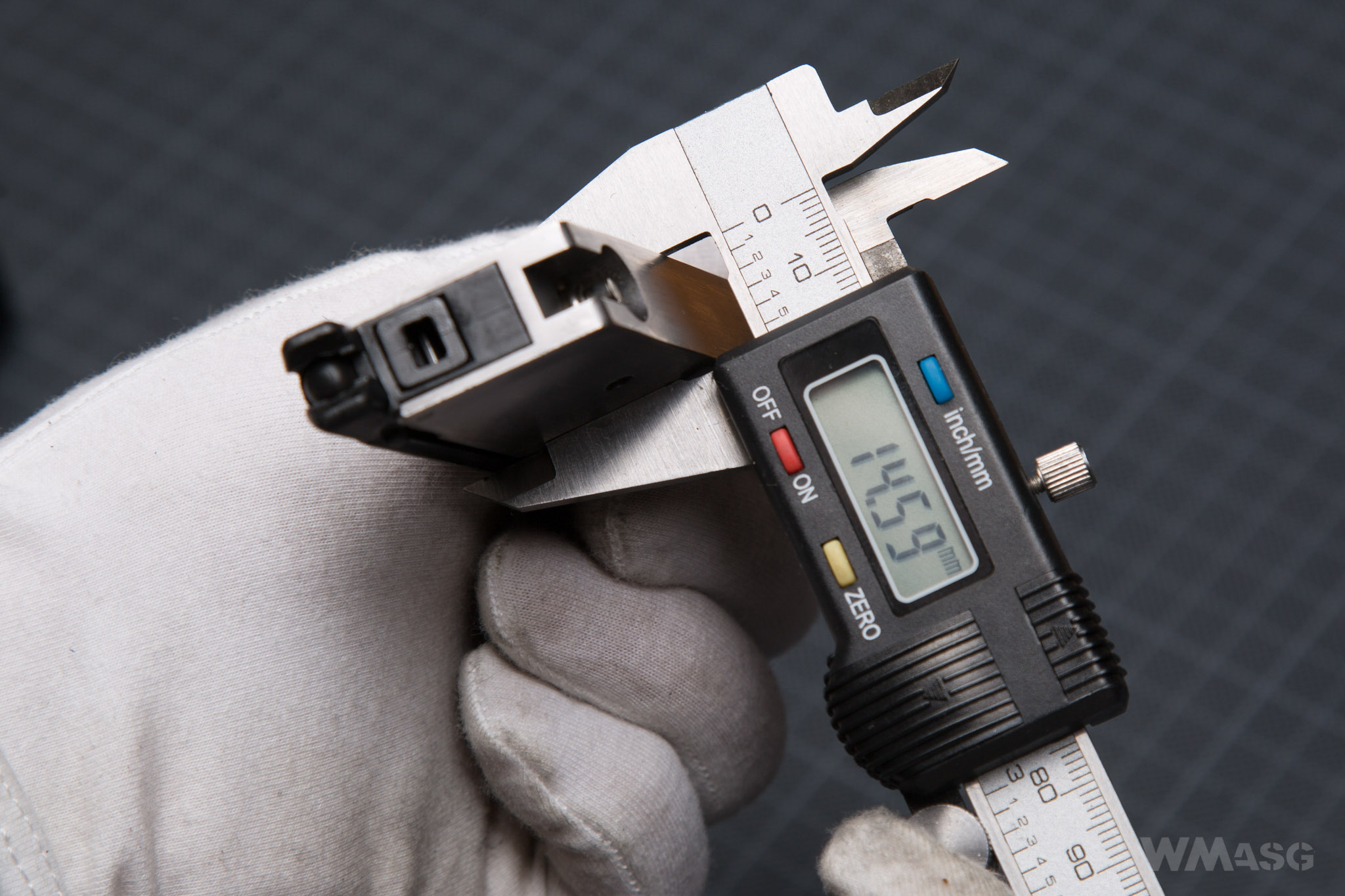 In many available descriptions of the R32 replicates, information about an enlarged magazine latch is present. Without going too deeply into the semantics - the magazine latch, and thus the part keeping the magazine in place, remained unchanged. It is not enlarged and works like in other replicas. The button used to release the latch and replace the magazine is enlarged. Enlarged buttons are often used to facilitate handling a gun in gloves, under stress or under time pressure (e.g. in sports). Using them often requires getting used to - you have to master your movements as not the press anything by accident. Basically, I would not write about it at all, but an enlarged button, in combination with a weak spring, means that it is often accidentally pressed. I made a lot of attempts and unfortunately I repeatedly picked up the magazine from the floor. The issue is further complicated by the considerable weight of the extended magazine (246 g empty and 257 g with gas and 0.2 BBs).