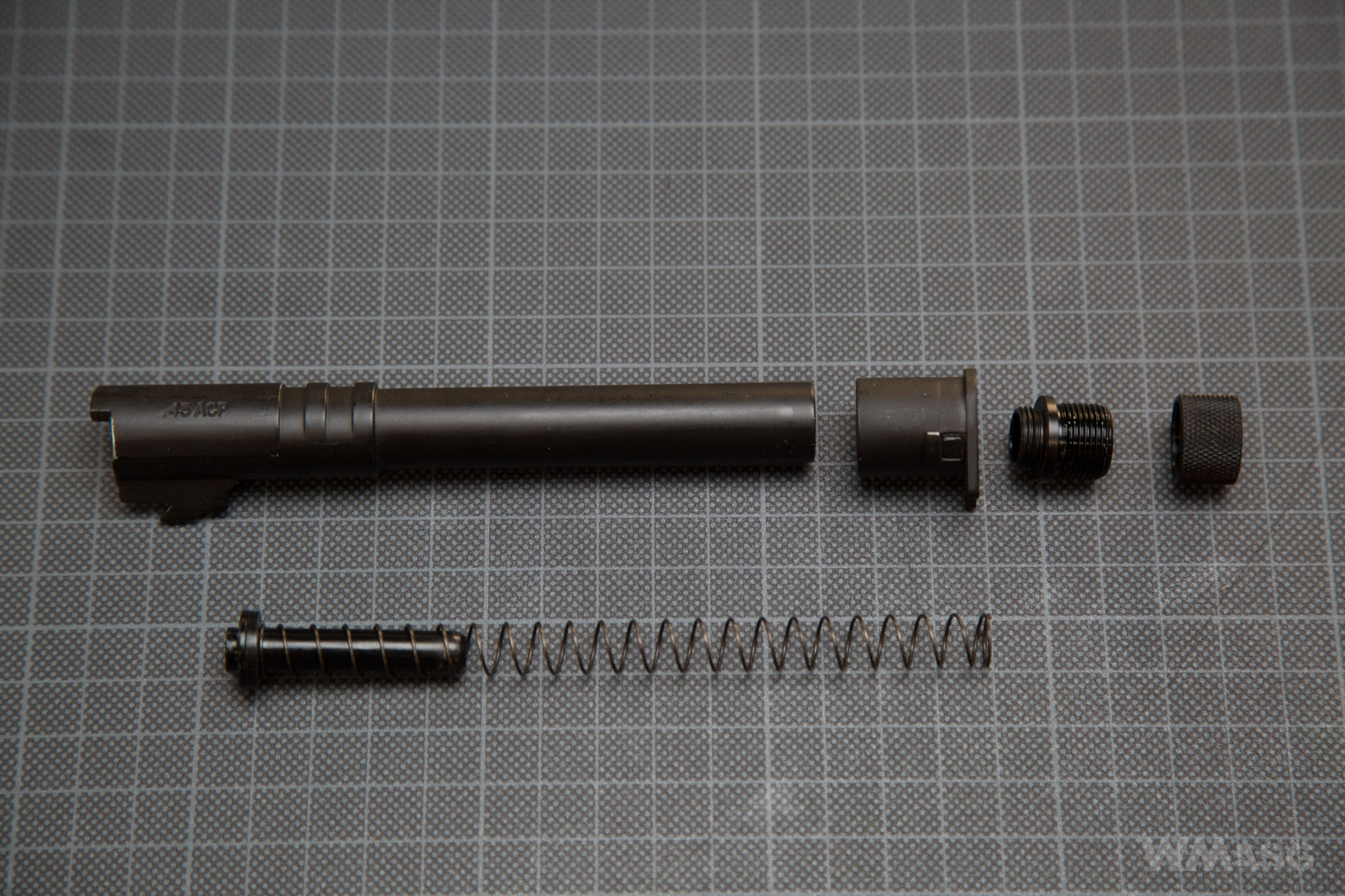 The external barrel with a disassembled silencer adapter, lock and return spring: