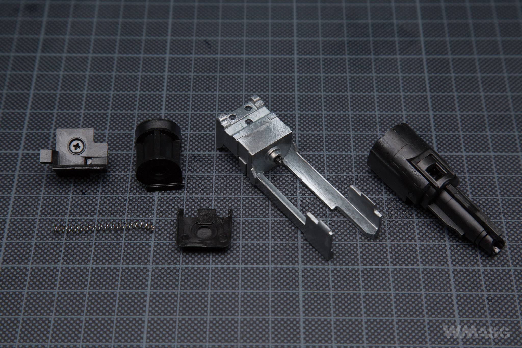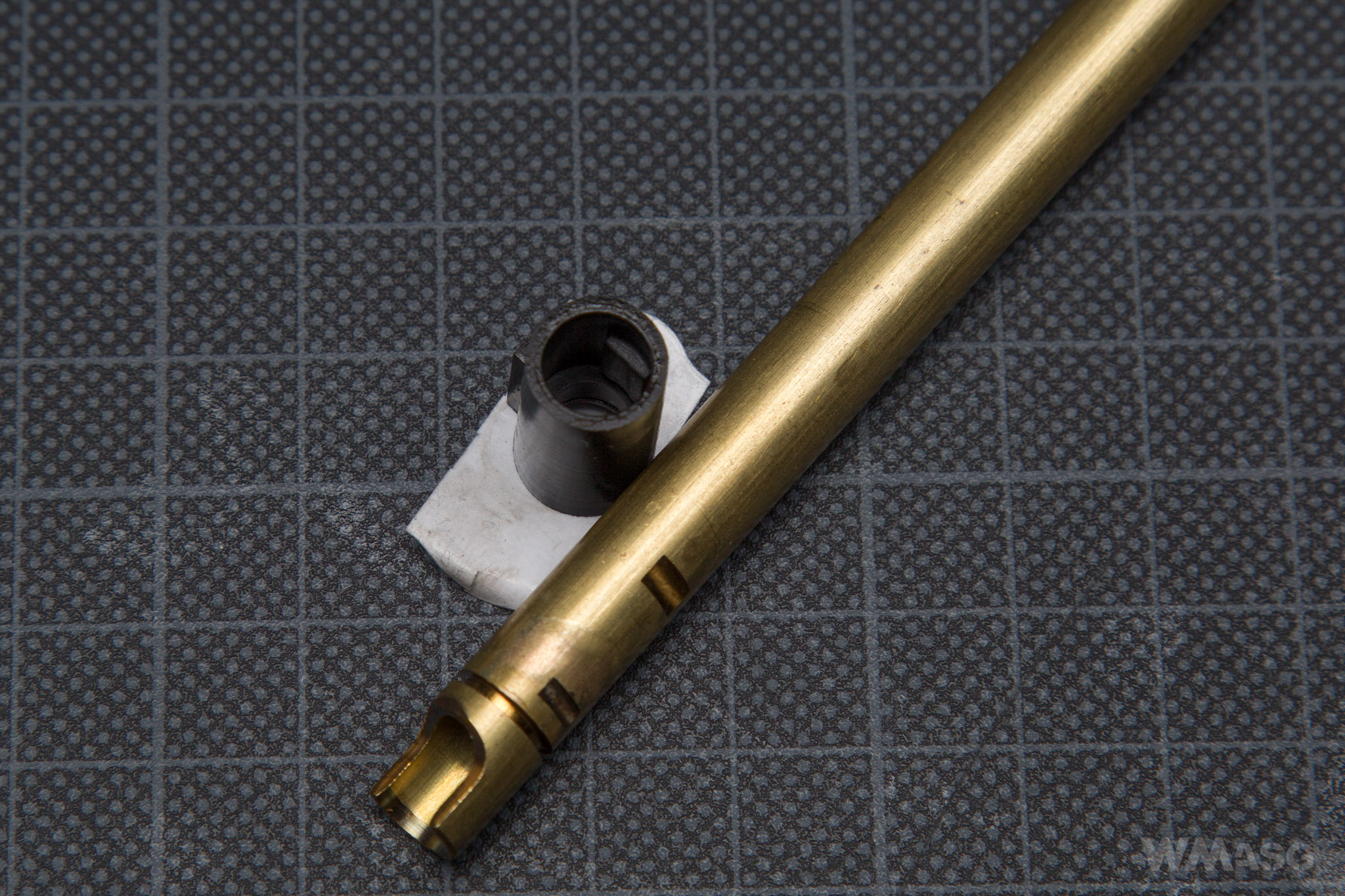 To get to the hop-up, first disassemble the return spring and its guide. After pulling out the return mechanism, we can also pull out the outer barrel together with the chamber. Next, we can take up the chamber with the inner barrel from the outer barrel. The two part chamber is held together with two Phillips screws. After taking it apart, we gain access to the hop-up bucking and the inner barrel. The black bucking is of medium hardness with a standard spinning nub used in GBB type replicas.