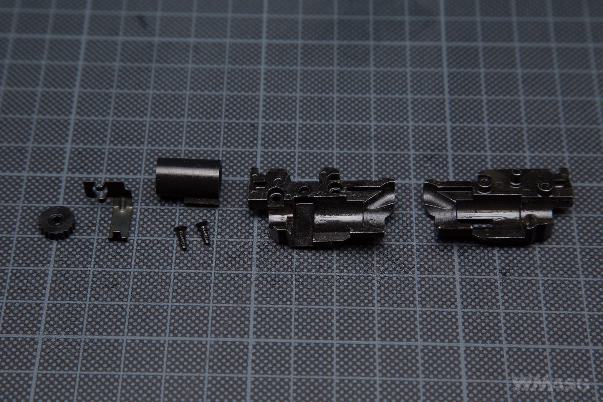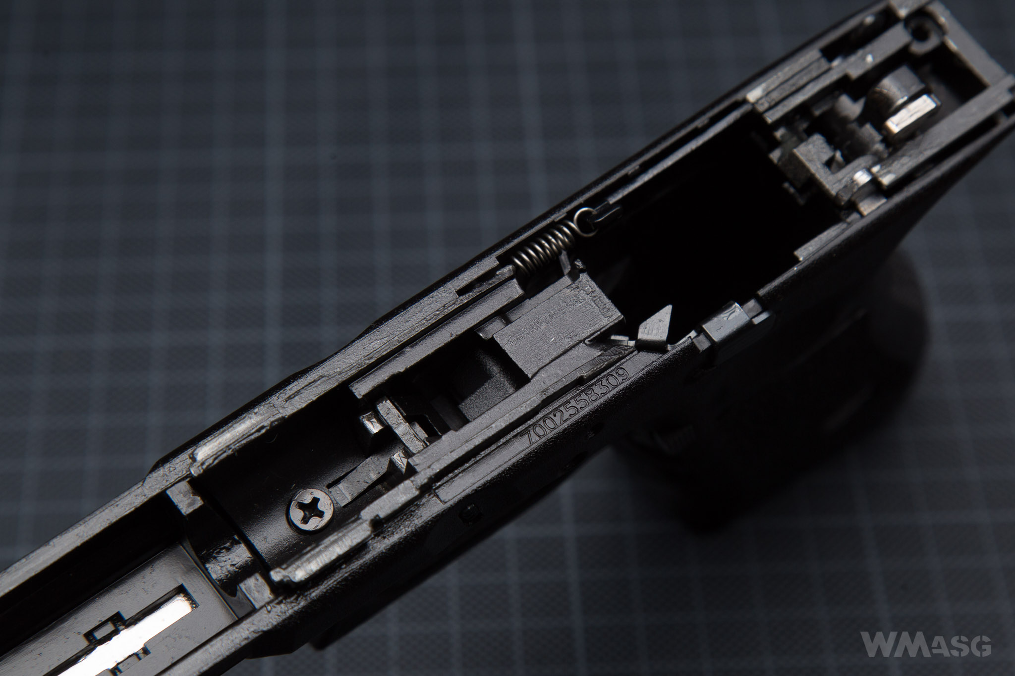 In order to fully disassemble the trigger mechanism, it is also necessary to take apart the hammer system in which the steel trigger rail is mounted. We can do it by taking out the back pin and pushing the whole assembly up slightly. Everything looks very robust, so do not be afraid of damaging anything. In the event of a jam, you may suspect that there is some dirt in any of the systems. This should not be a problem for a trained technician to fix. Everything can be disassemble down to its basic parts, cleaned, lubricated and put back together. However, we suggest that you give your pistol to a professional service because you may have a problem with putting the replica back together.
