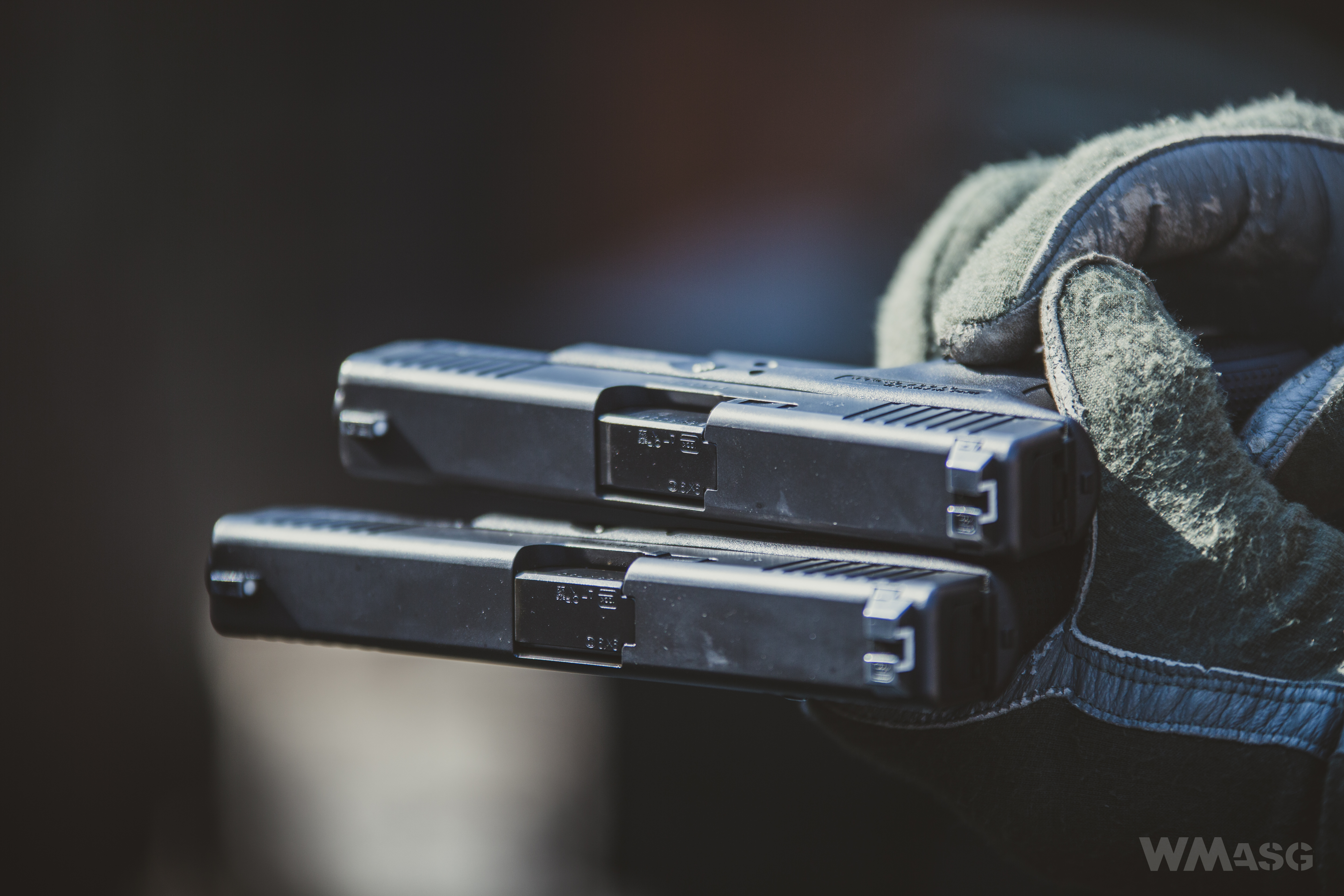 The metal magazine holds 25 BBs. The replica is powered by CO2, and the gas capsule is placed in the magazine by unscrewing a screw, which is located under the plastic floor of the magazine. We can load the gas capsule in two ways. One of them is to insert it from the side, unscrewing the screw with an Allen key through the hole in the bottom of the magazine. Another method is to insert the capsule from the bottom by pulling off the plastic floor, pulling up BB feeder spring and then unscrewing the bottom screw. On the back of the magazine there are imitations of the holes showing how many rounds are left in the magazine, and under it, a small Glock logo. The magazine is gas tight, we did not notice any leakage on in the magazine or the valves. As the replica is made using the TM standard, getting a spare magazine that fits the replica should not be a problem.