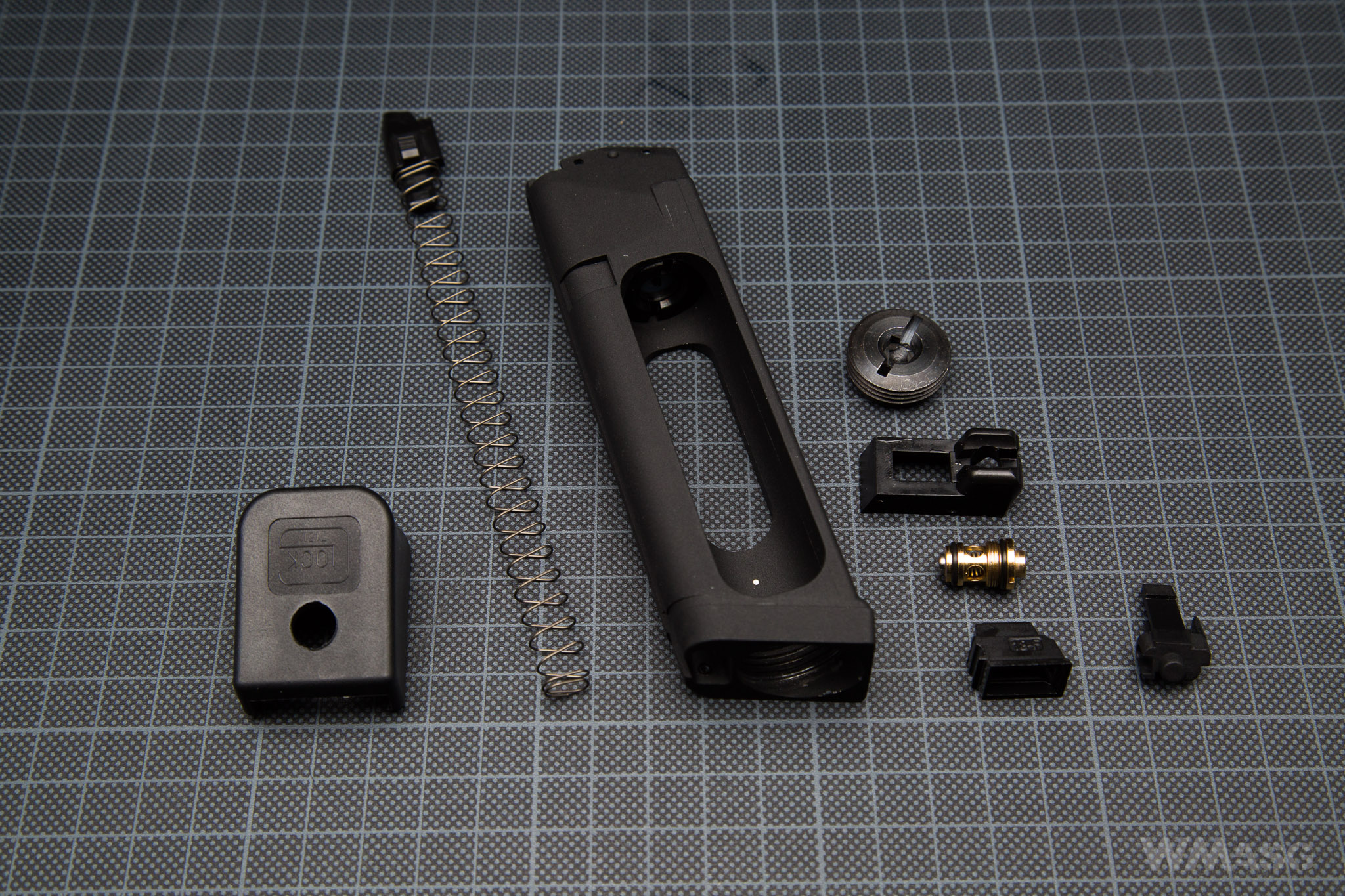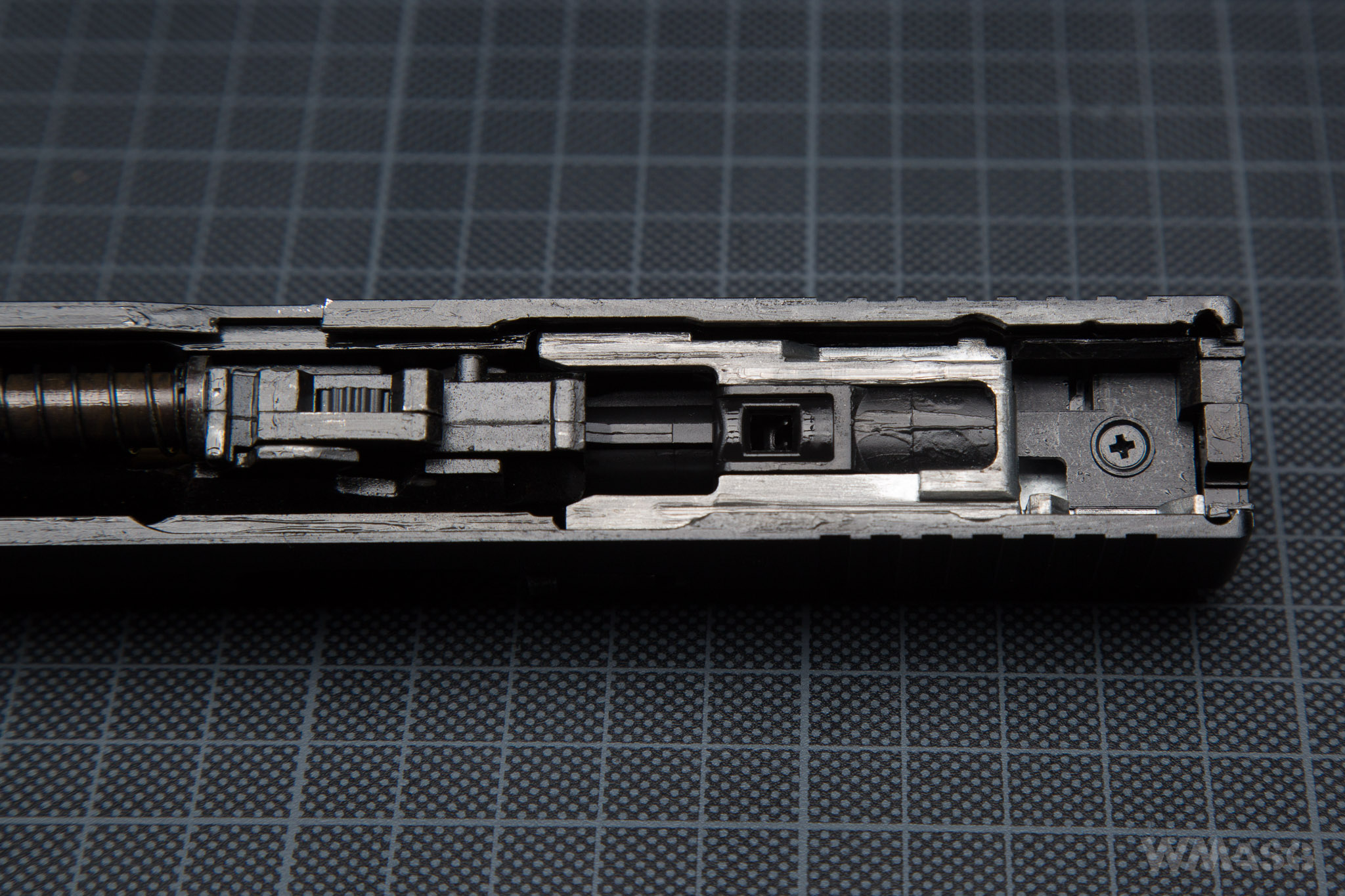The first stage of taking the replica apart is the same as in a real firearm: you pull out the magazine, pull the slide lock down and pull the slide forward. Thanks to this, we gain access to the hop-up adjustment, which knob is located at the bottom of the slide. The first thing we notice is the spring of the return mechanism, or rather two springs on one guide, a feature present in the real firearm but other Glock models. Whereas a similar solution can also be found in CO2 Glock replicas by KWC, yet in the Deluxe version, the mechanism is much closer to the real one.