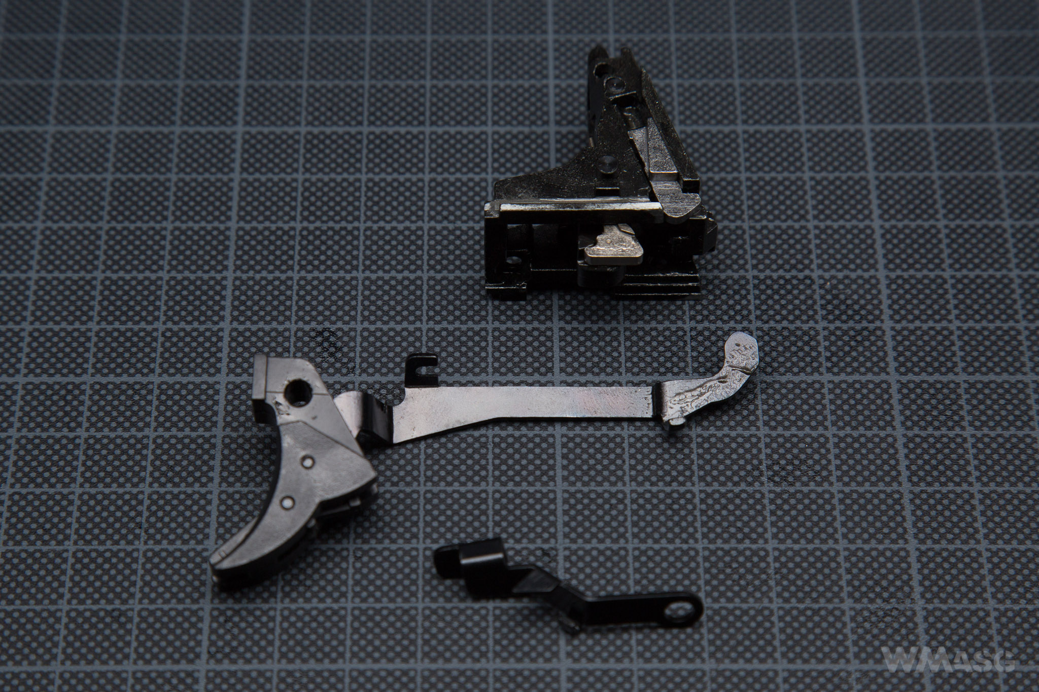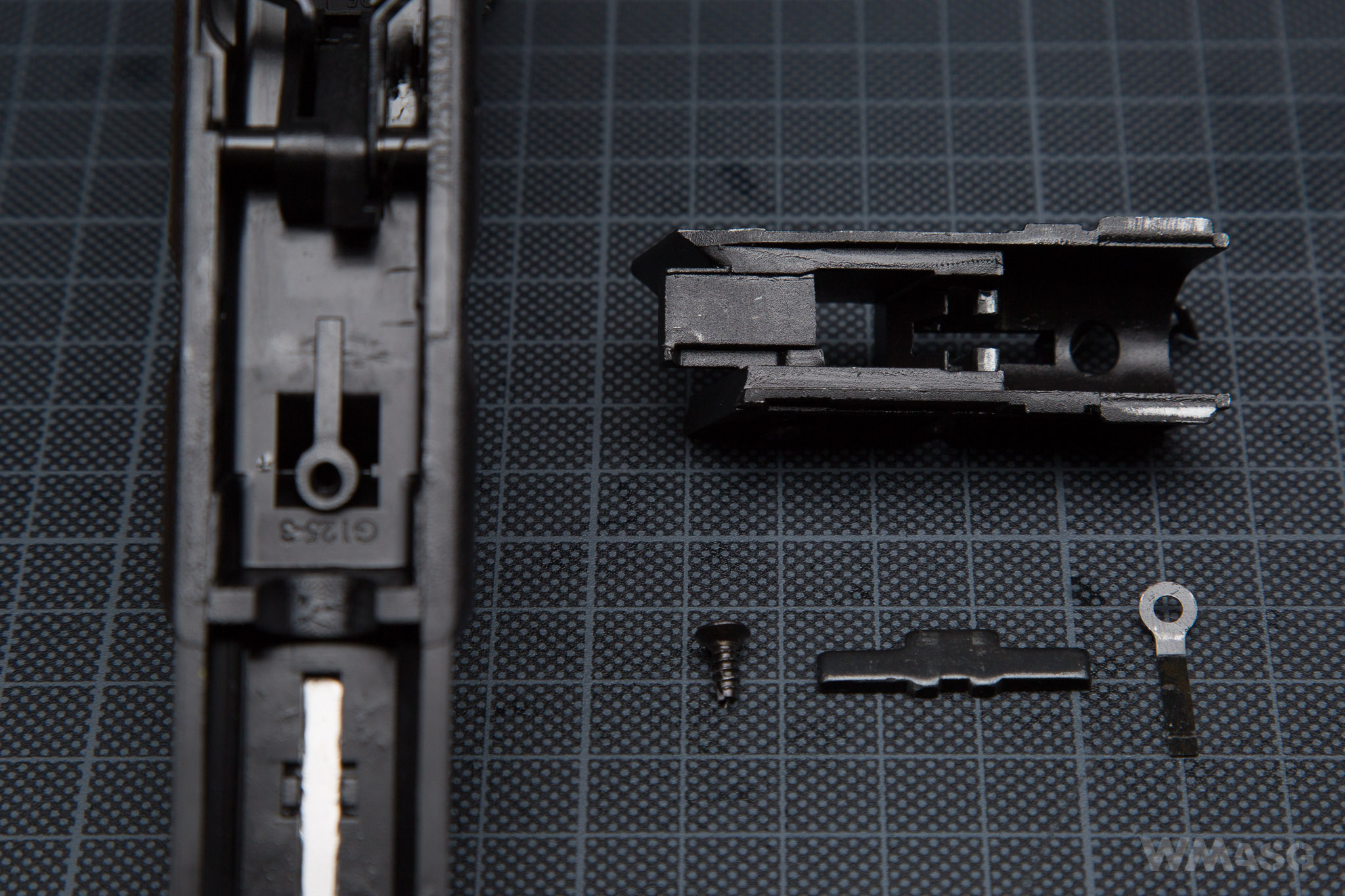 The entire trigger system is made of metal parts. To remove the trigger, unscrew one Phillips screw and then take out the pin located just above the trigger pin. Thanks to this, we can pull the part of the trigger system upwards, beforehand pulling out the slide latch.