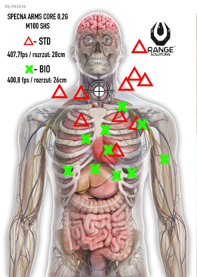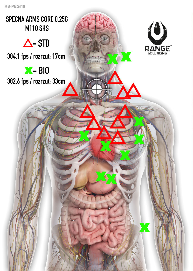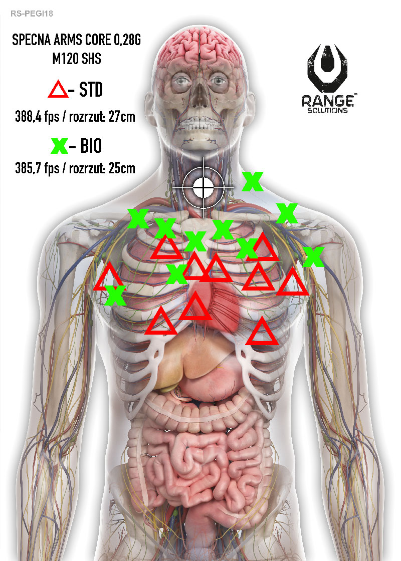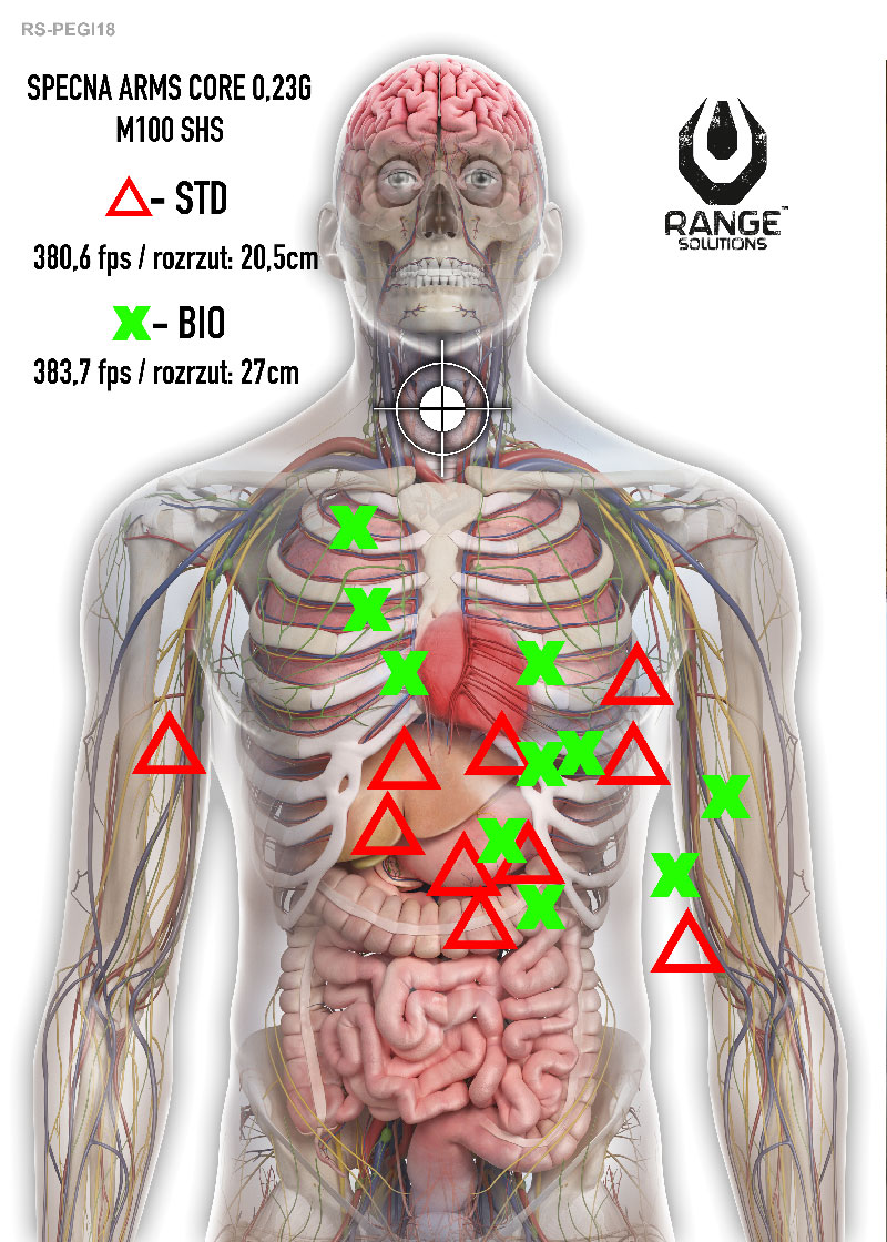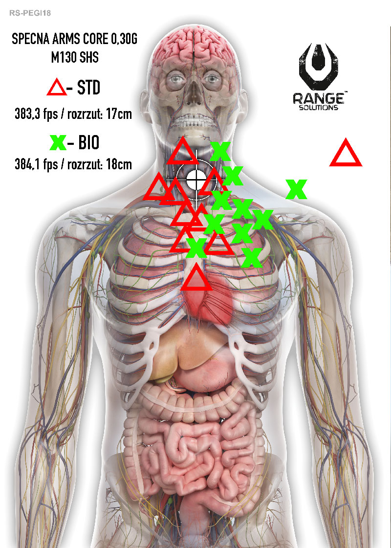 Whereas in the case of muzzle velocity the differences between Core and G&G BBs were very small, the difference in grouping is very noticeable. What is the cause? The only possible cause might be the quality (uniformity) of the plastic the BBs are made from. The plastic in G&G product must be more uniform, lacking microbubbles of air, which results in very similar, predictable trajectory of each BB. The geometric centre must be closer to the center of mass of the BB. In the budged product of Specna Arms the grouping is wider but still acceptable for support weapons and many assault rifles. Despite all of the above there is always the question of "quid pro quo" - in this test we compared popular budged level BBs with one of the best BBs available on the market. Bearing that in mind I think that the Core Specna Arms BBs fared surprisingly well.