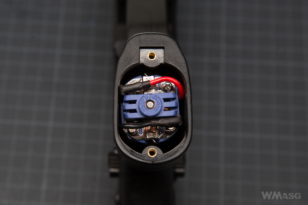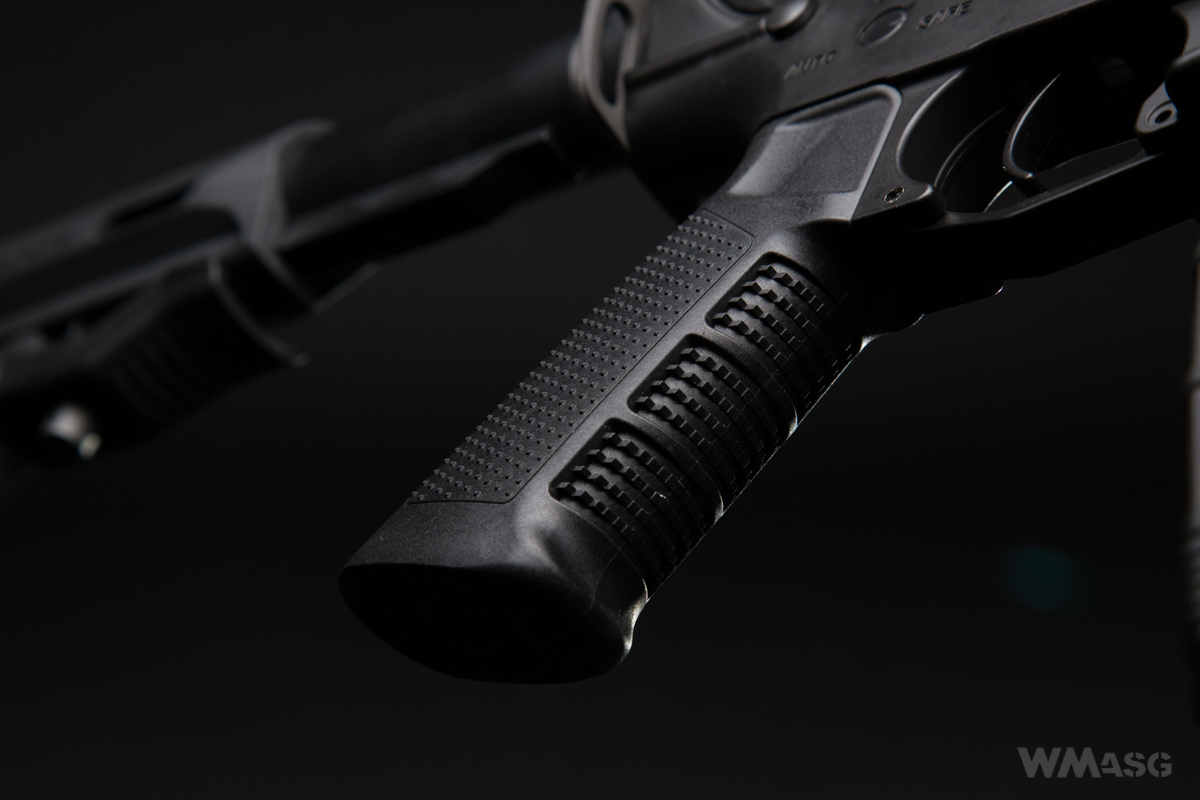 The carbine is distinguished by the pistol grip used as. It does not have a characteristic profile between the middle finger and the ring finger. At first glance, it looks similar to grips used in the first version of the M16 rifles. Its whole surface has a very distinct texture. The bottom of the grip is ribbed, fully openwork to facilitate better motor cooling. There is no spacing washer. It has glues threaded brass sleeves used for tightening the screws fixing the bottom plate. The motor adjustment is done with a 4 mm Allen key.