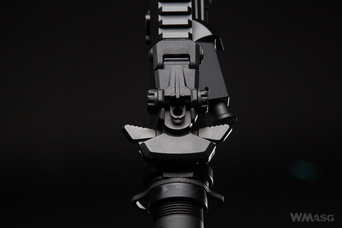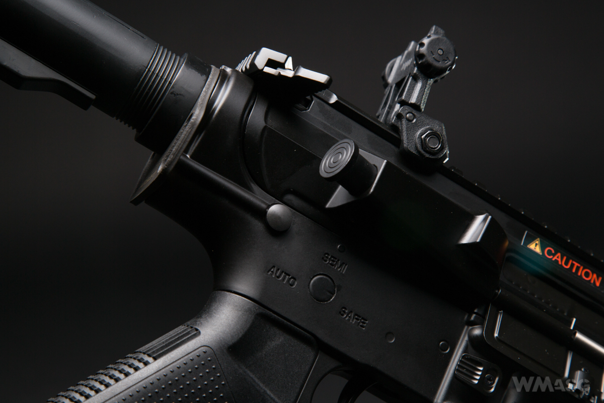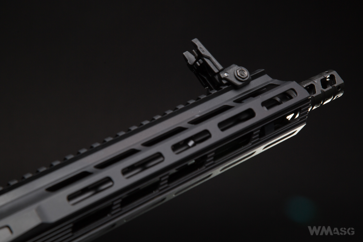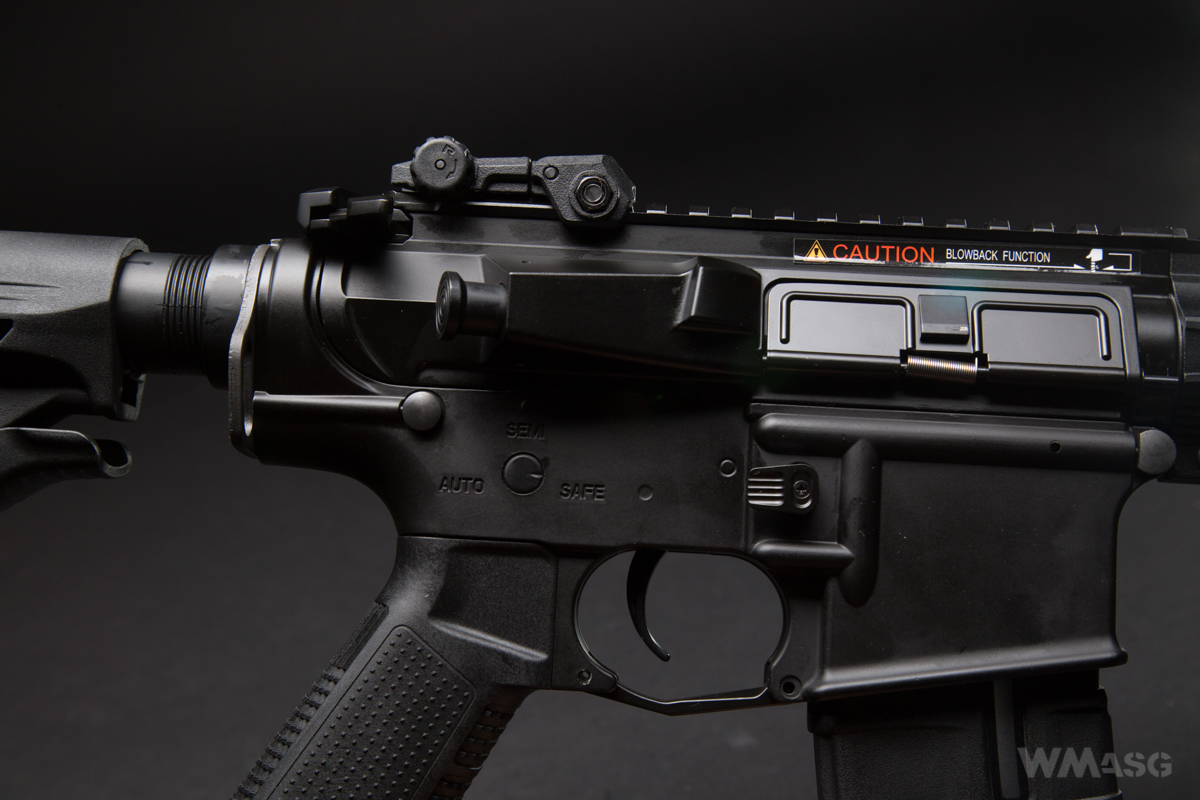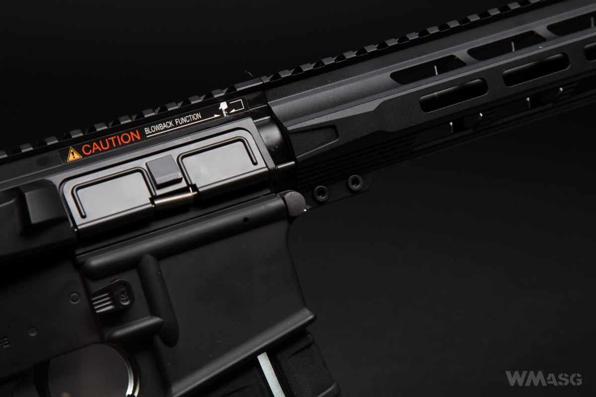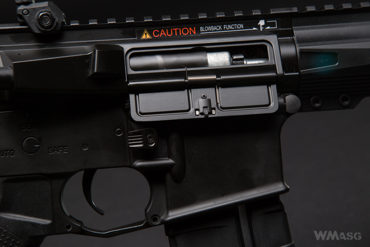 I have already written several times that MMRs are equipped with a mechanical blowback, meaning the dummy bolt carrier moves forward and back during shooting. The stroke of the bolt carrier is small, equal to approximately half the length of the ejection port. The system is not perfect and does not work in a manner that is 100% true to the real rifle. It happens, for example, that when we release the trigger when shooting in the full-auto mode, the dummy bolt carrier will stop in the middle of the ejection port. It results directly from the EBB design and does not obstruct anything. For those who will be bothered by this solution, it will be necessary to use an electronic control system that will force the piston to stop in the front position. Then the dummy bolt carrier will always remain closed.