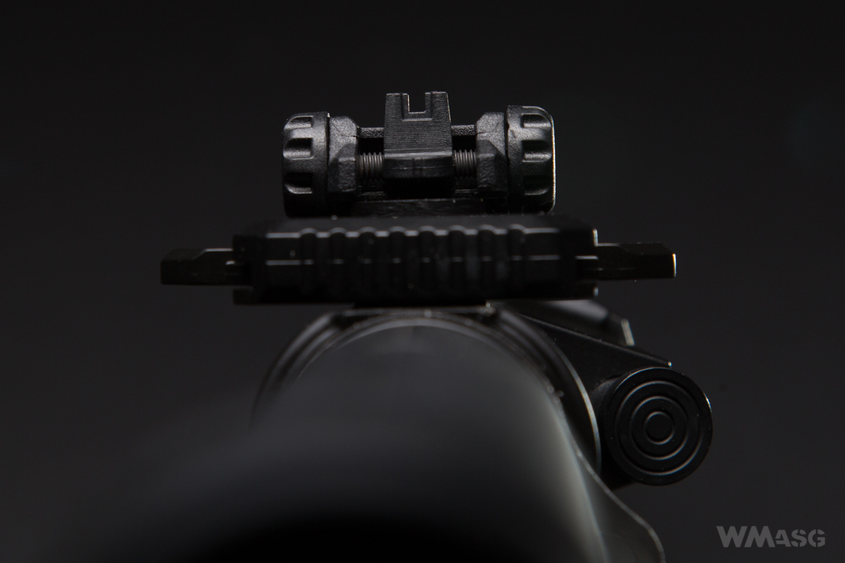 In the photo below you can see the access to Hop-Up adjustment. Unfortunately, the dummy bolt carrier does not lock in the rear position therefore, during the adjustment, it is necessary to hold the charging handle back. While shooting, the dummy bolt carrier moves together with the piston moving inside the cylinder (the EBB system).