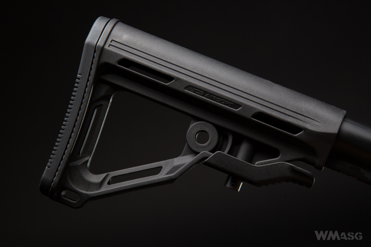 The short SBR model has a collapsible MTR type stock. It is made of reinforced nylon polymer. It has several options for attaching the carrying sling, including 2 QD sockets (one on each side). Noteworthy is the inverted lever, which is used to move the stock on the guide.
