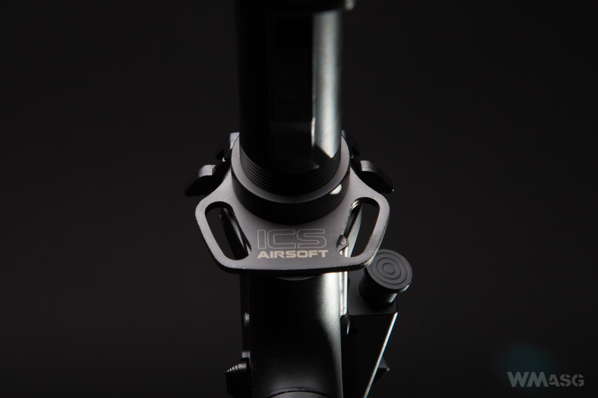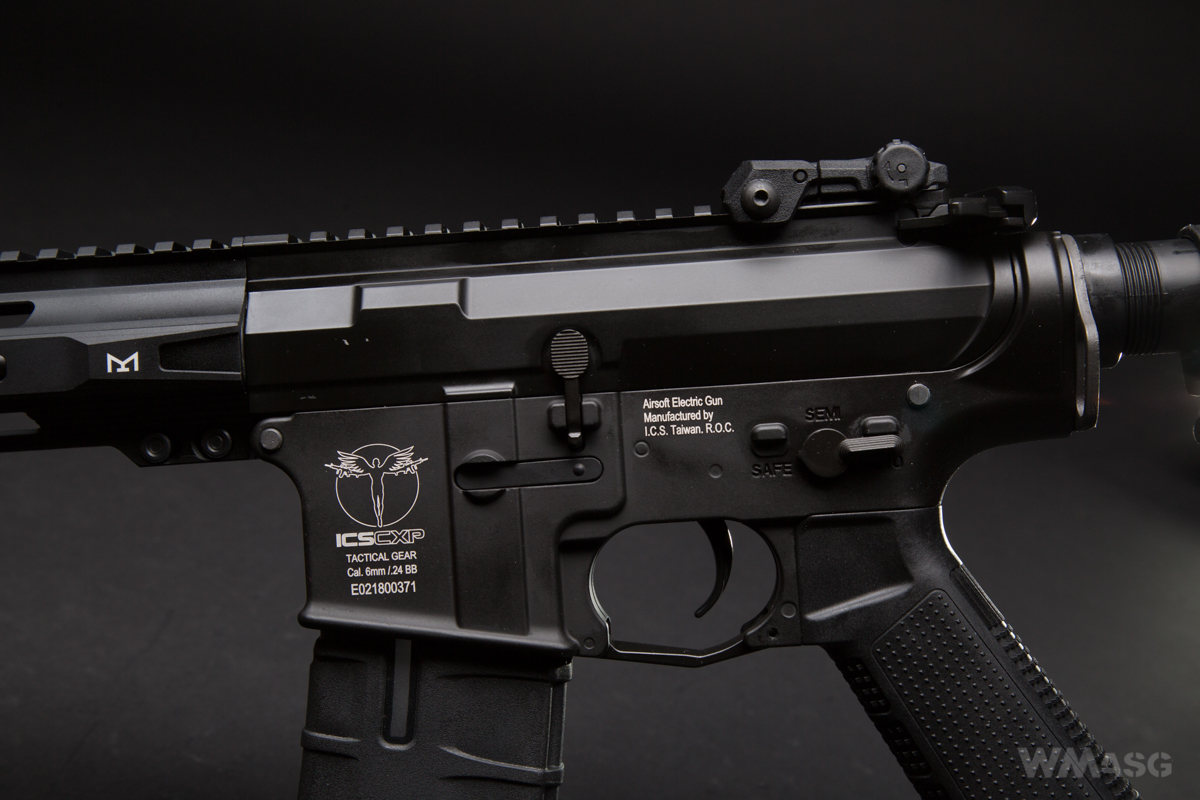 The receiver is made of metal. The lower receivers is standard and has no modern reinforcements, improvements or quirks. The upper receiver is modeled on the VLTOR MUR design. Its angular and massive. Attention is drawn to the prominent forward assist housing integrated with the deflector, visible in the photo above. Unlike many other ICS replicas, the forward assist is fake as it does not have the function of releasing the spring. Apart from the charging handle, all manipulators are one-sided. The dummy bolt catch is slightly prolonged due to the shape of the upper receiver.
