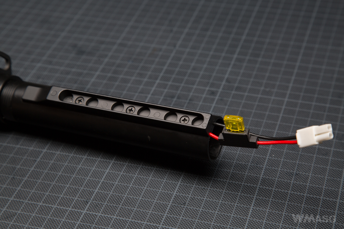 Both buttstocks are mounted on a standard guide designed in an interesting way. The wires are routed in special channels and protected against damage. An additional benefit if this design is more space for the battery inside the guide. An 11.1 V 1400 mAh LiPo battery with dimensions of 21 x 20 x 130 mm can be easily fitted there.