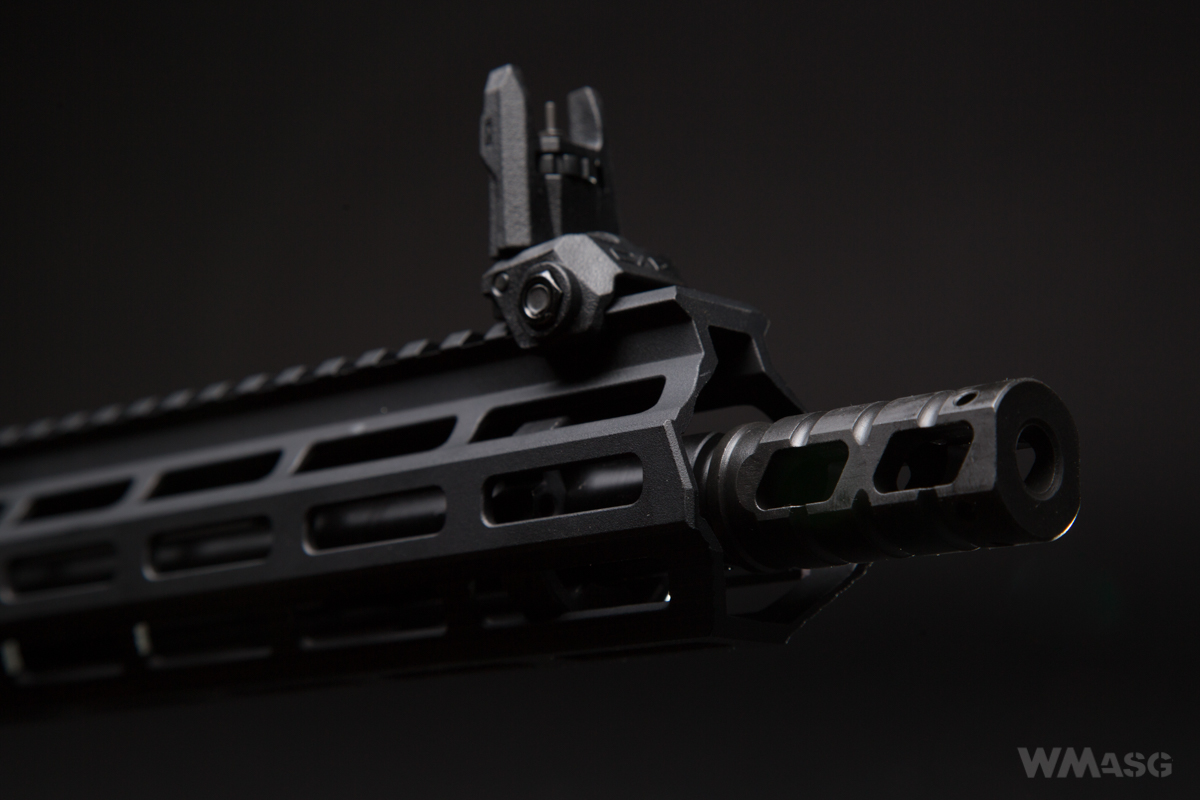 The barrel made of 2 metal parts. The connection is stiff and there are no clearances. There is no dummy gas block nor a gas tube. The barrel ends with a 14 mm counterclockwise thread and a flash hider called Raider.