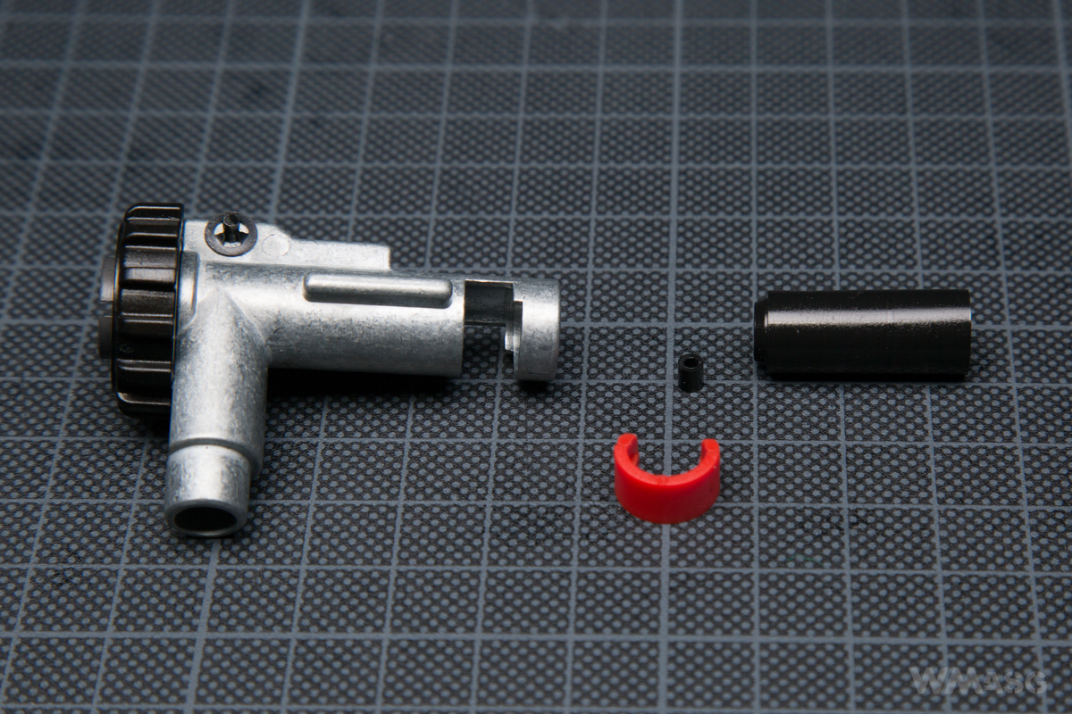HopUp chamber chamber is made out of a single piece aluminum alloy, with the adjustment knob placed around the barrel axis. By turning the adjusting ring downwards, we increase the HopUp and turning it upwards we reduce it. The bucking and the spacer are standard.