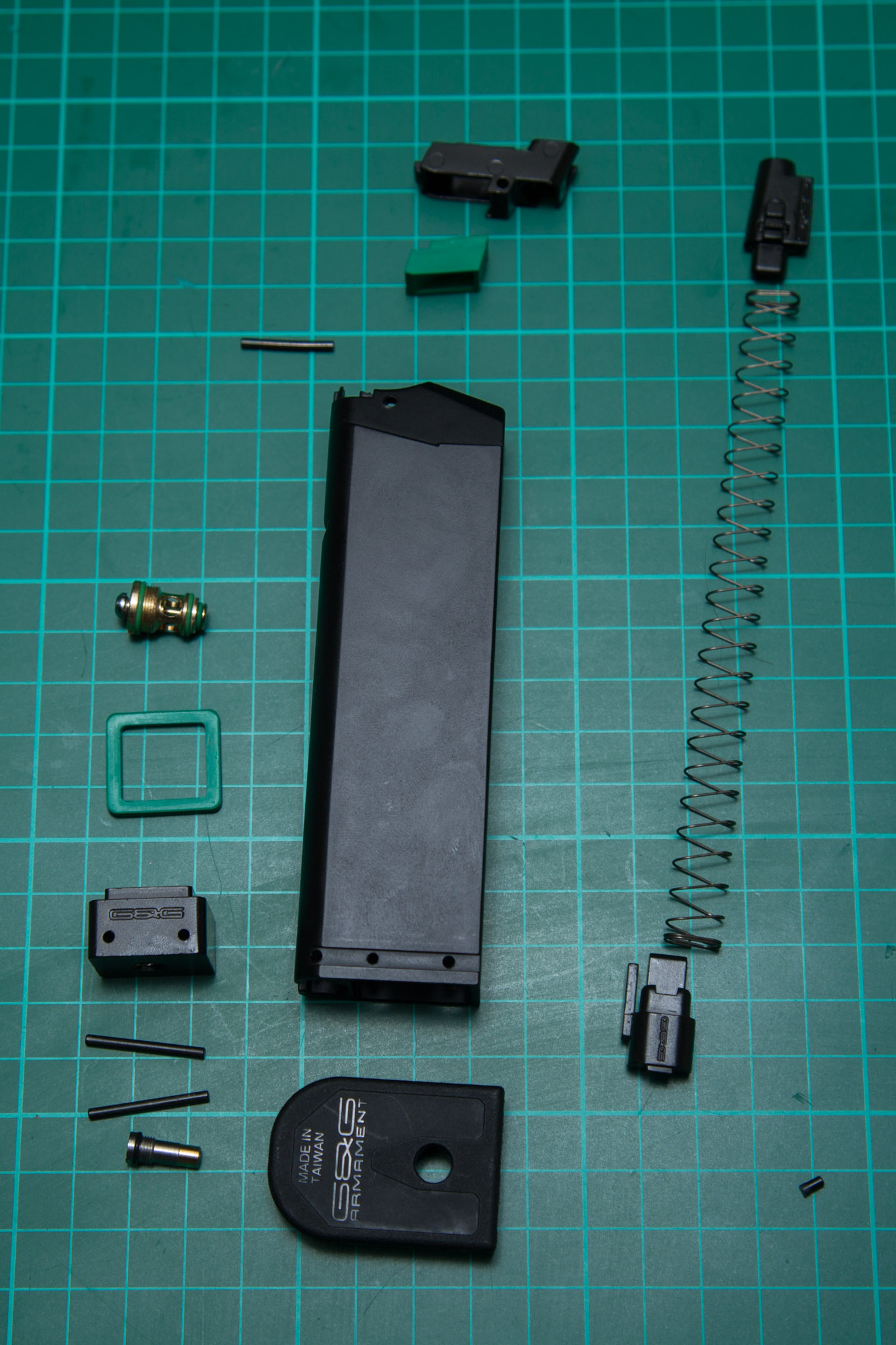 In the Internet, you can find information about the gas filter being placed inside the magazine. Unfortunately, we were unable to identify it. We noticed, however, that all of the gaskets, including valve gaskets, are made of green rubber, which resembles material used for the production of well known green G&G Hop-Up bucking.