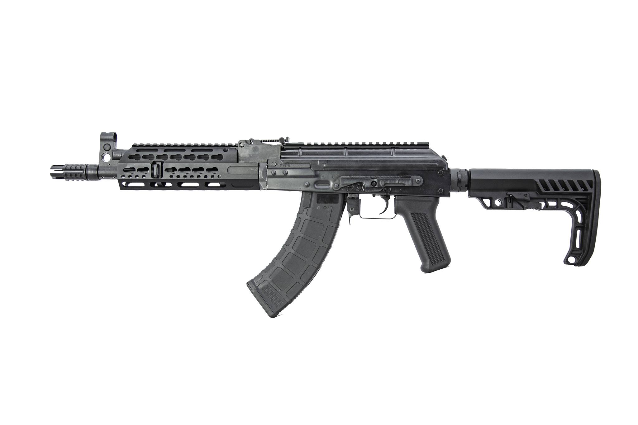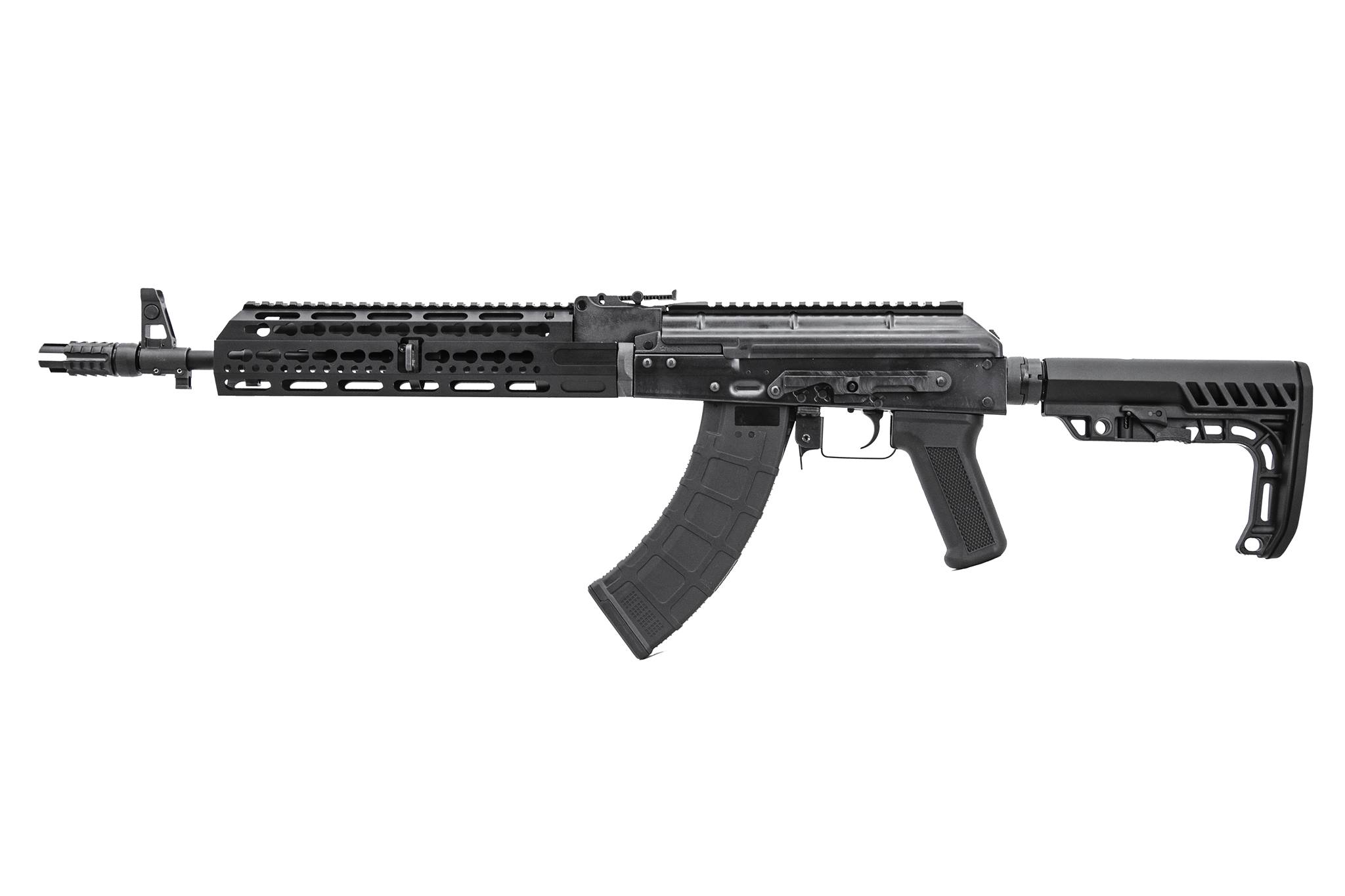 A characteristic feature of the replicas are the receivers and receiver covers which are stamped from steel sheets and telescopic butt stocks made in the AR-15 standard. In addition, the rifles have side mounting rails in AK standard on the left side of the receiver and Picatinny rails on the receiver cover.