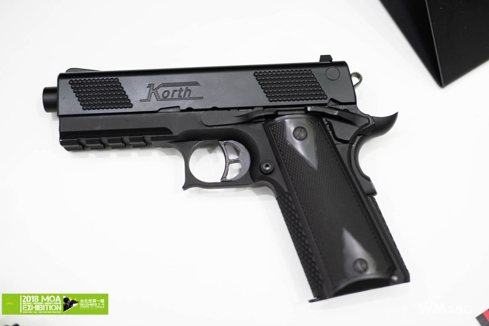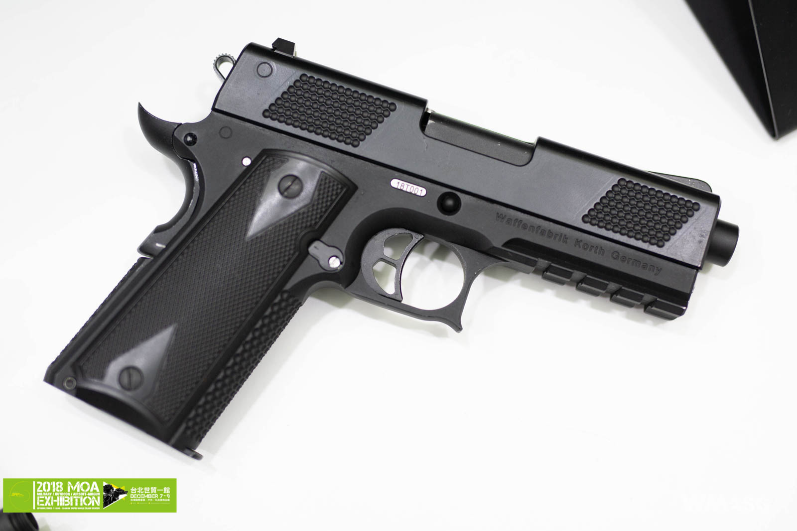 A licensed replica of the Korth PRS 4" pistol. Both the original and the GBB version have the grip and safety designed in the same way as the Colt 1911. Even the side panels are interchangeable.
