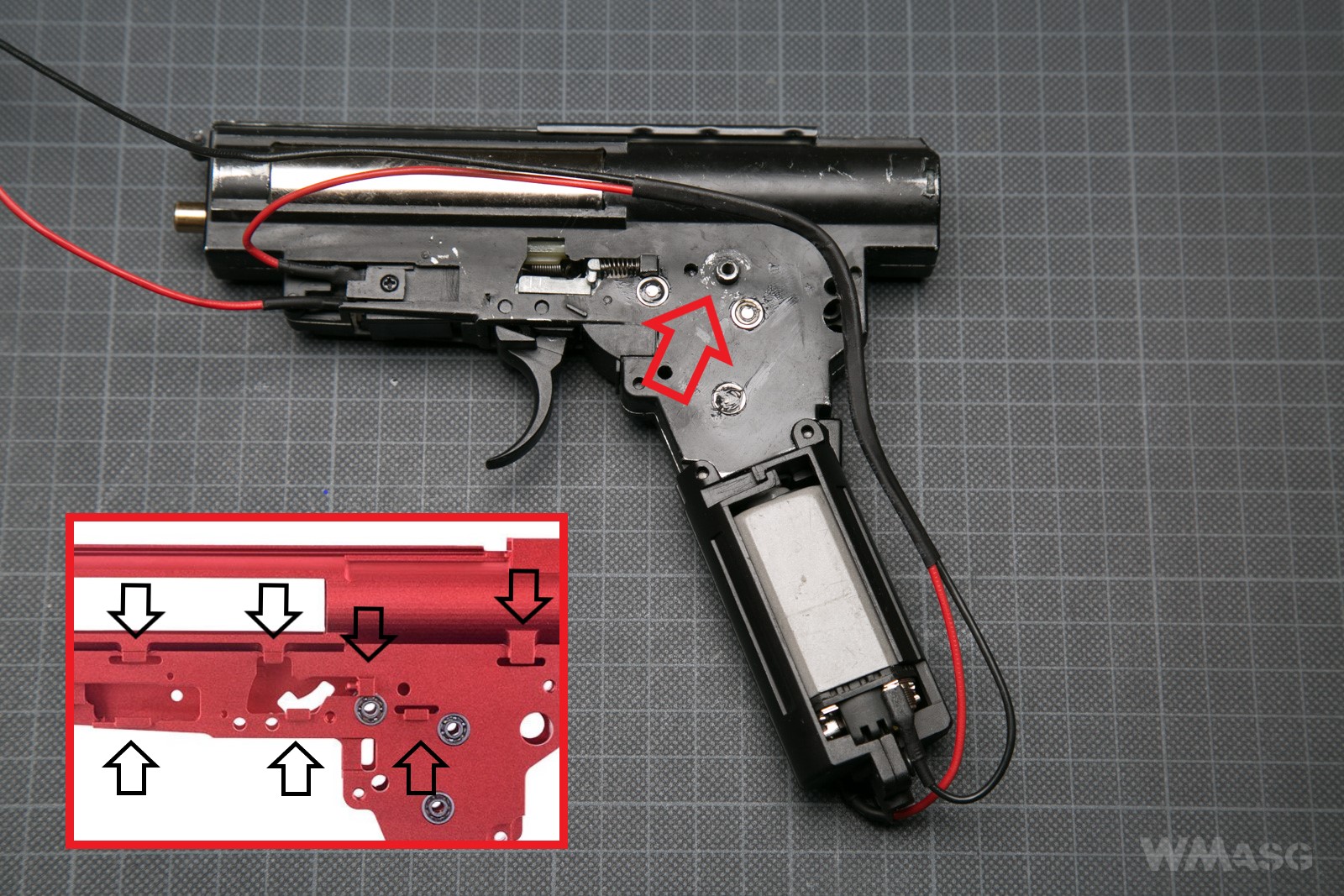 Po drugiej stronie nie ma prowadnic płytki selektora (czarne strzałki na miniaturce), której w Spectre po prostu nie ma. Jest za to jest mocowanie skrzydełka selektora ognia (czerwona strzałka).