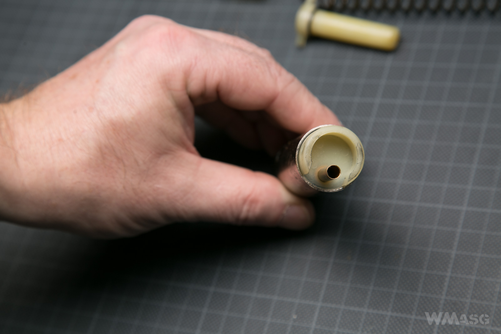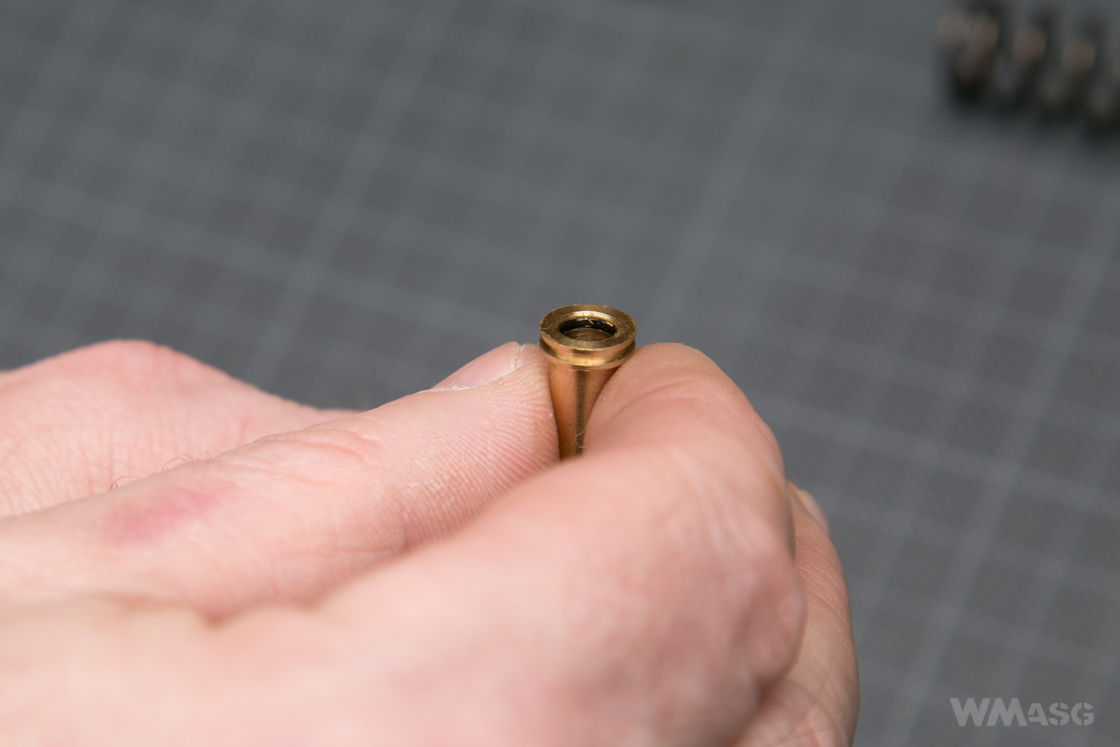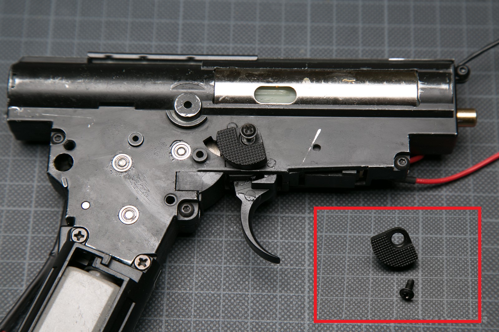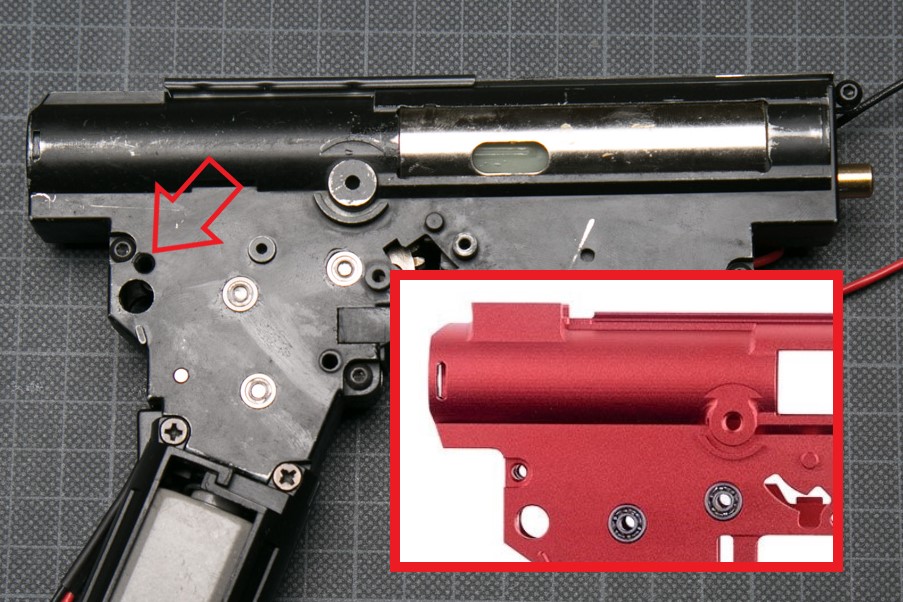 Kolejna różnica to dodatkowy otwór w szkielecie Spectre, przez który przechodzi kołek ustalający pozycję gearboxa w korpusie repliki.