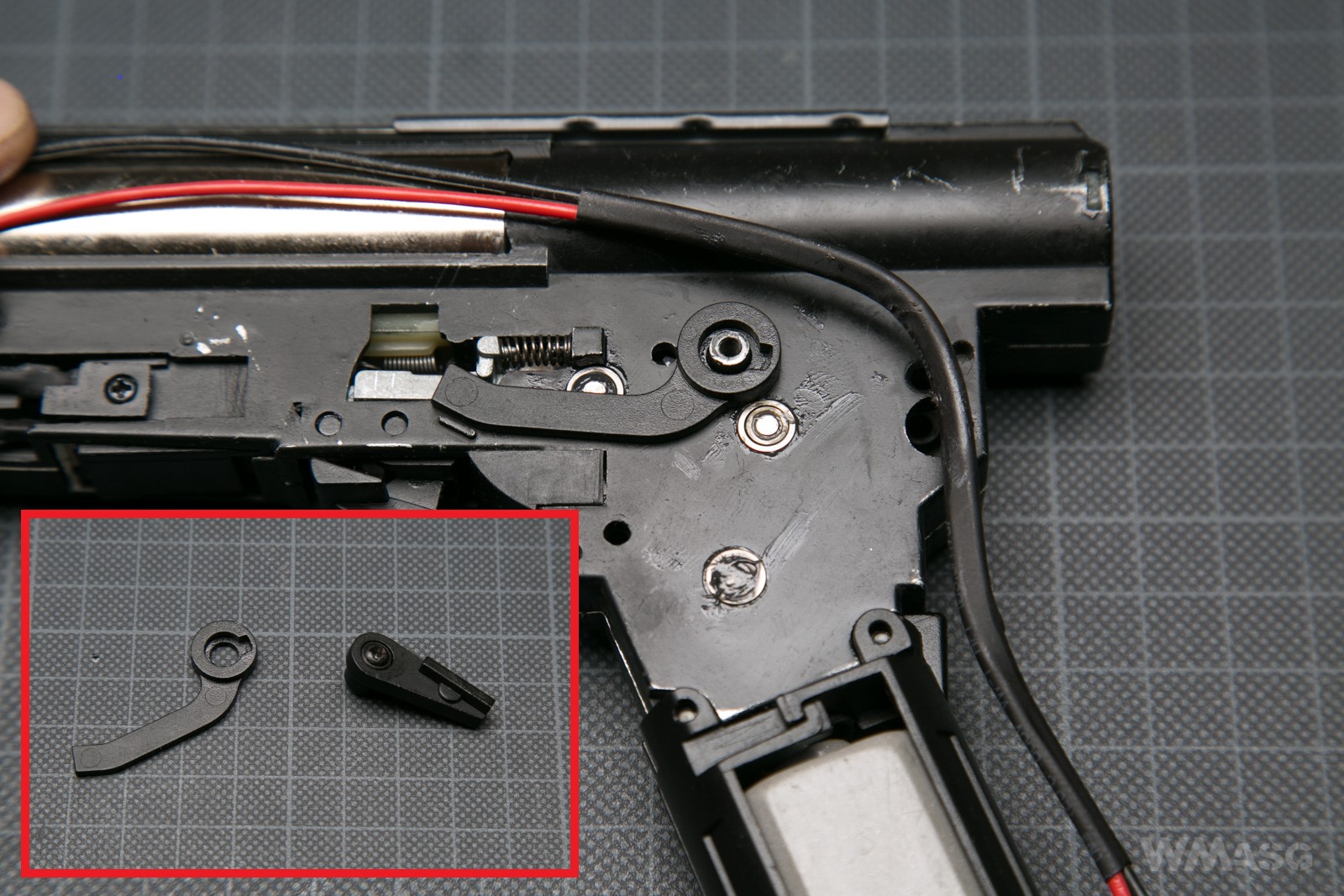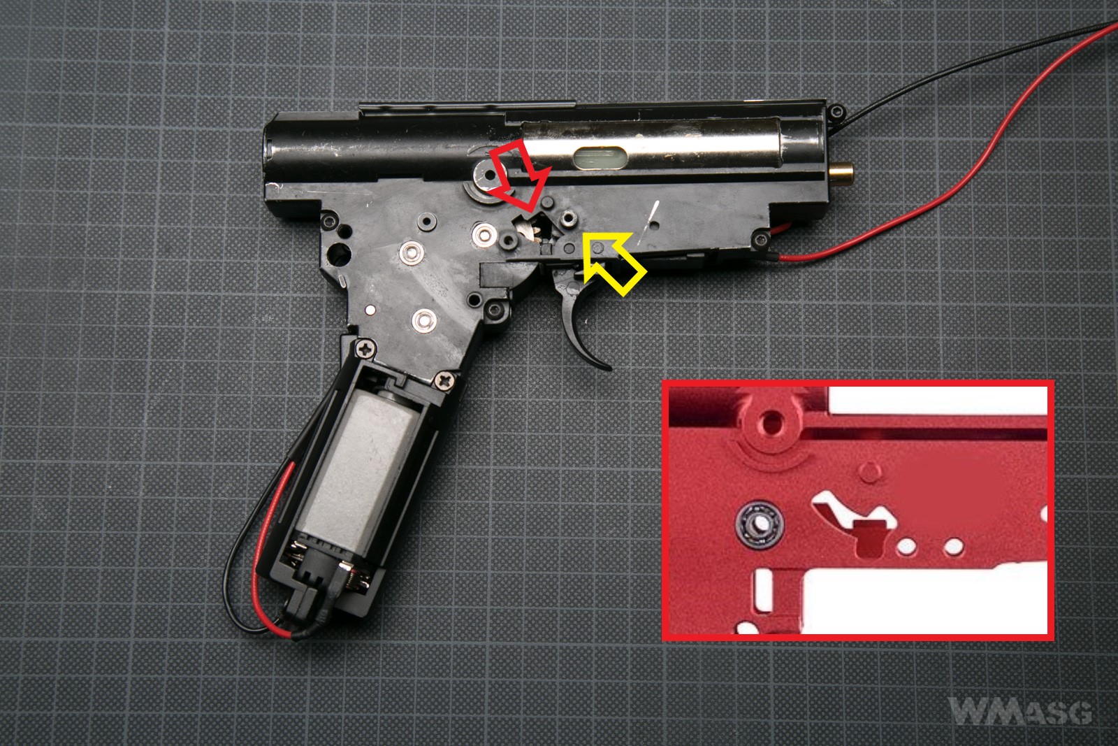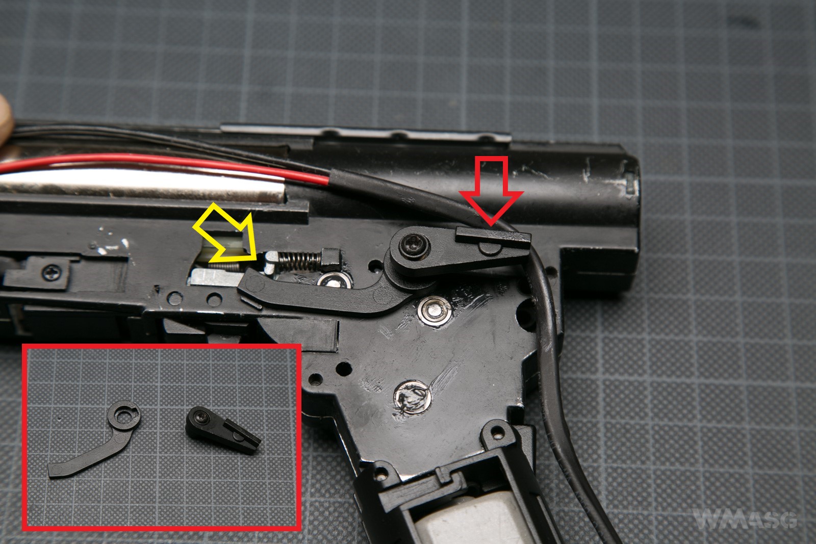 Opuszczenie skrzydełka selektora (czerwona strzałka) powoduje ruch ramienia do góry i podniesienie przerywacza (żółta strzałka) - replika strzela ogniem ciągłym.