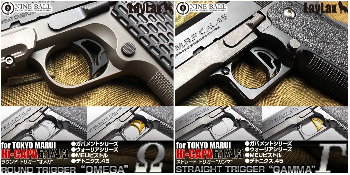 The concave one is called "Omega" and the straight one is called "Gamma". Both are made of CNC machined high-quality aluminum. Below is the original HiCapa 5.1 by Tokyo Marui (photo: TM).